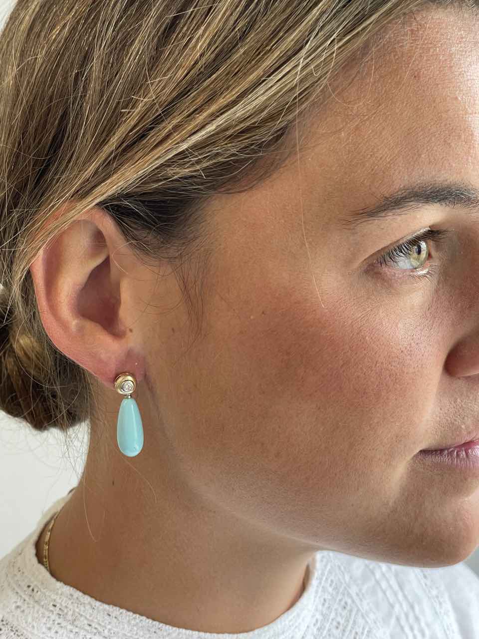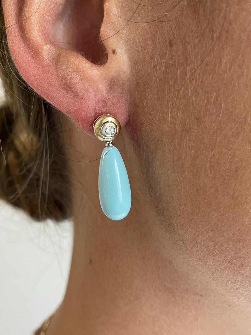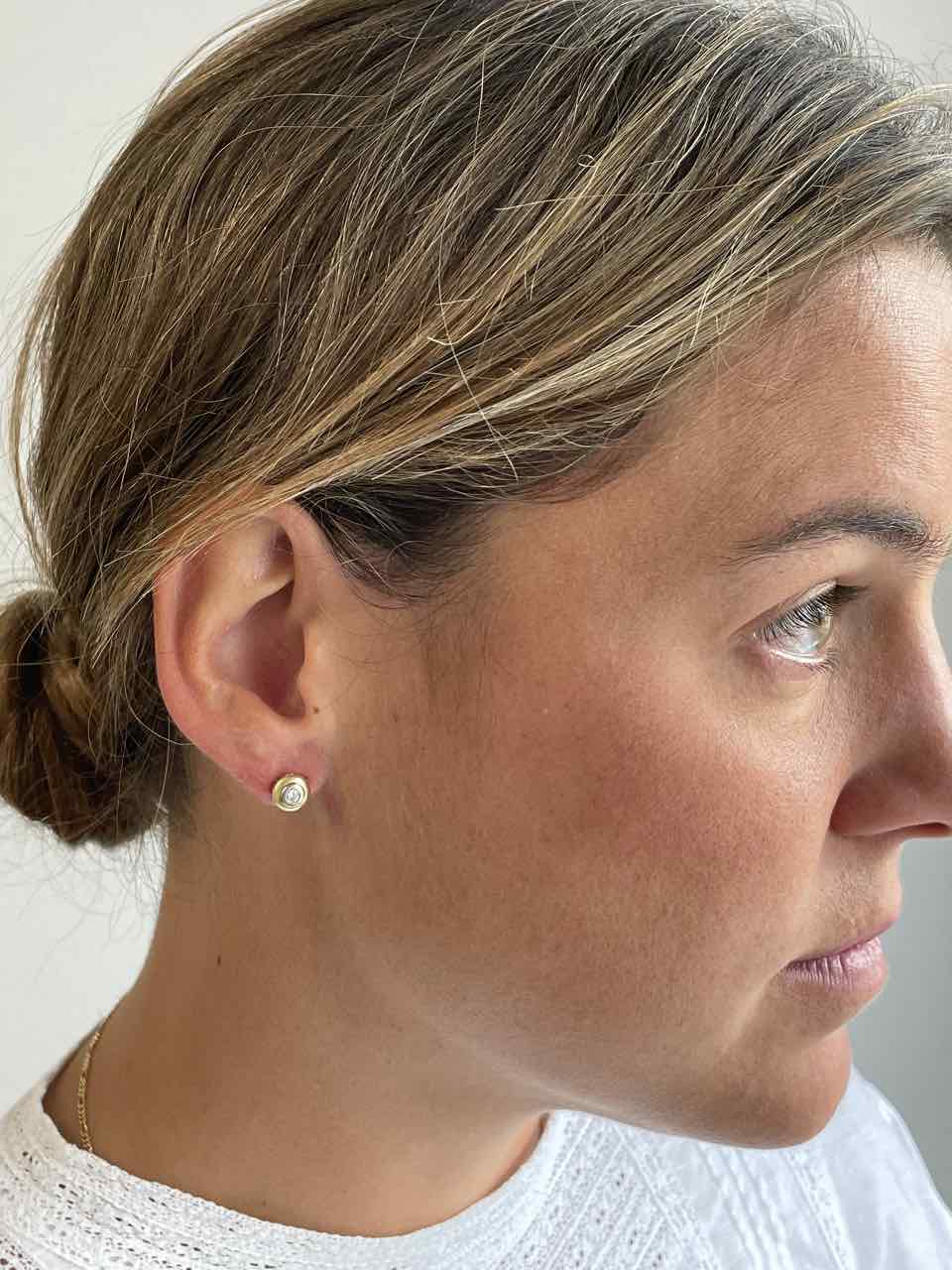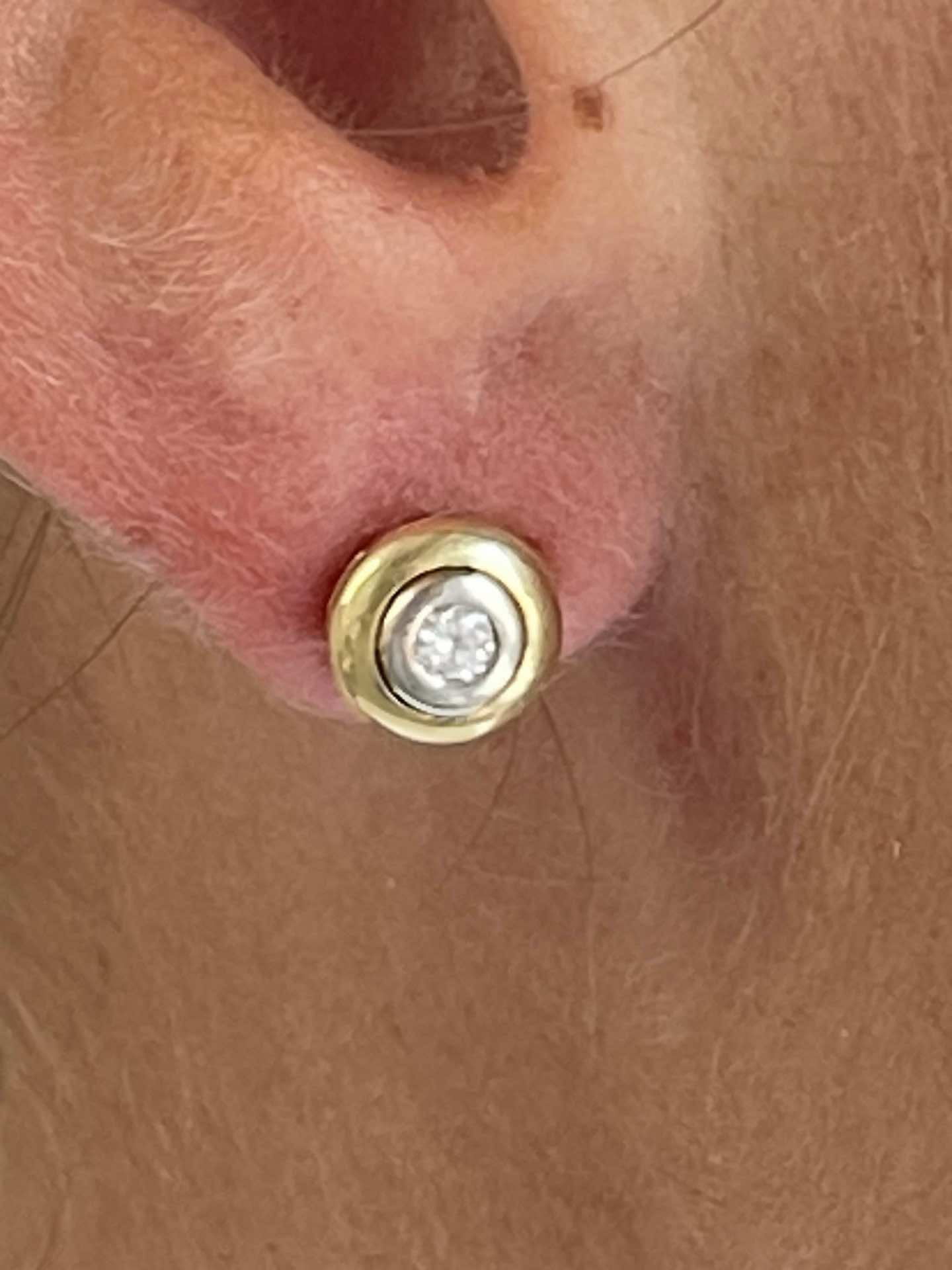 HORNA are bezel-set earrings with brilliant -cut diamonds , crafted in 18k yellow and white gold. They feature detachable systems for attaching accessories.