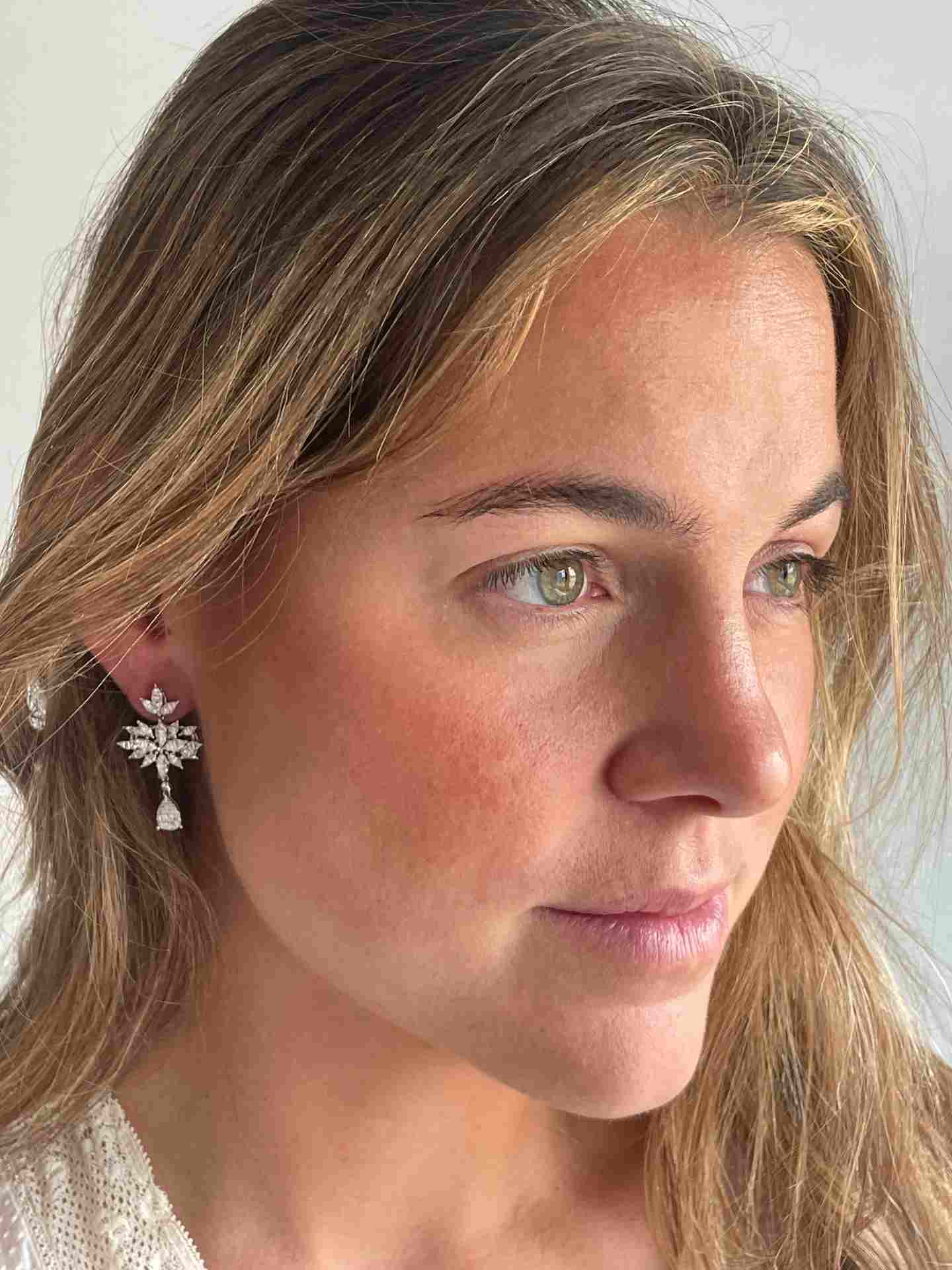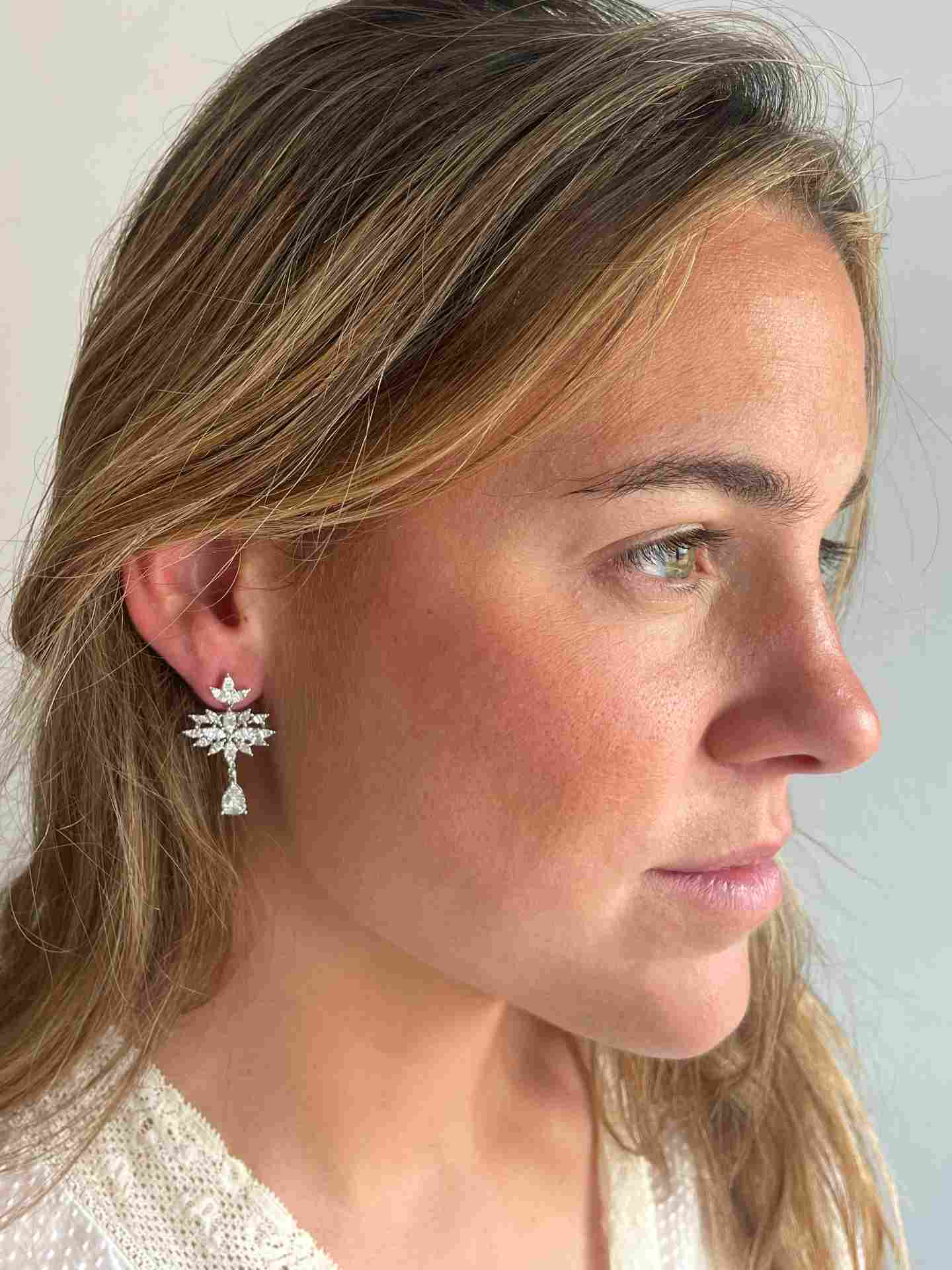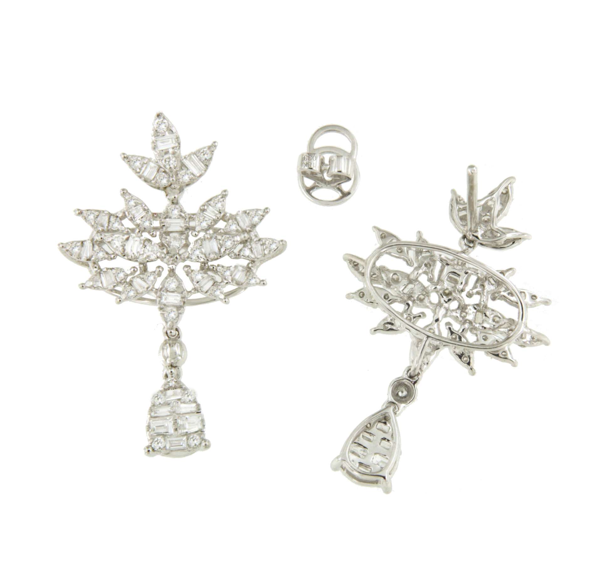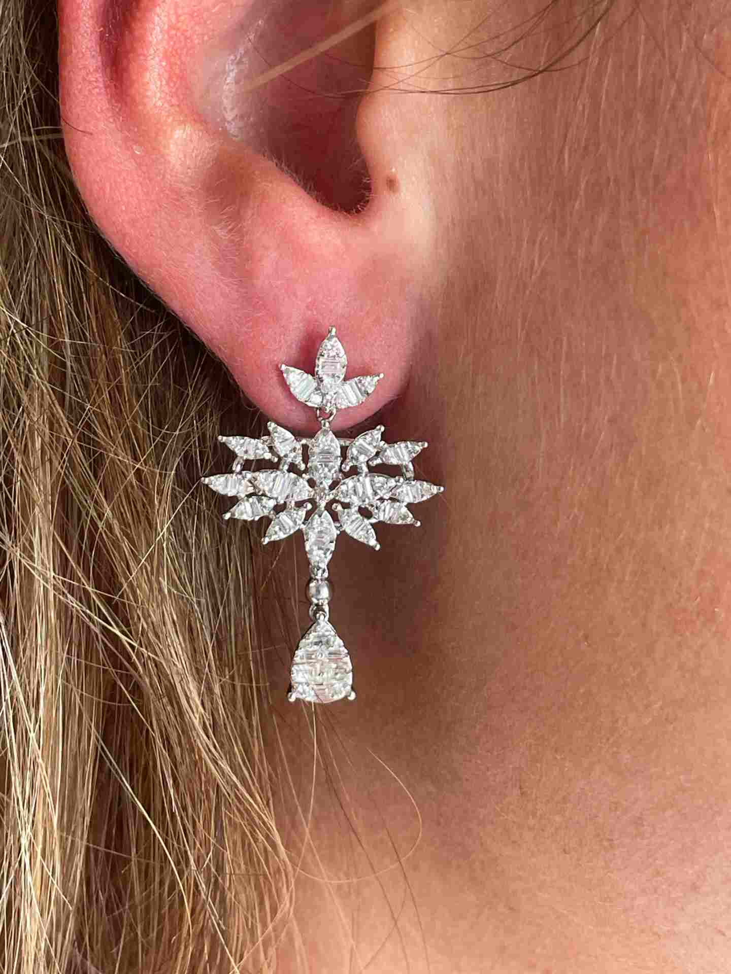 HORTELANO is a white gold earring with diamonds of different cuts , baguettes and brilliants that form a spectacular earring with grouped leaves from which hangs a pear in brilliant.
