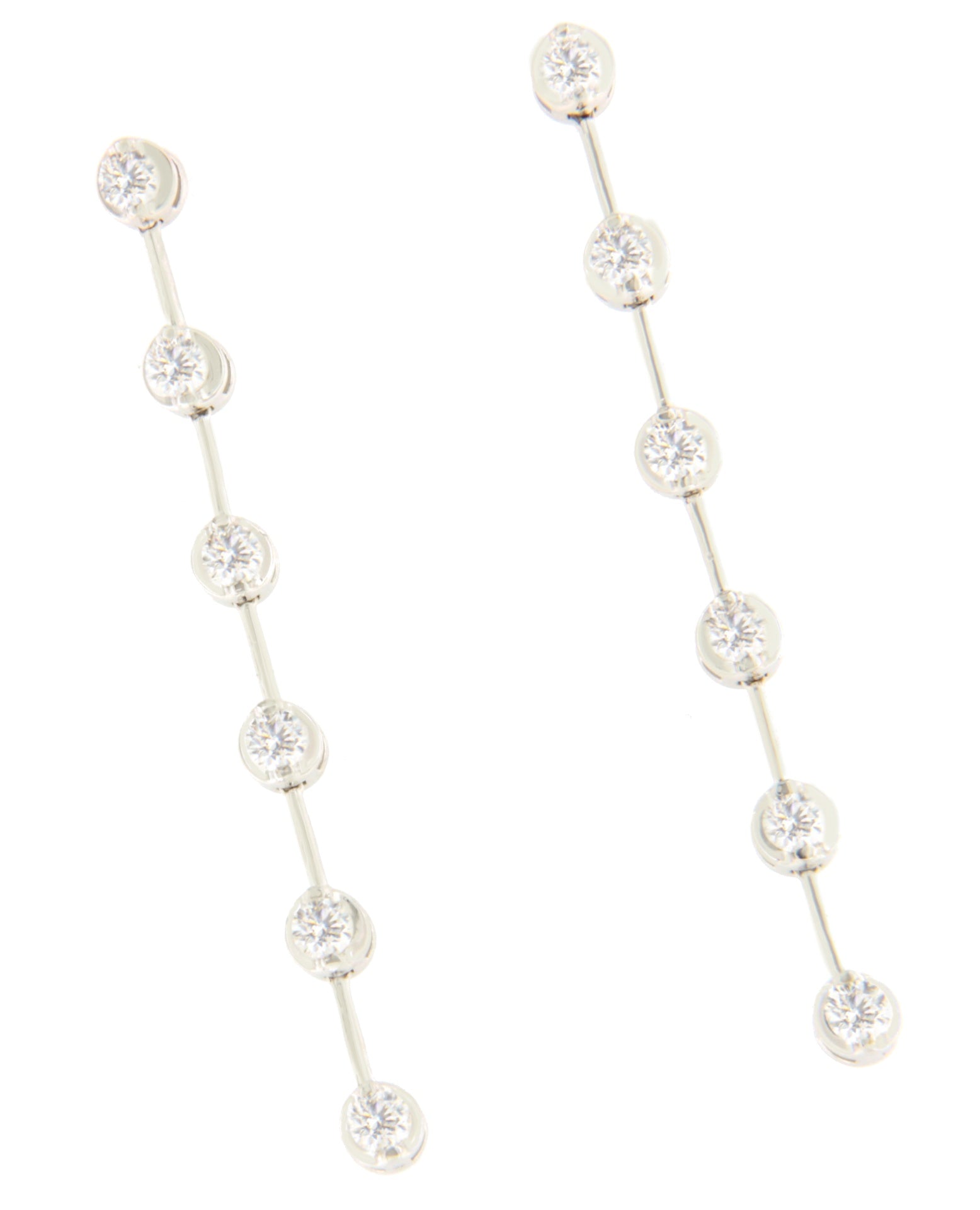 KEI are long earrings with dangling diamonds , spaced apart by a thin bar. They are crafted in 18-karat white gold. Gorgeous for brides!