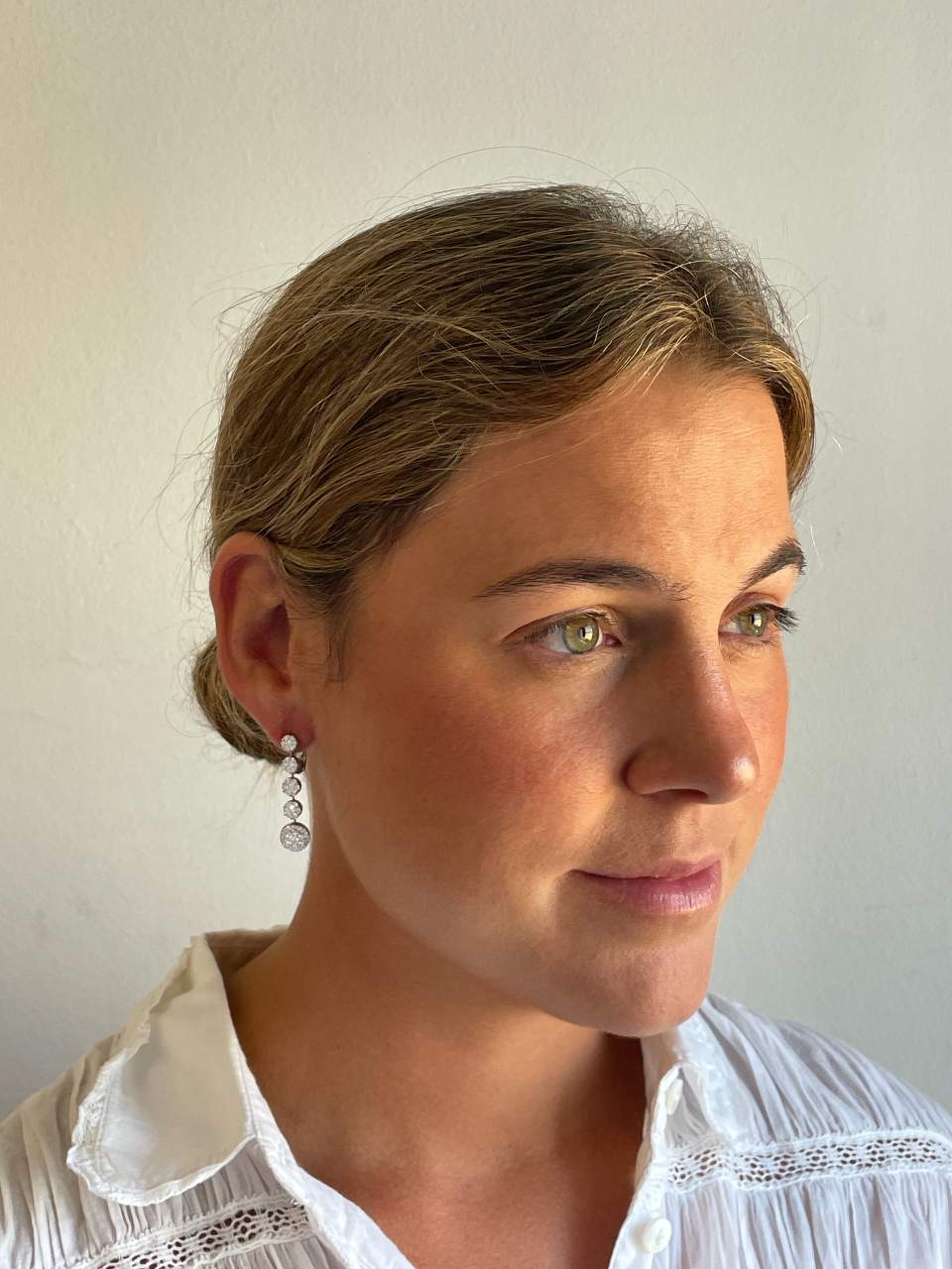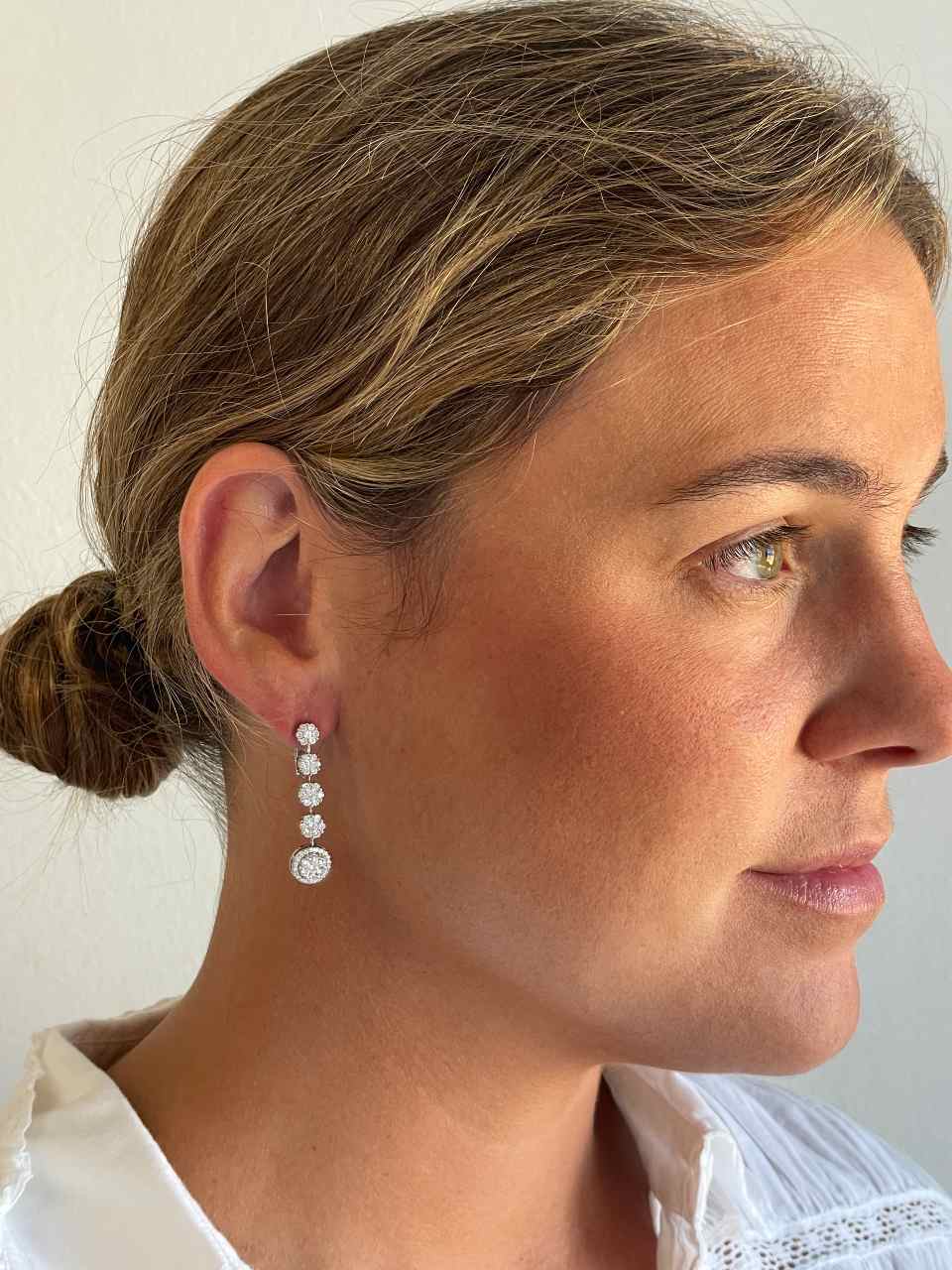 KIMBERLEY long 18k white gold earring with diamond rosettes.