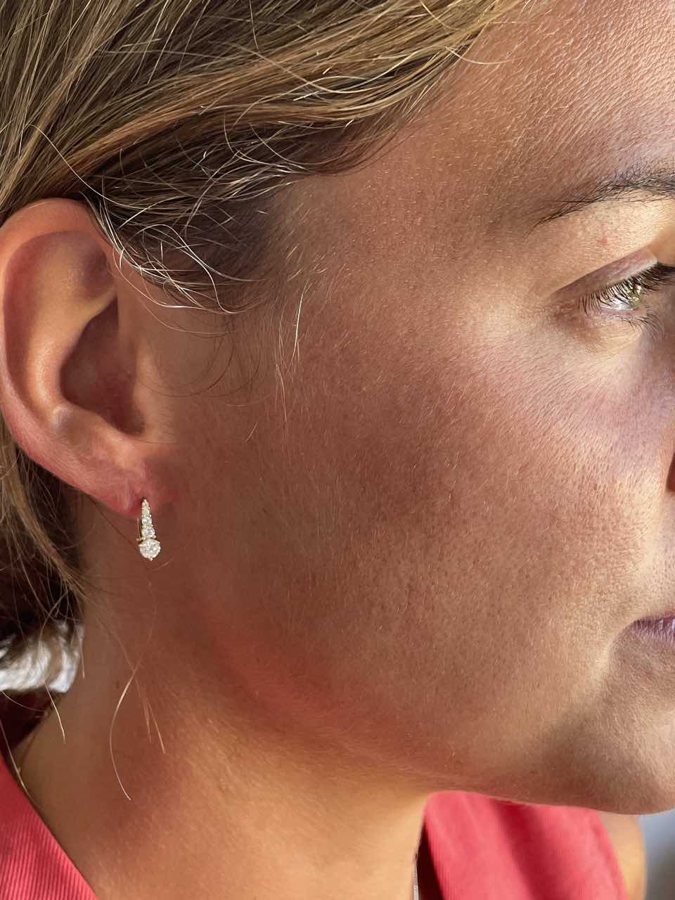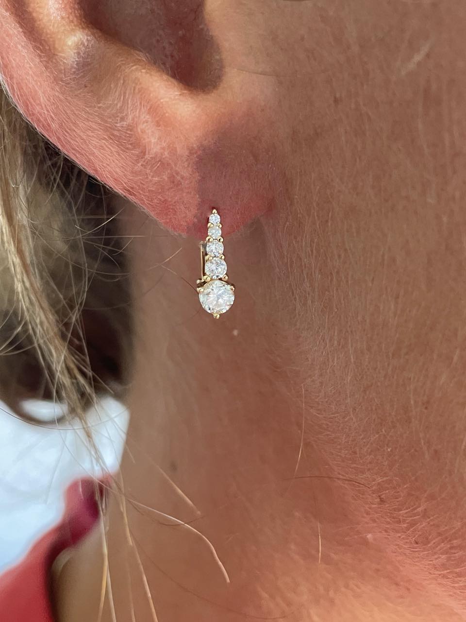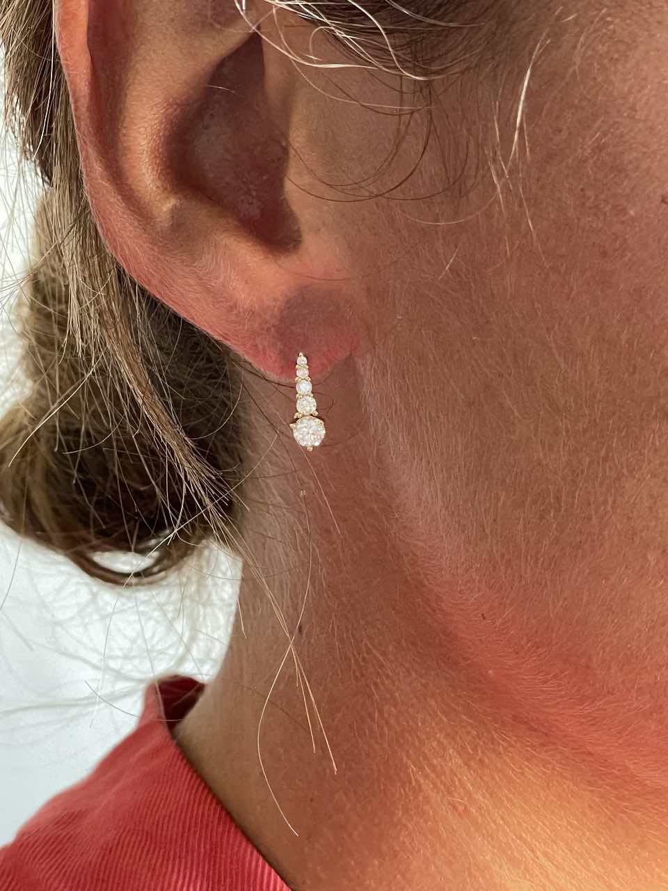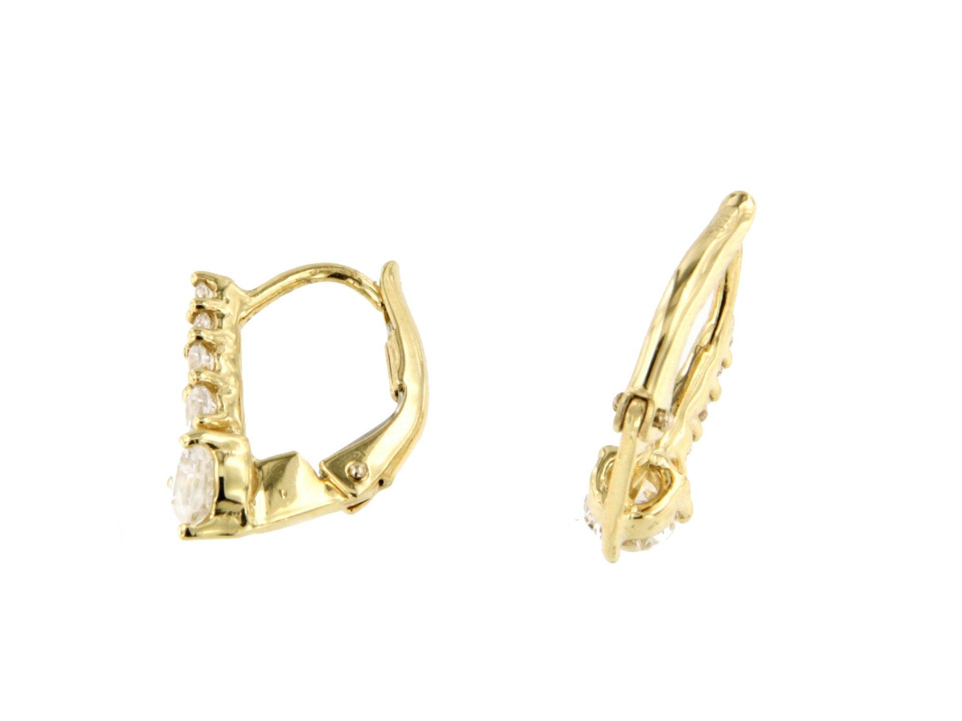 LAGOS are short earrings with cubic zirconia stones of varying sizes set in claws , on an 18k yellow gold mount. Catalan lever clasp closure.