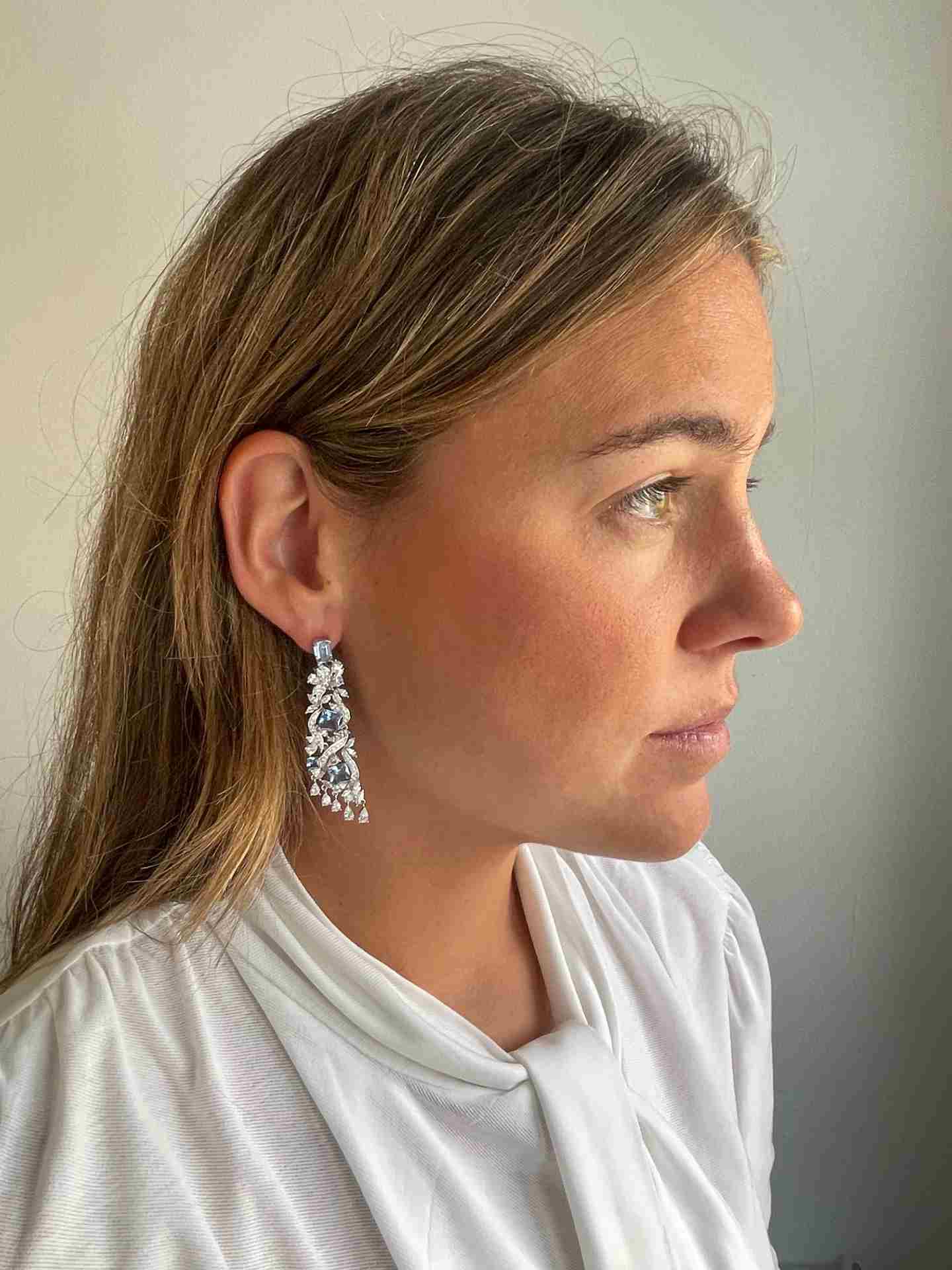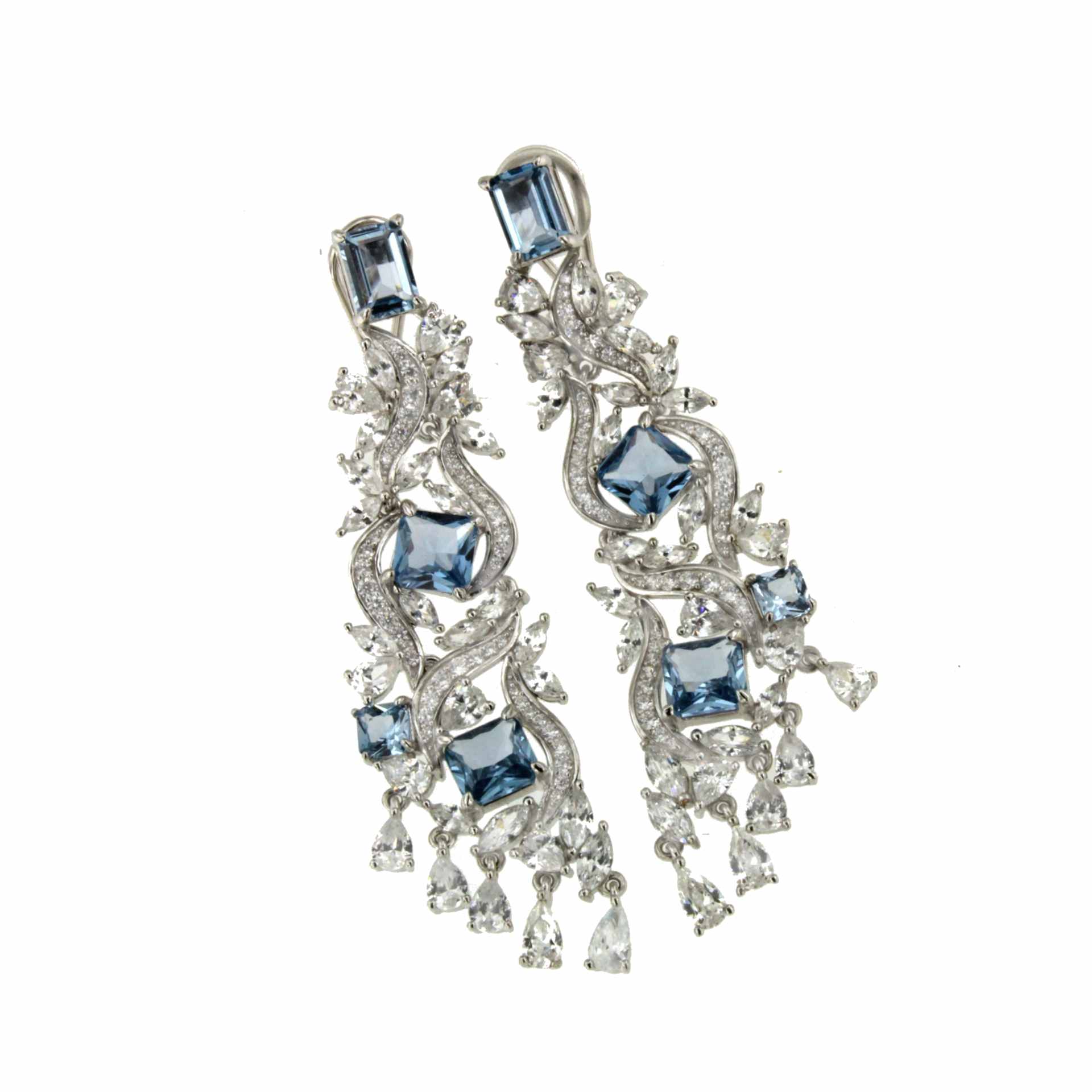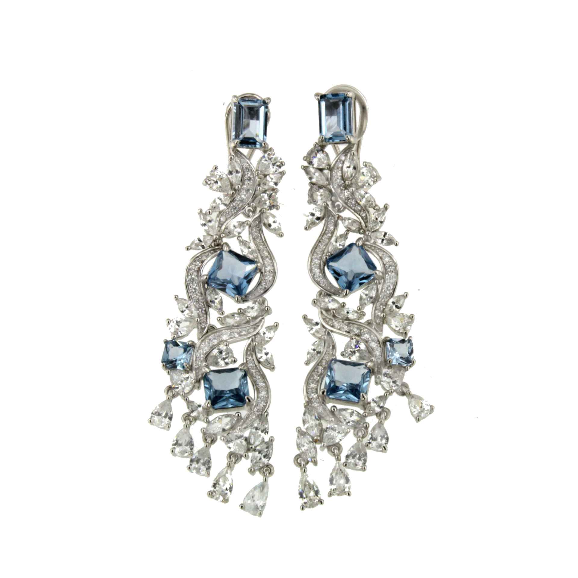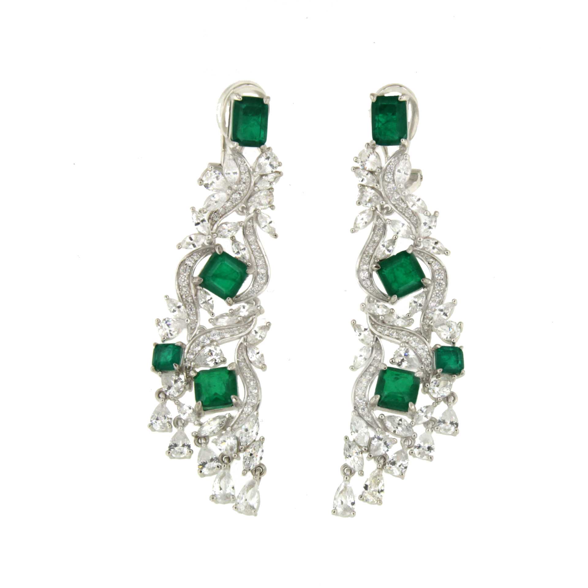 PANCHA , beautiful long earrings for parties , weddings, anniversaries, or celebrations. Made of 925 sterling silver with cubic zirconia and quartz stones in emerald or aquamarine .