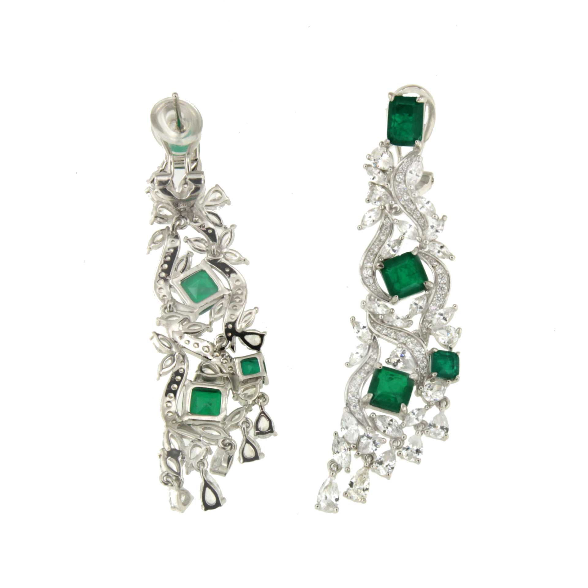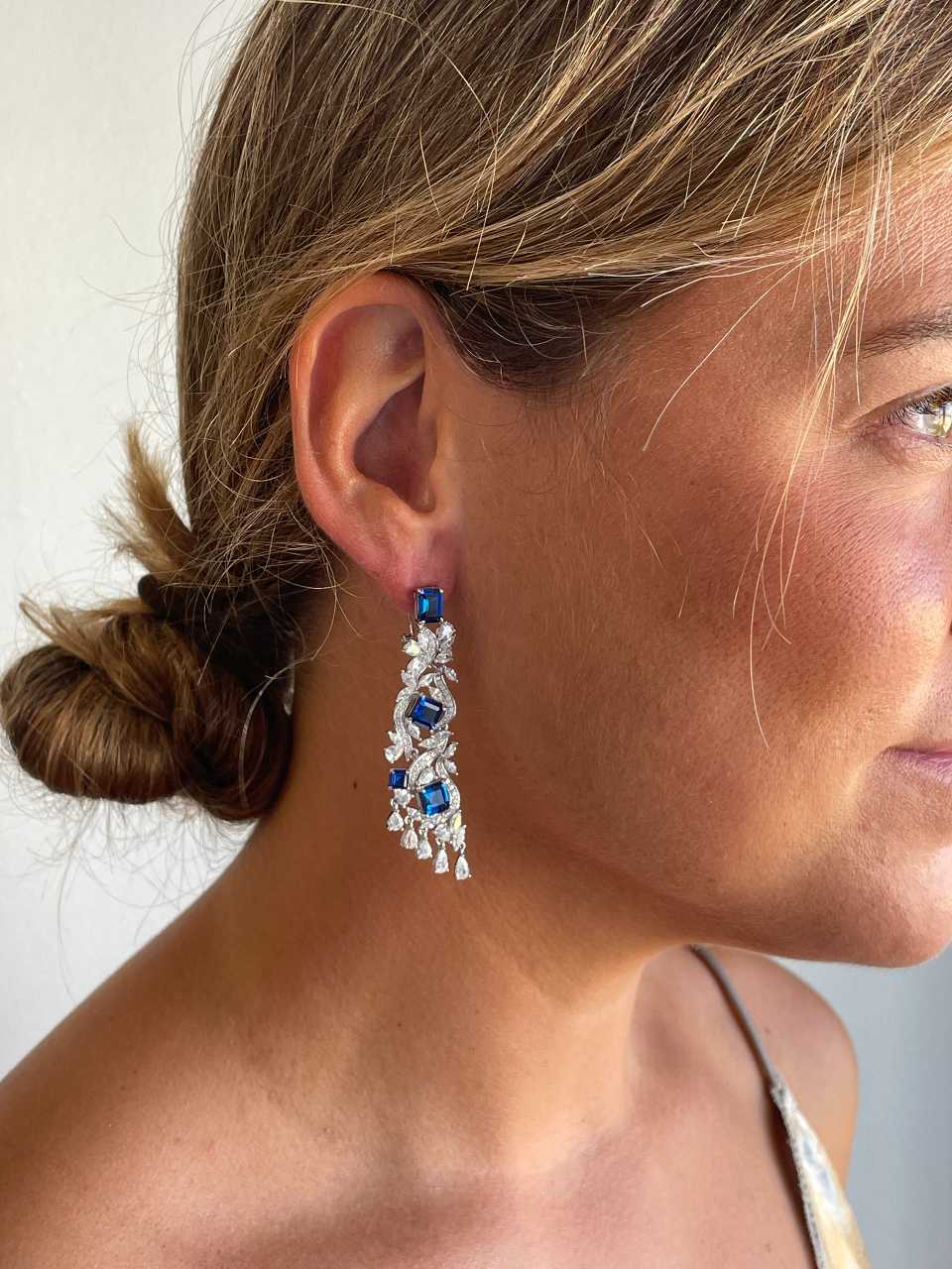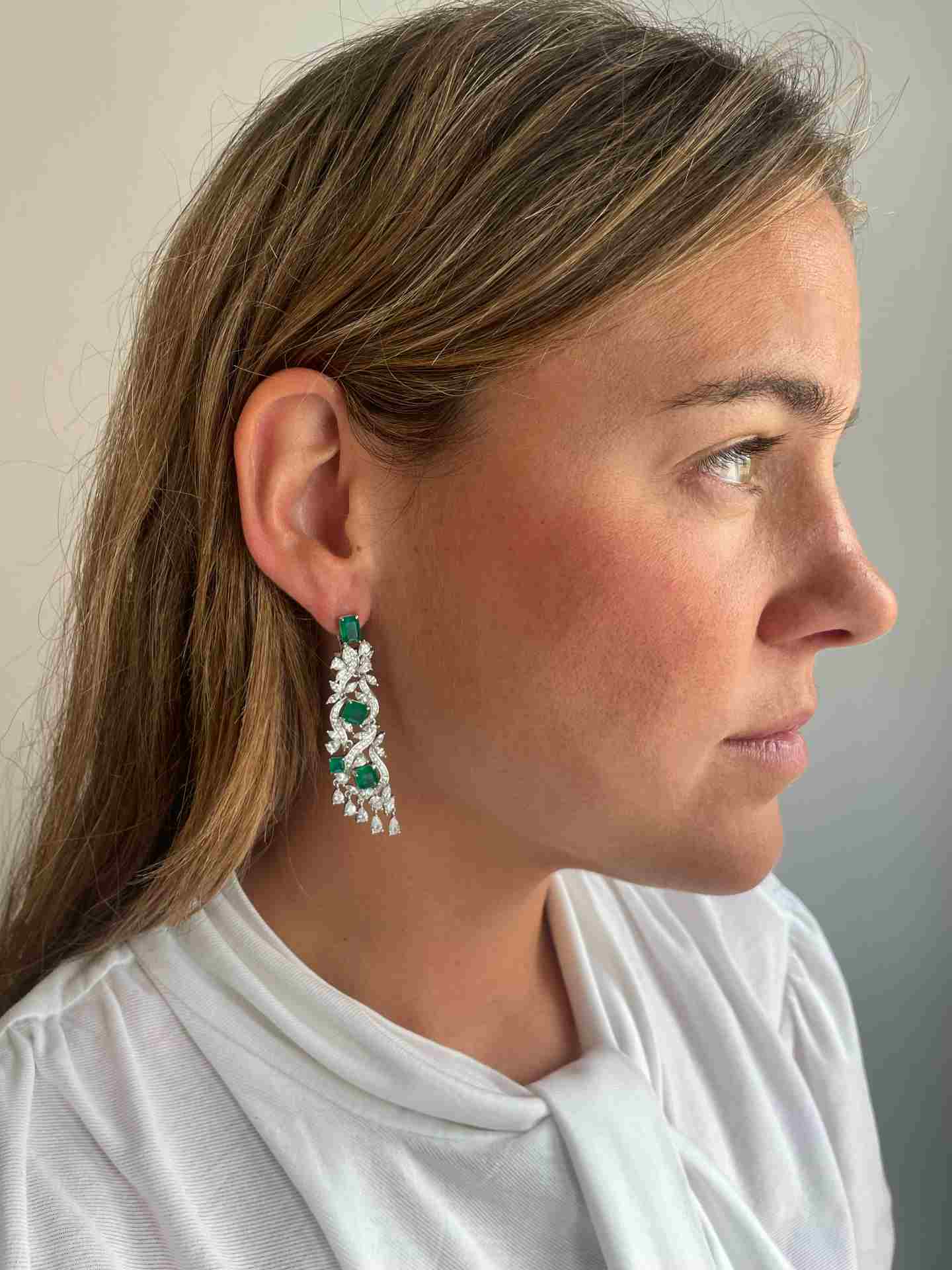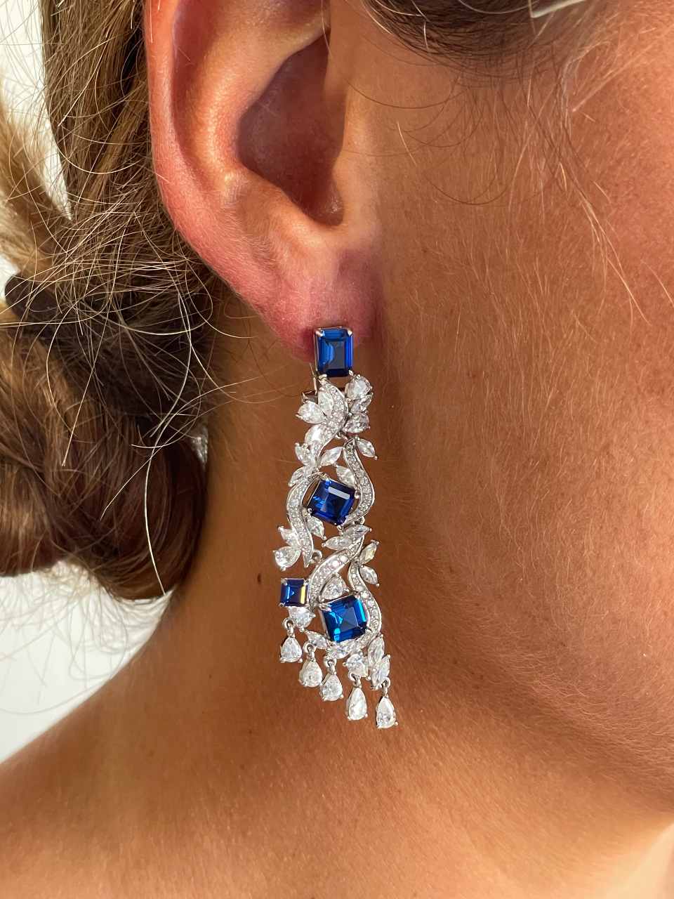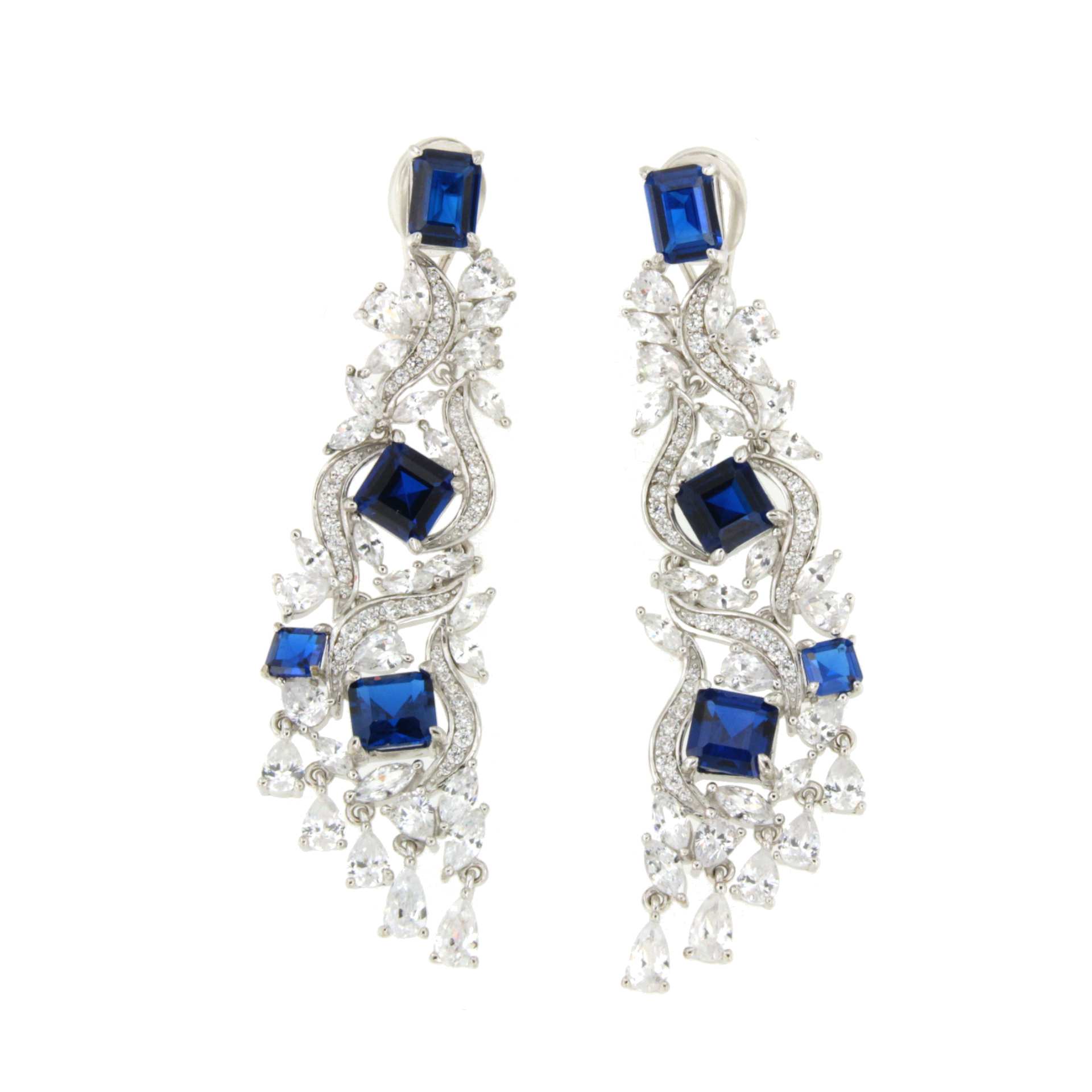PANCHA , beautiful long earrings for parties , weddings, anniversaries, or celebrations. Made of 925 sterling silver with cubic zirconia and quartz stones in emerald or aquamarine .
