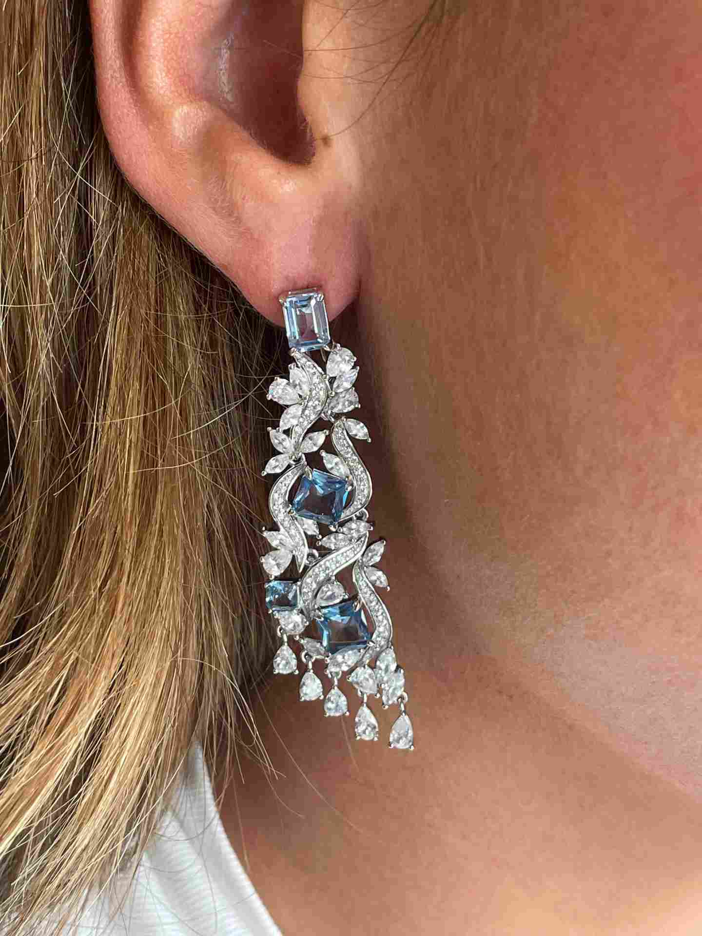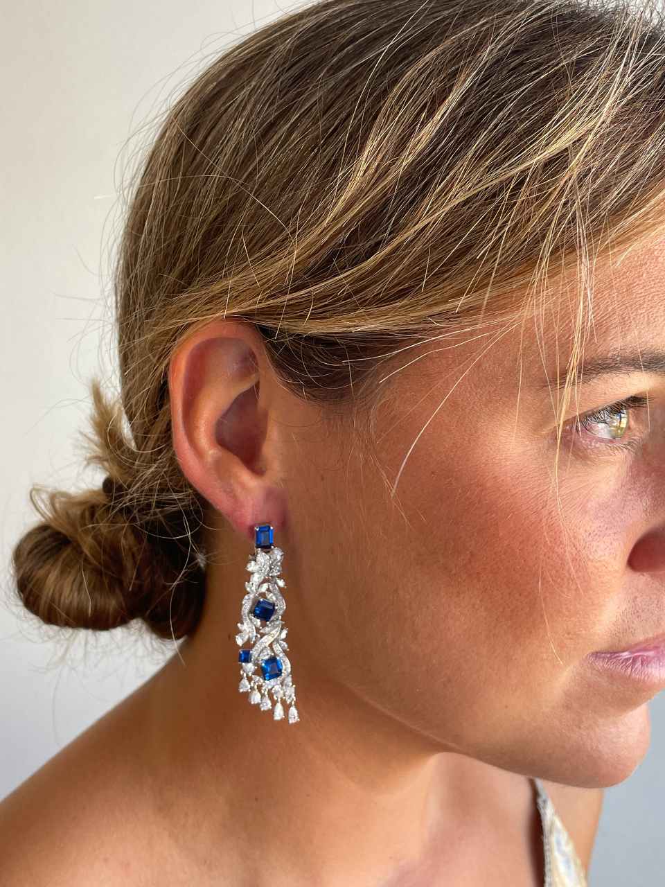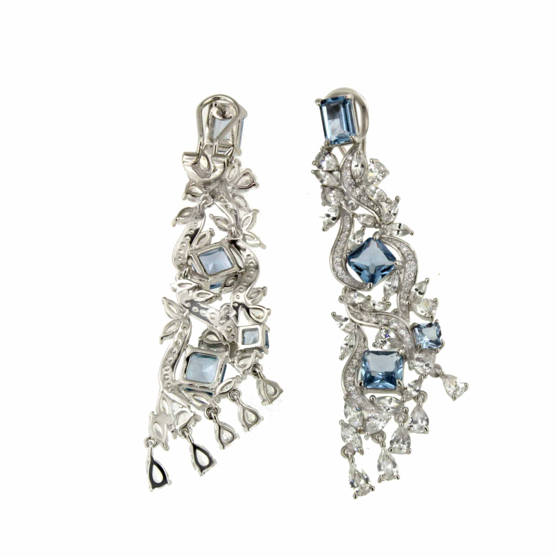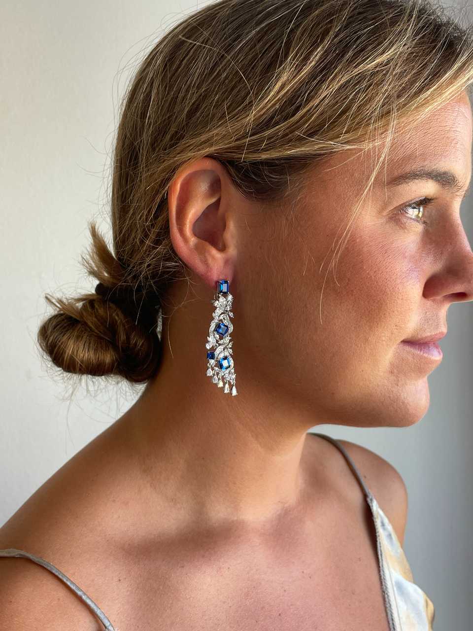 PANCHA , beautiful long earrings for parties , weddings, anniversaries, or celebrations. Made of 925 sterling silver with cubic zirconia and quartz stones in emerald or aquamarine .
