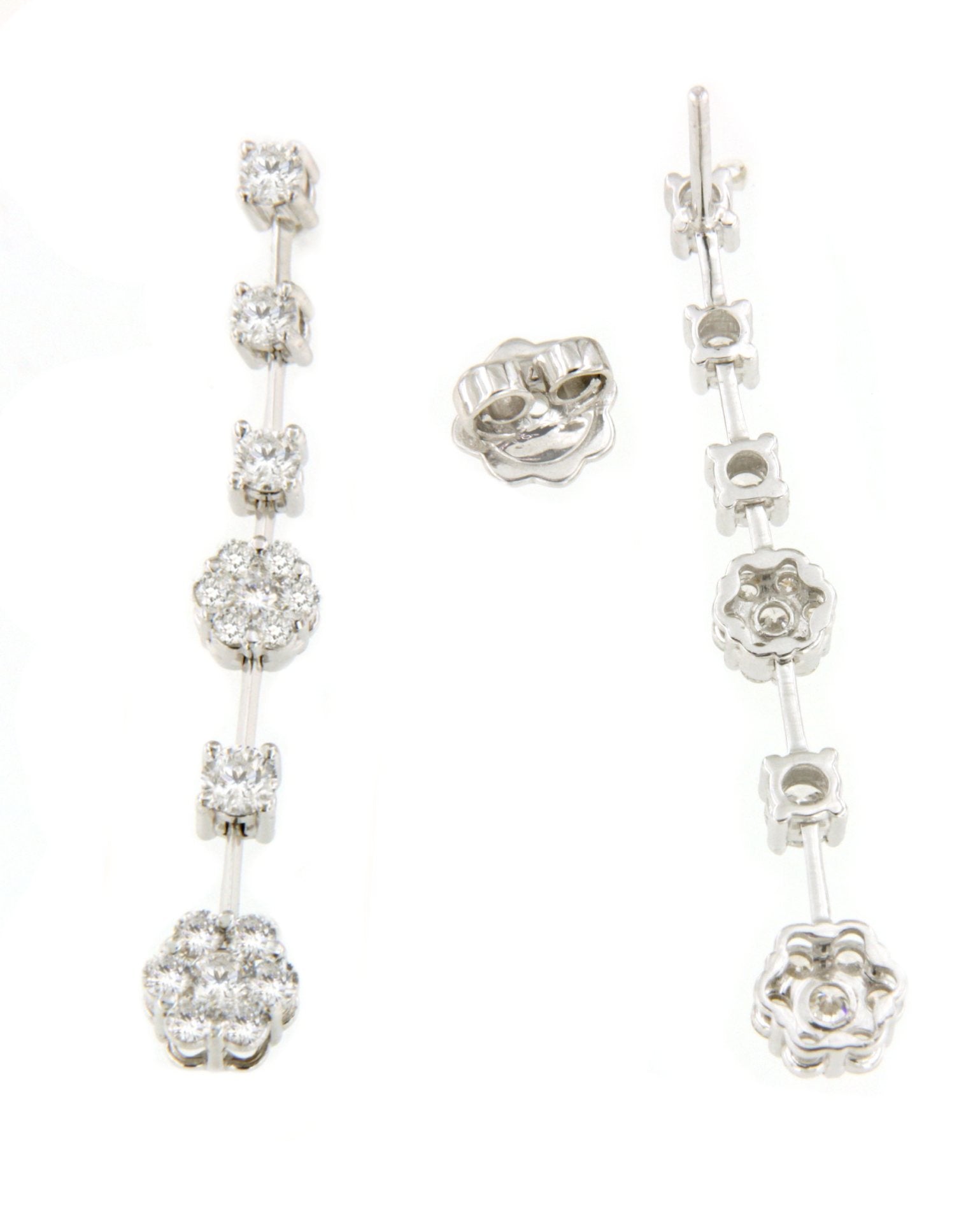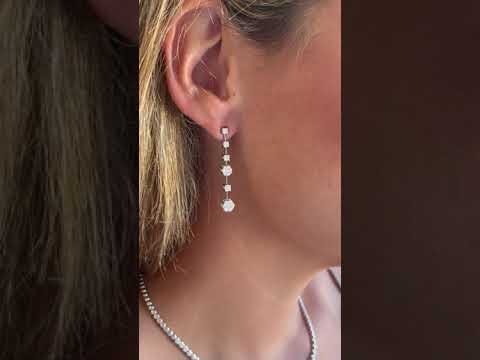 MACON is a very modern long earring , combining diamonds and diamond rosettes, suspended from a thin, faceted bar. They are crafted in 18-karat white gold. Ideal for brides!