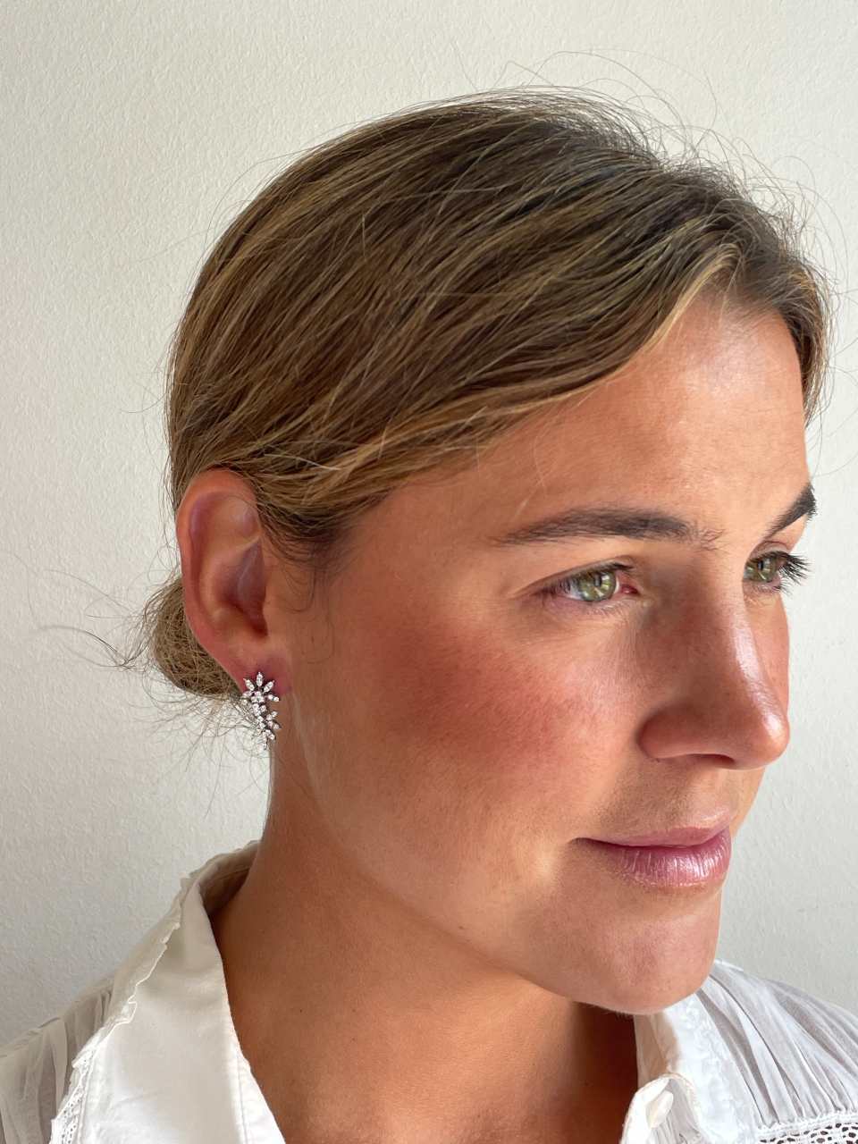 MOORS are short, detachable earrings in 18-karat white gold . Their design features a spiky flower set with pavé diamonds . You can wear them short or longer with our interchangeable accessories, creating unique combinations for any occasion.