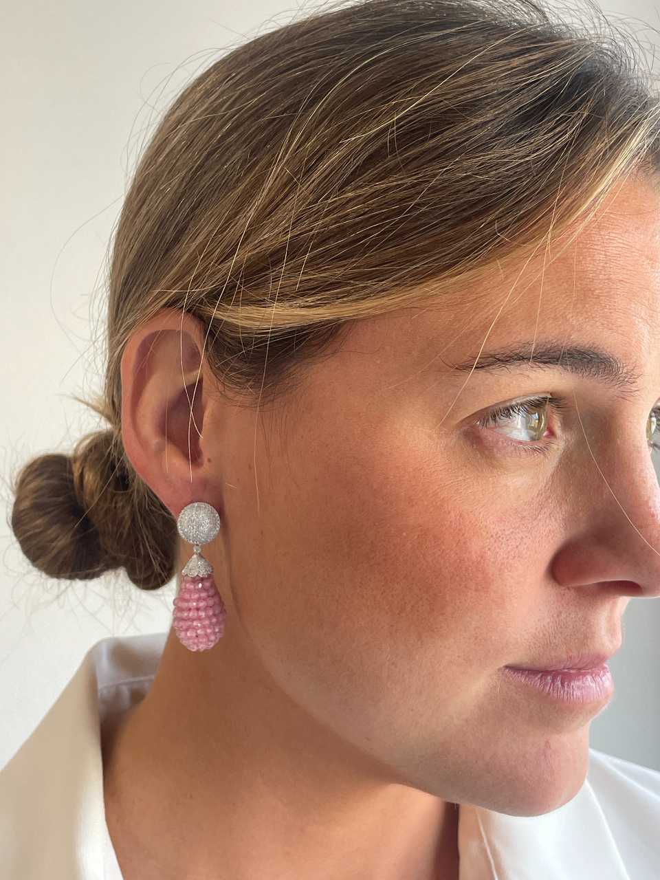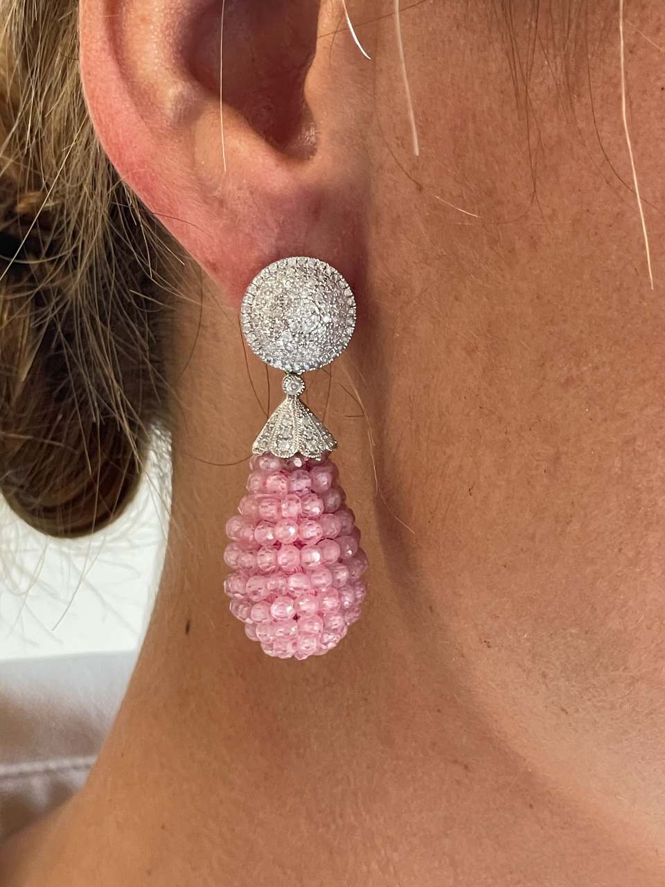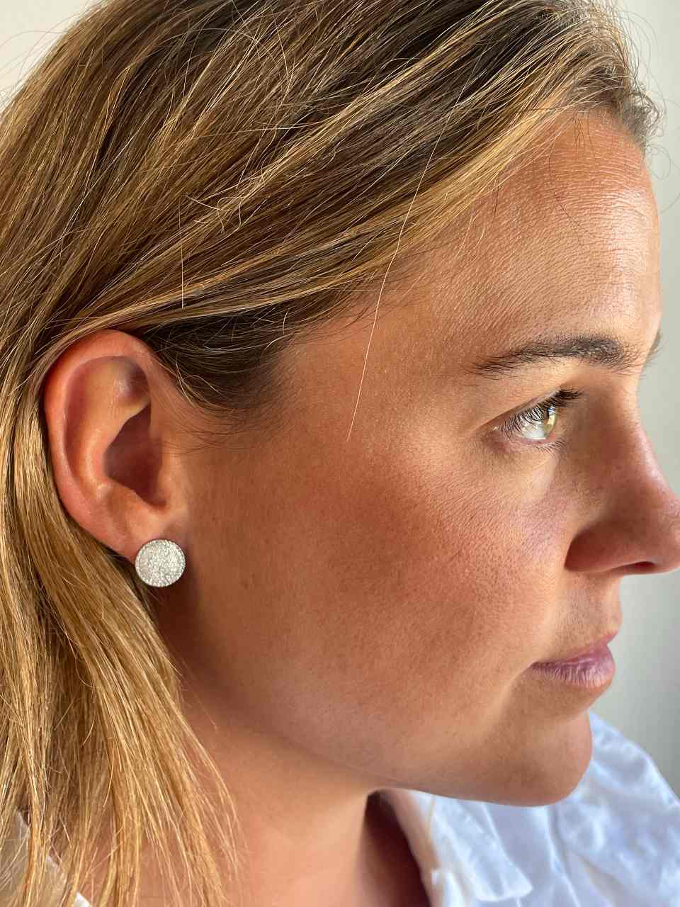 PEDRERA are short, detachable earrings in 18-karat white gold . Their design features a half-sphere set with pavé diamonds , surrounded by a diamond border. You can wear them short or longer with our interchangeable accessories, creating unique combinations for any occasion.