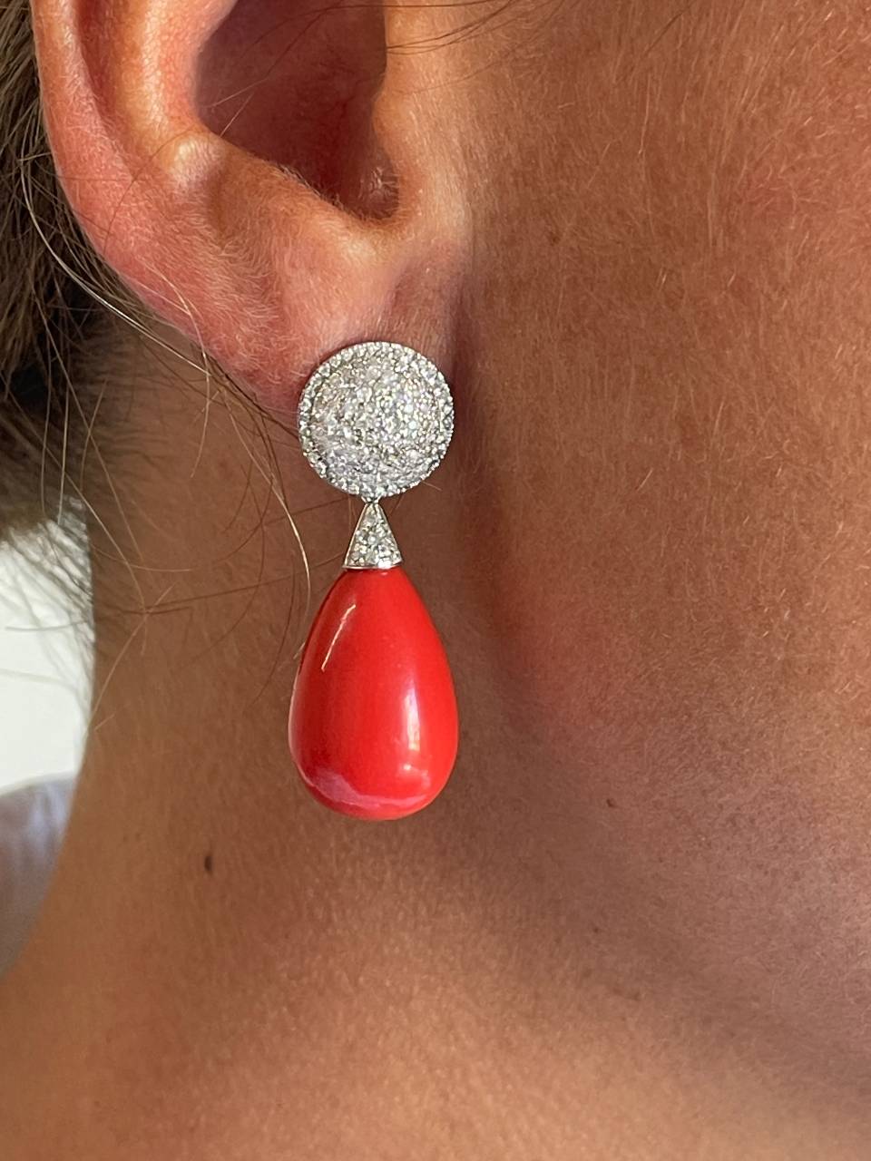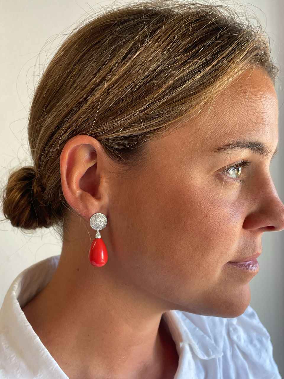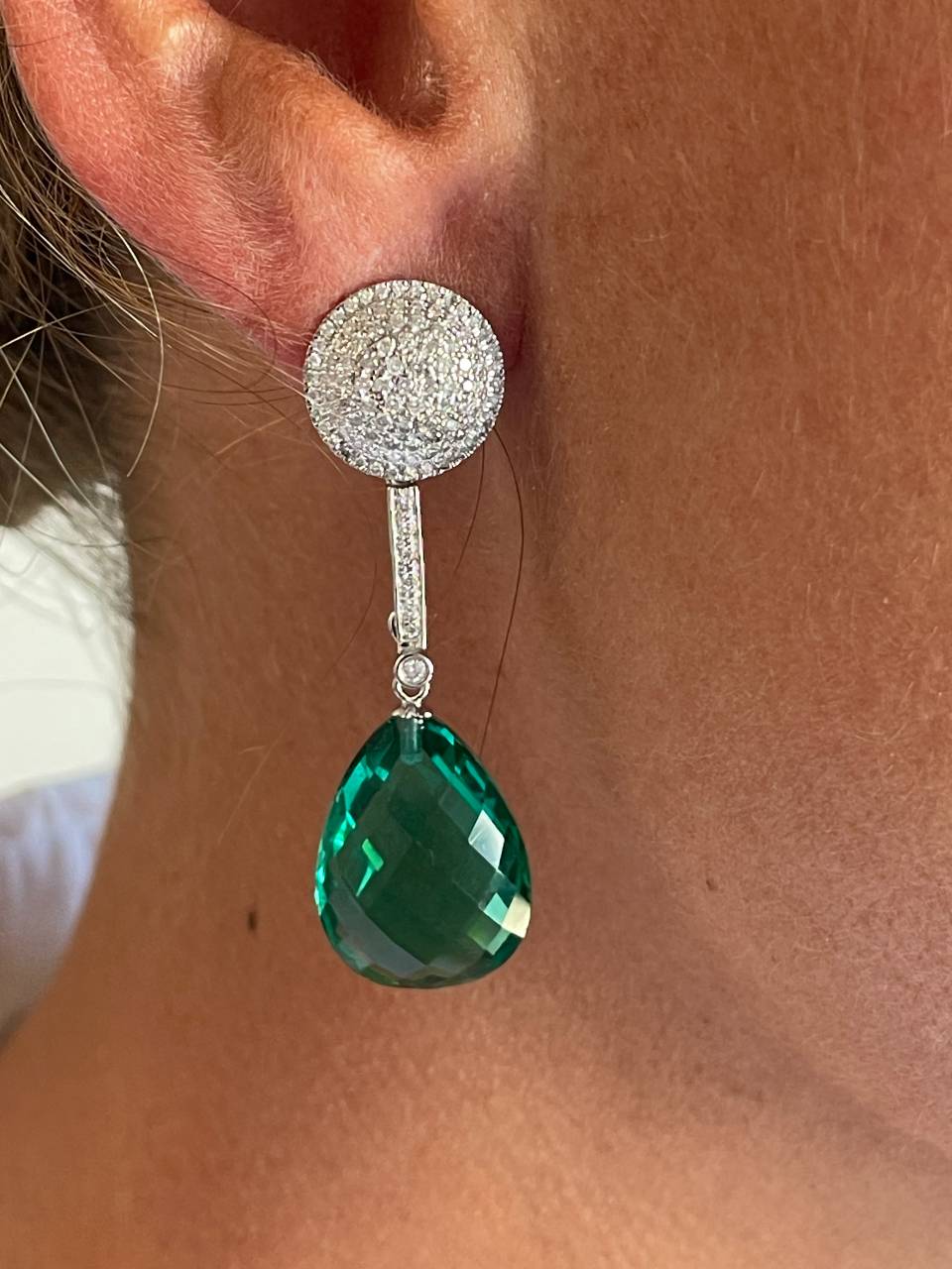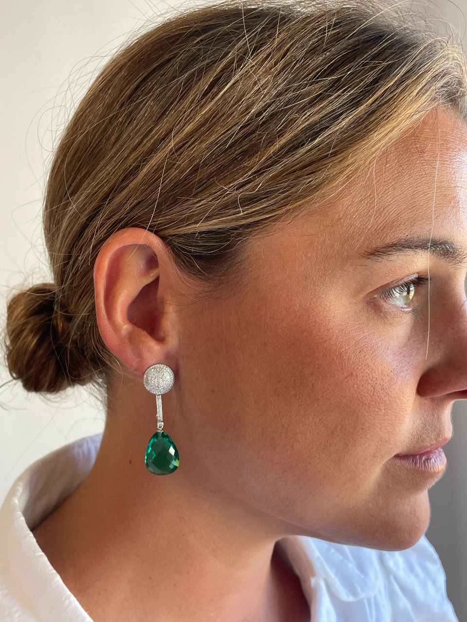 PEDRERA are short, detachable earrings in 18-karat white gold . Their design features a half-sphere set with pavé diamonds , surrounded by a diamond border. You can wear them short or longer with our interchangeable accessories, creating unique combinations for any occasion.