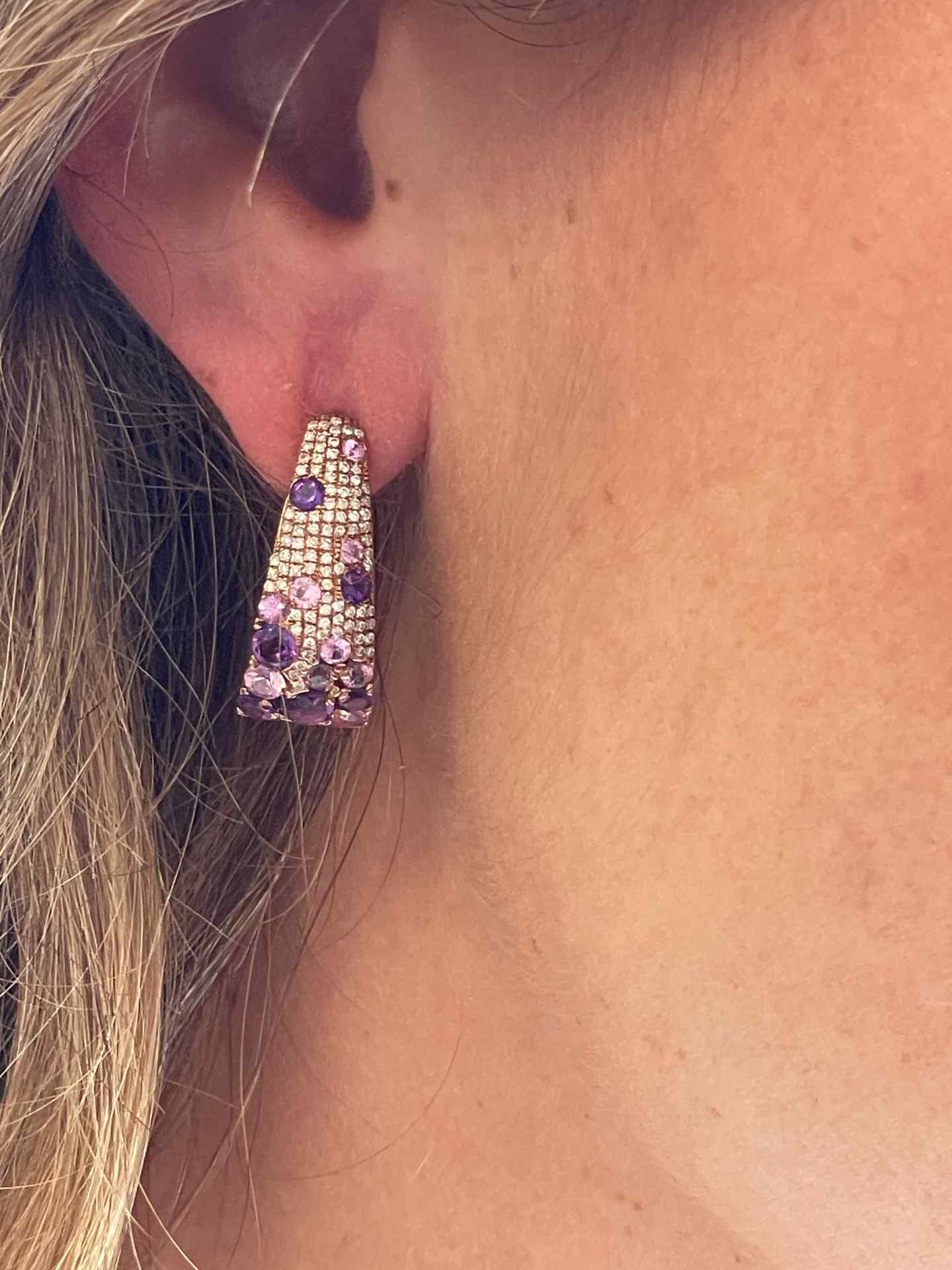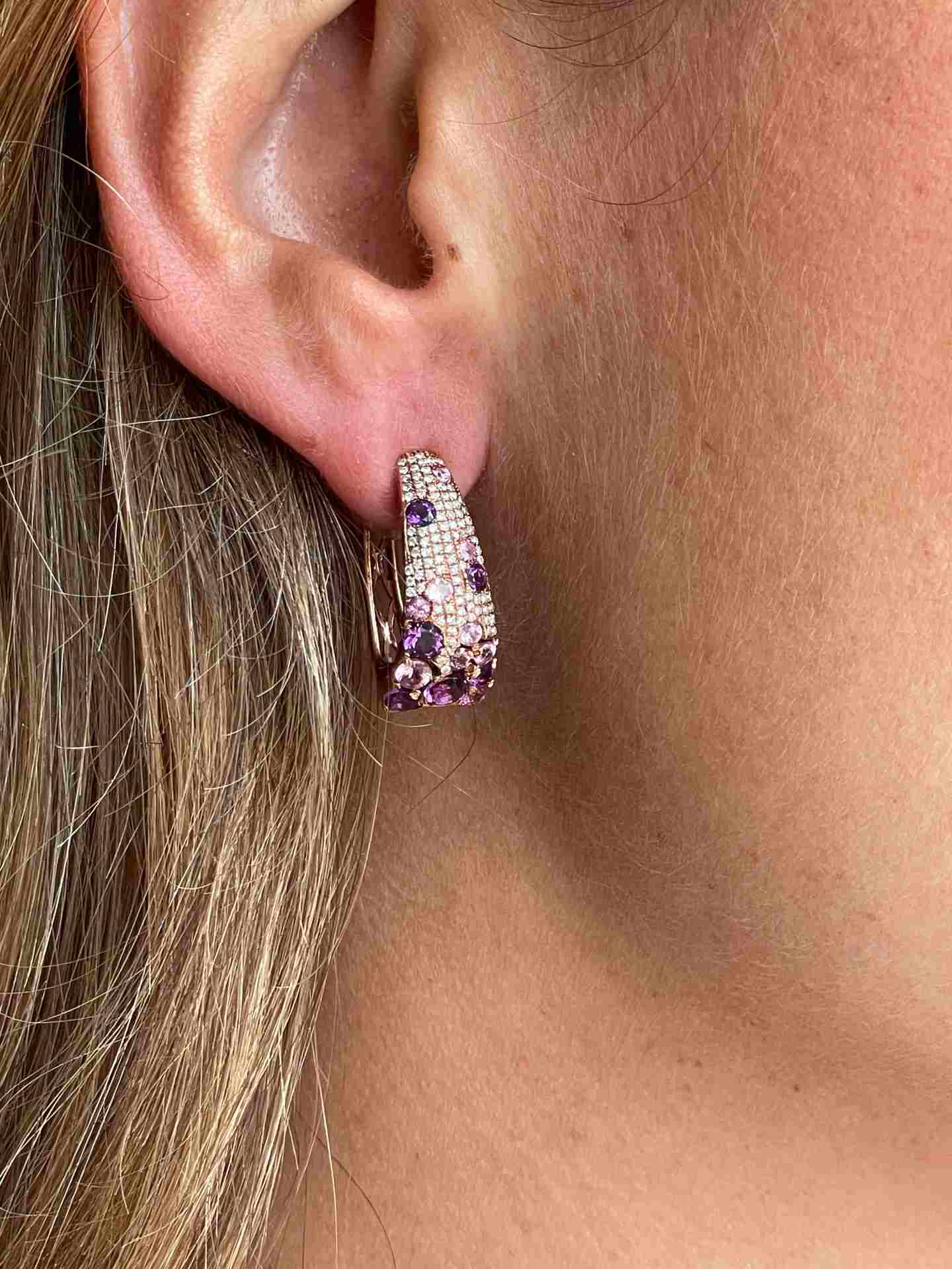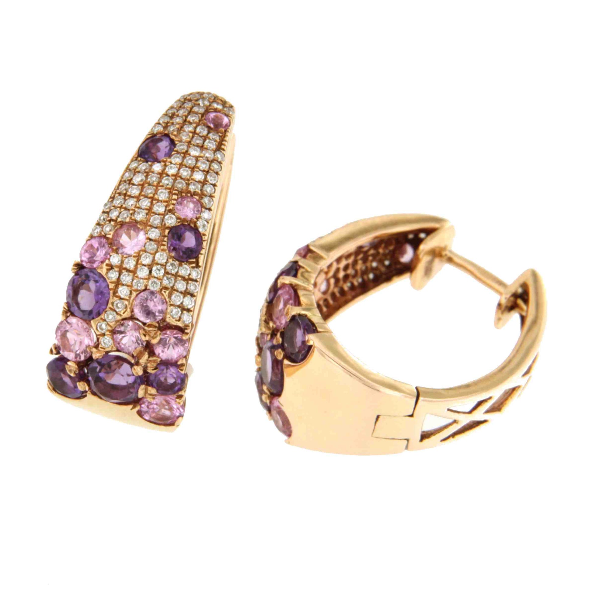 PERU , these are beautiful 18-karat rose gold hoop earrings with diamonds, amethysts, and pink sapphires . You can enjoy them every day, and they look very unique on.
