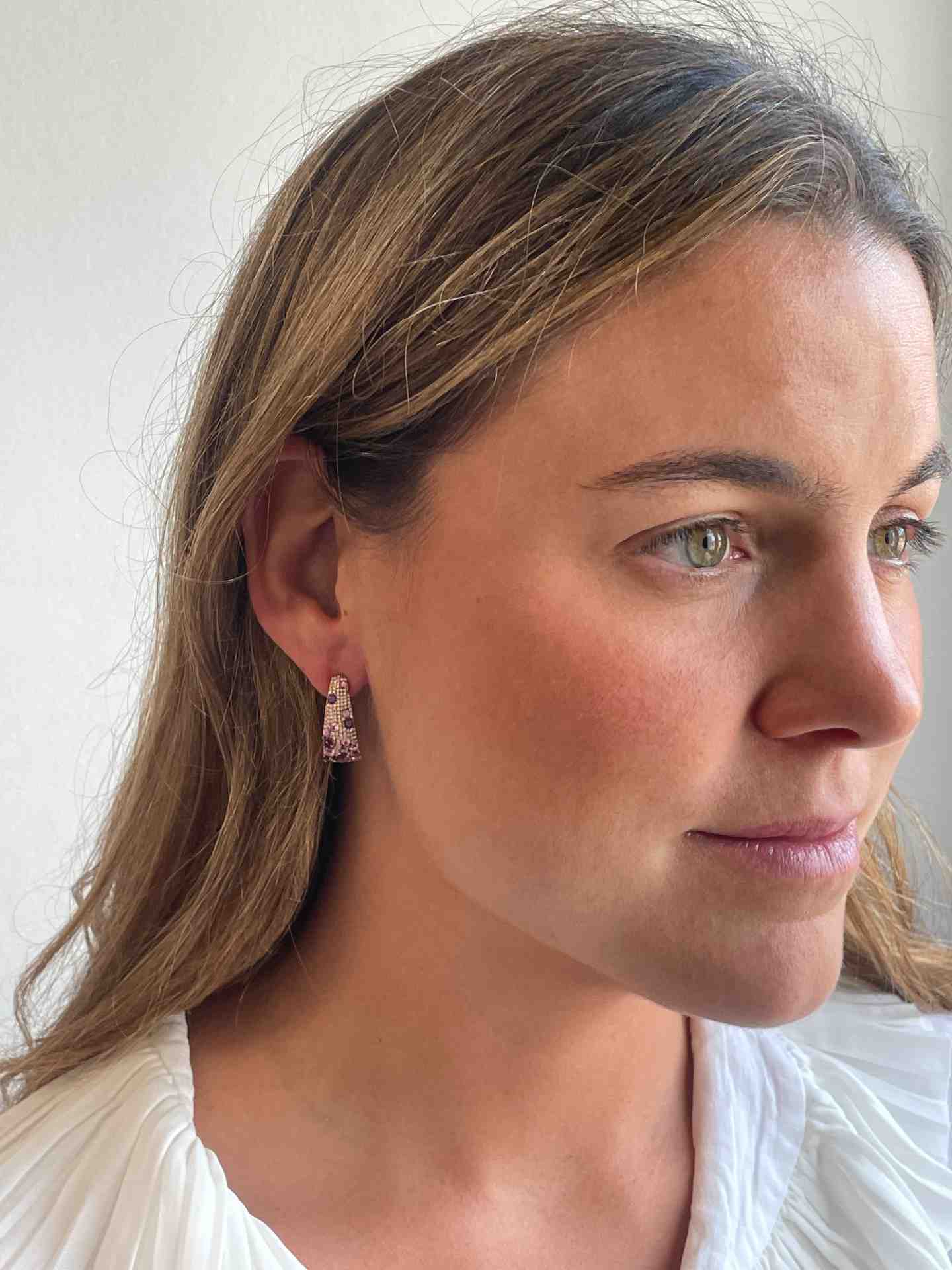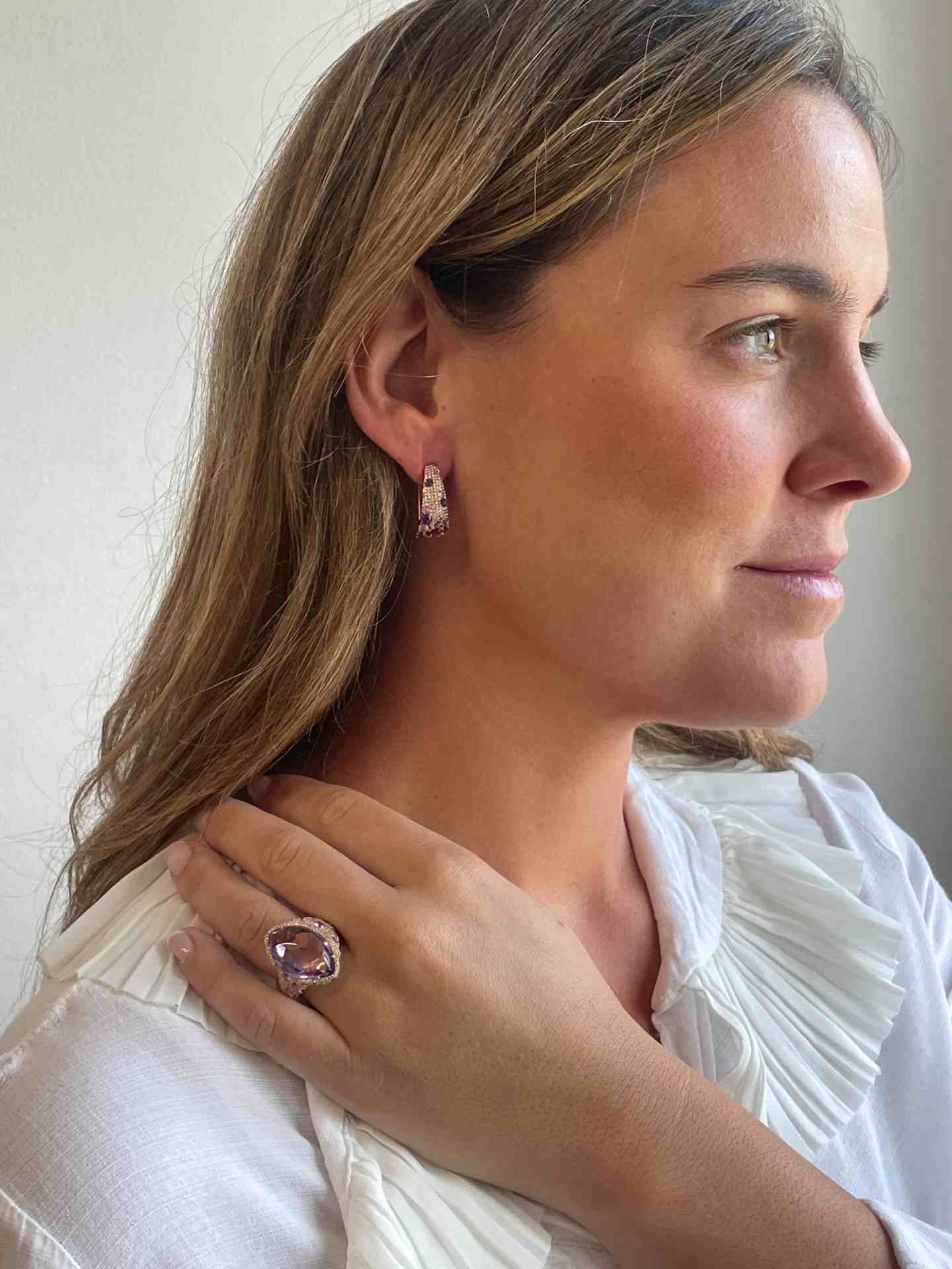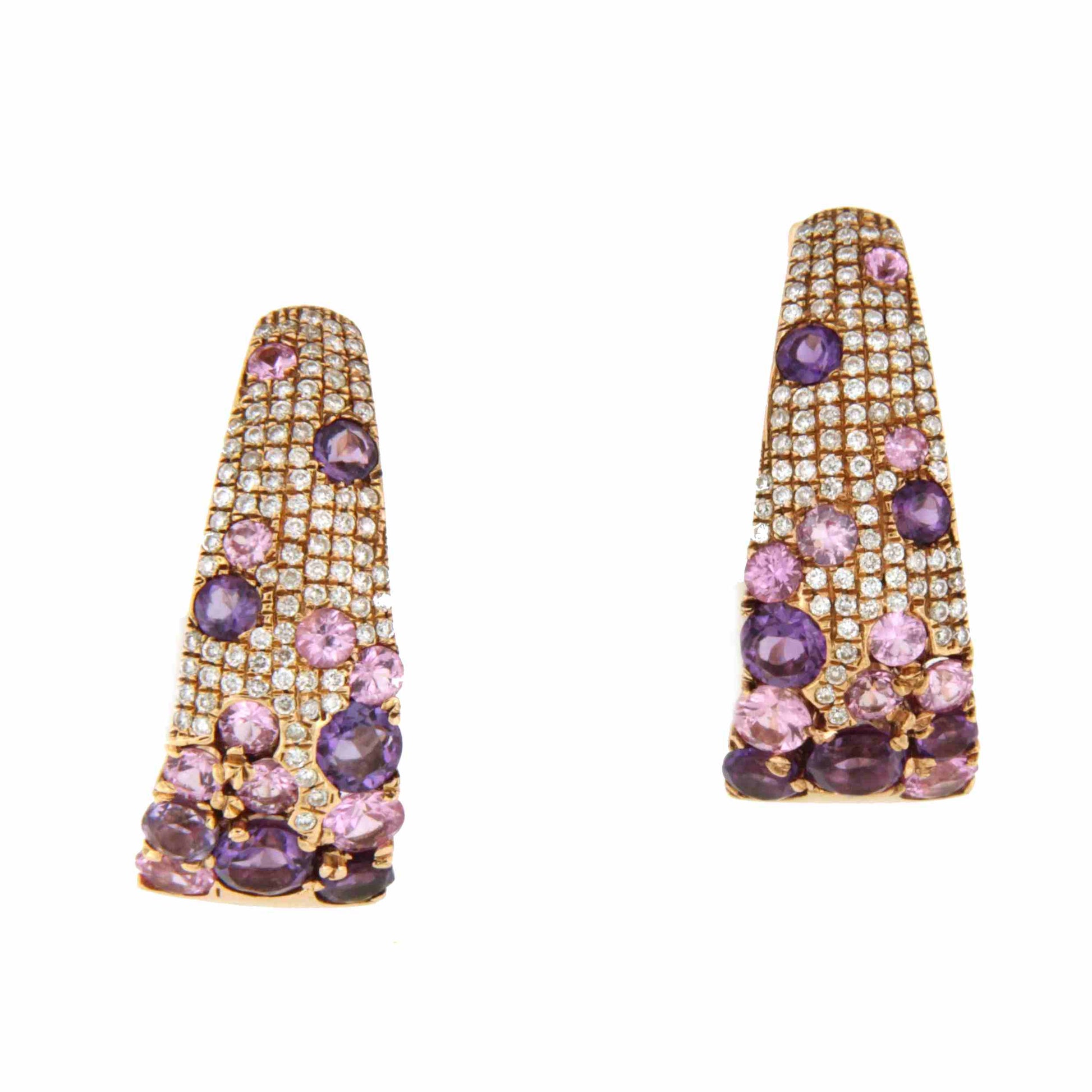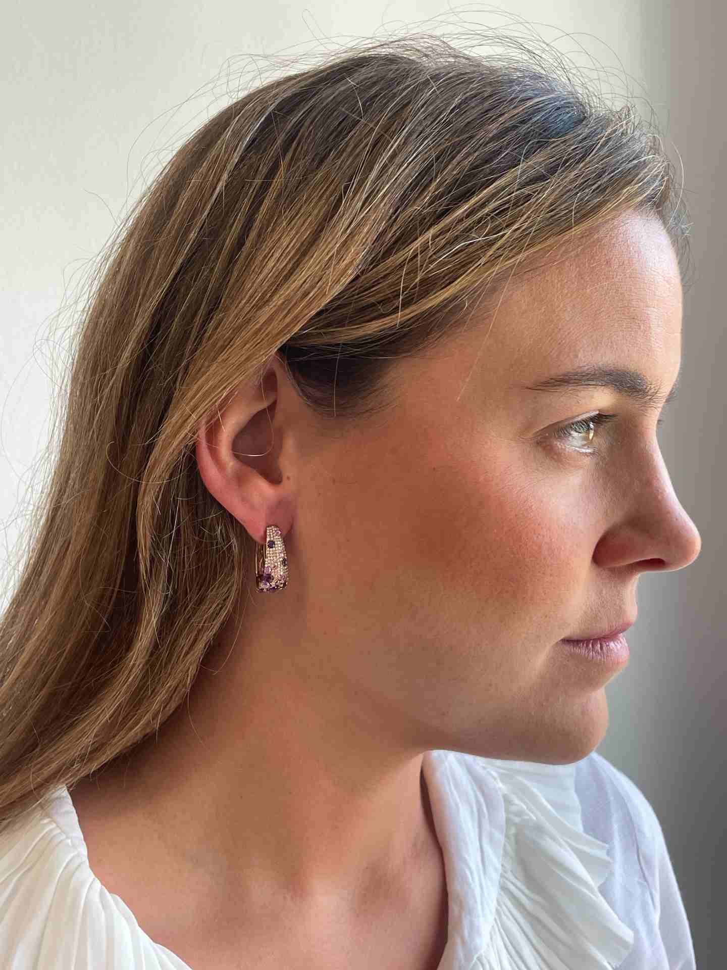 PERU , these are beautiful 18-karat rose gold hoop earrings with diamonds, amethysts, and pink sapphires . You can enjoy them every day, and they look very unique on.