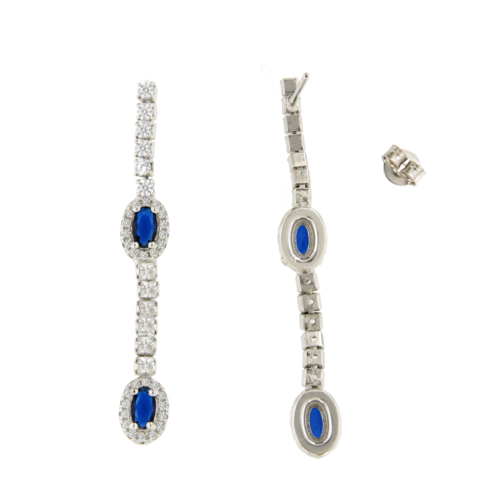 The AMELIA earrings are the perfect complement to the Valentina bracelet. Crafted in sterling silver with cubic zirconia , they are available in two options: blue spinel or red corundum . Their design features a delicate row of cubic zirconia, from which two elegant oval rosettes hang, surrounded by a halo of cubic zirconia that enhances the brilliance and beauty of the selected gemstones.