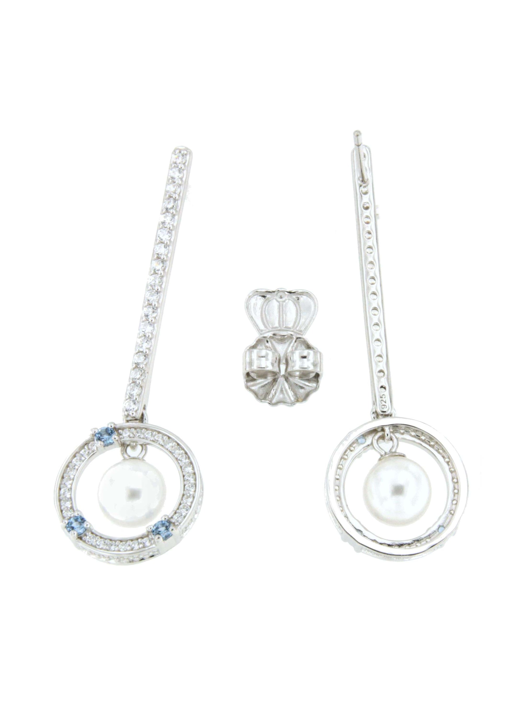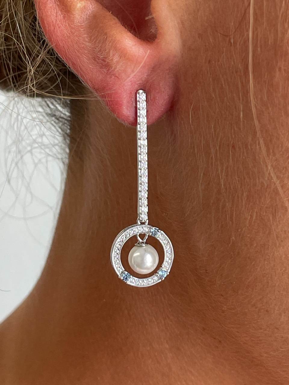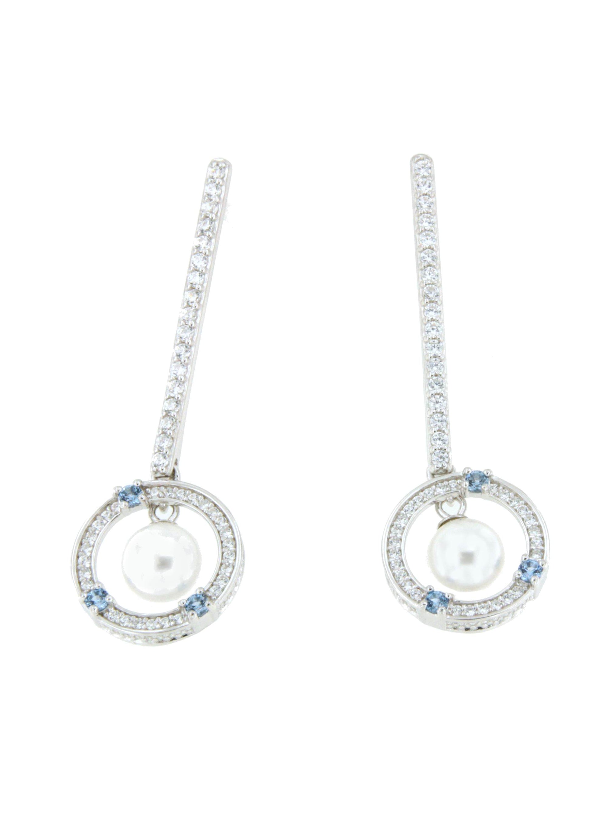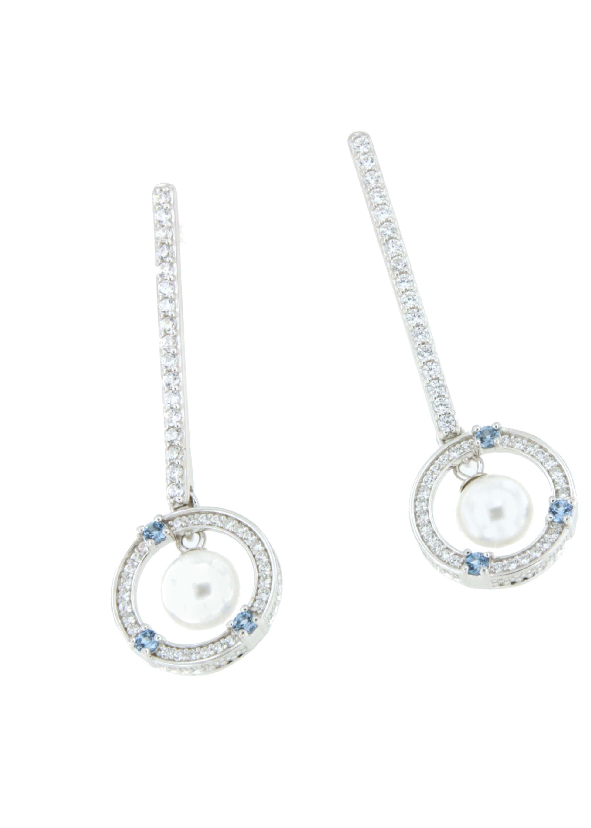 ARUBA is a long, flattering earring adorned with cubic zirconia . Crafted in sterling silver , it features two cultured pearls surrounded by a halo of white and blue cubic zirconia, making it simply spectacular.