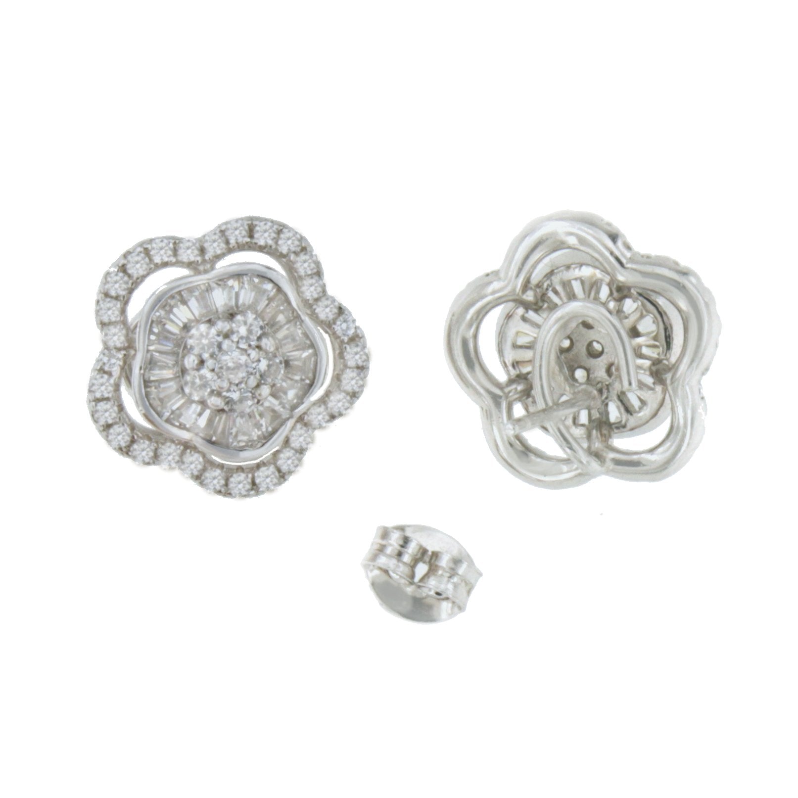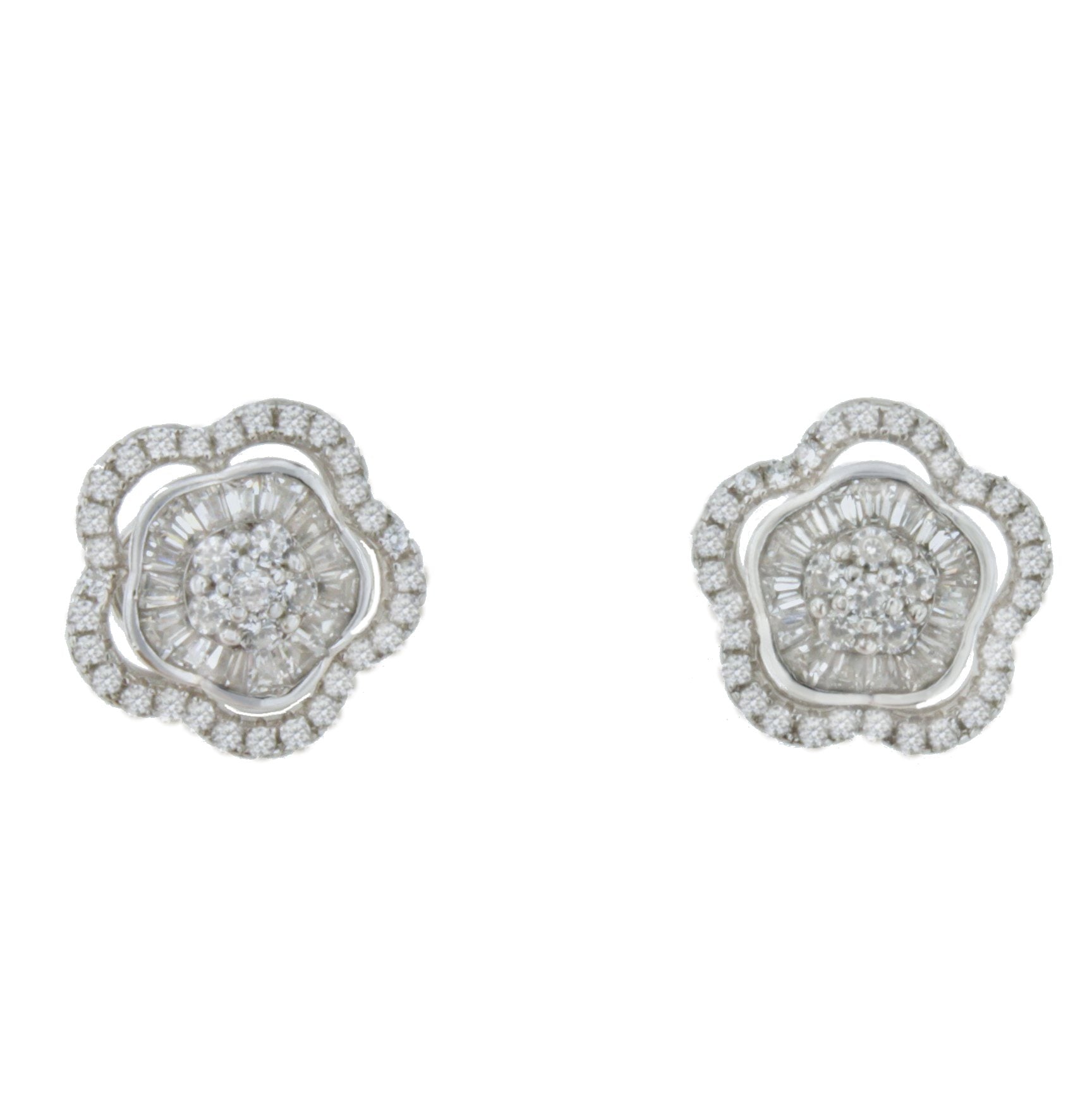 BRASIL are detachable sterling silver earrings with a floral design, featuring a central cubic zirconia rosette surrounded by two borders: one with baguette stones and the other with cubic zirconia. Beautiful and perfect for combining with other accessories to stand out on any occasion.