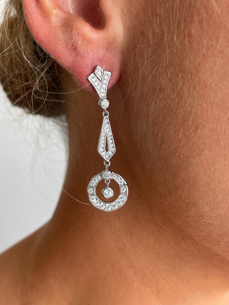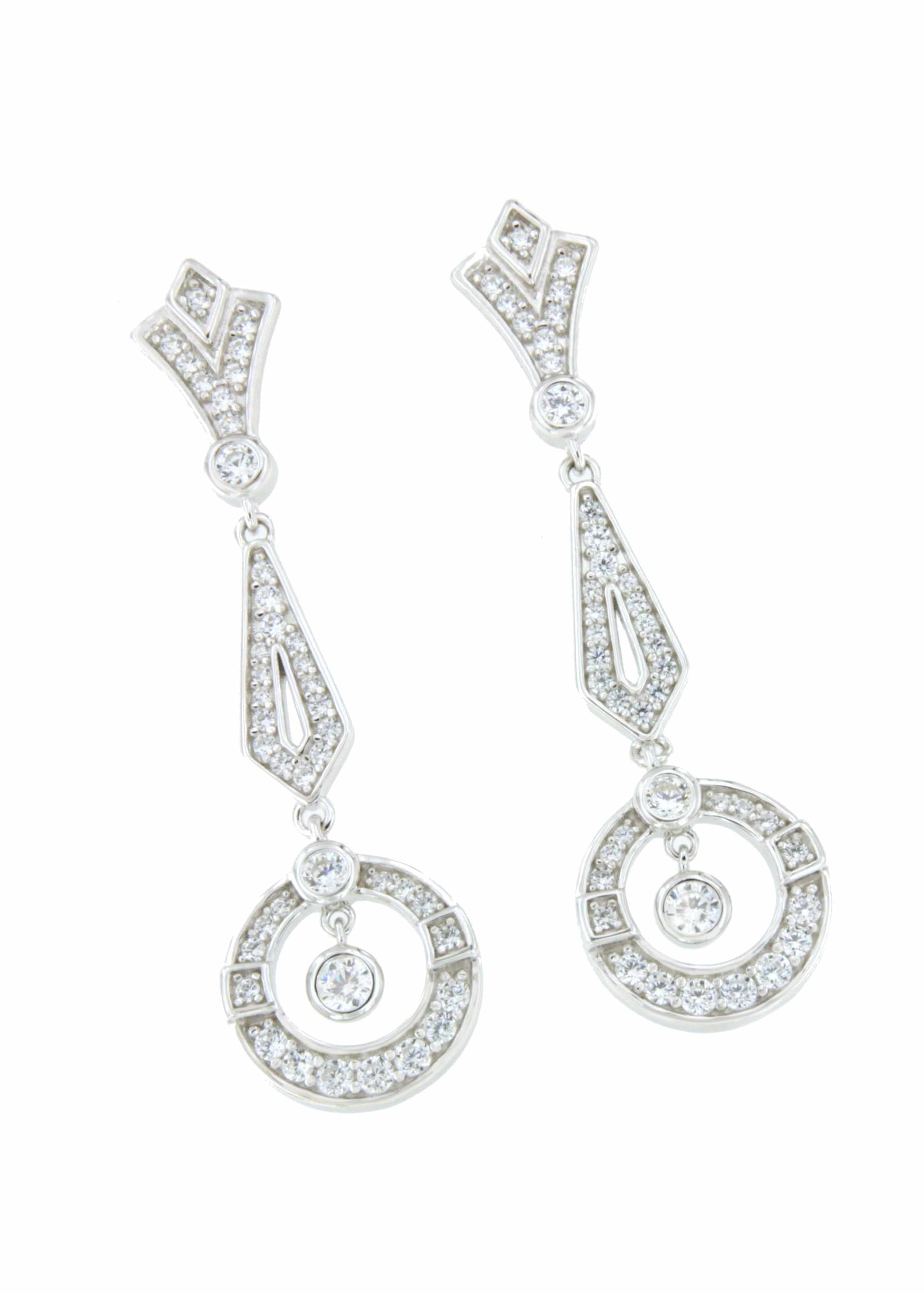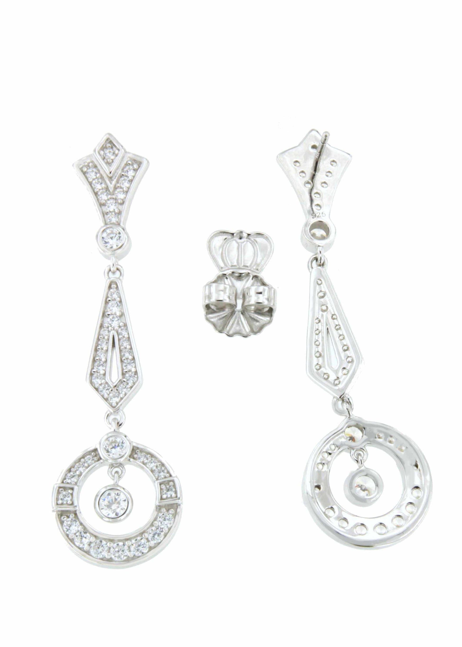 They are crafted from sterling silver and adorned with sparkling cubic zirconia stones , arranged in a sophisticated geometric design. Their structure combines elongated and circular shapes, with diamond-shaped details at the top and double circles at the base, creating a delicate movement and a unique appearance.