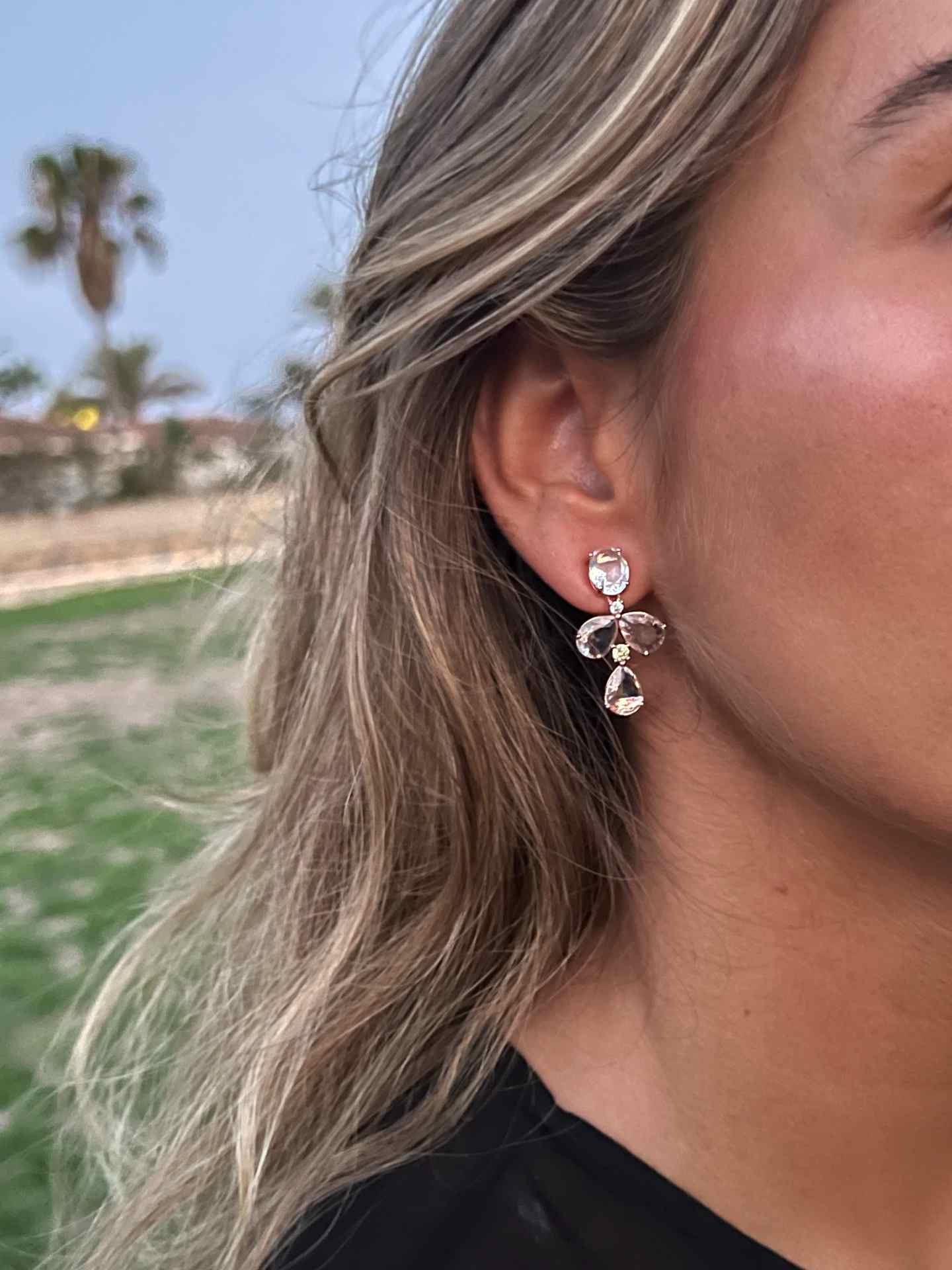 Its design is characterized by hanging quartz crystals, elegantly connected by a white and a yellow cubic zirconia, which adds a unique touch of distinction and elegance .