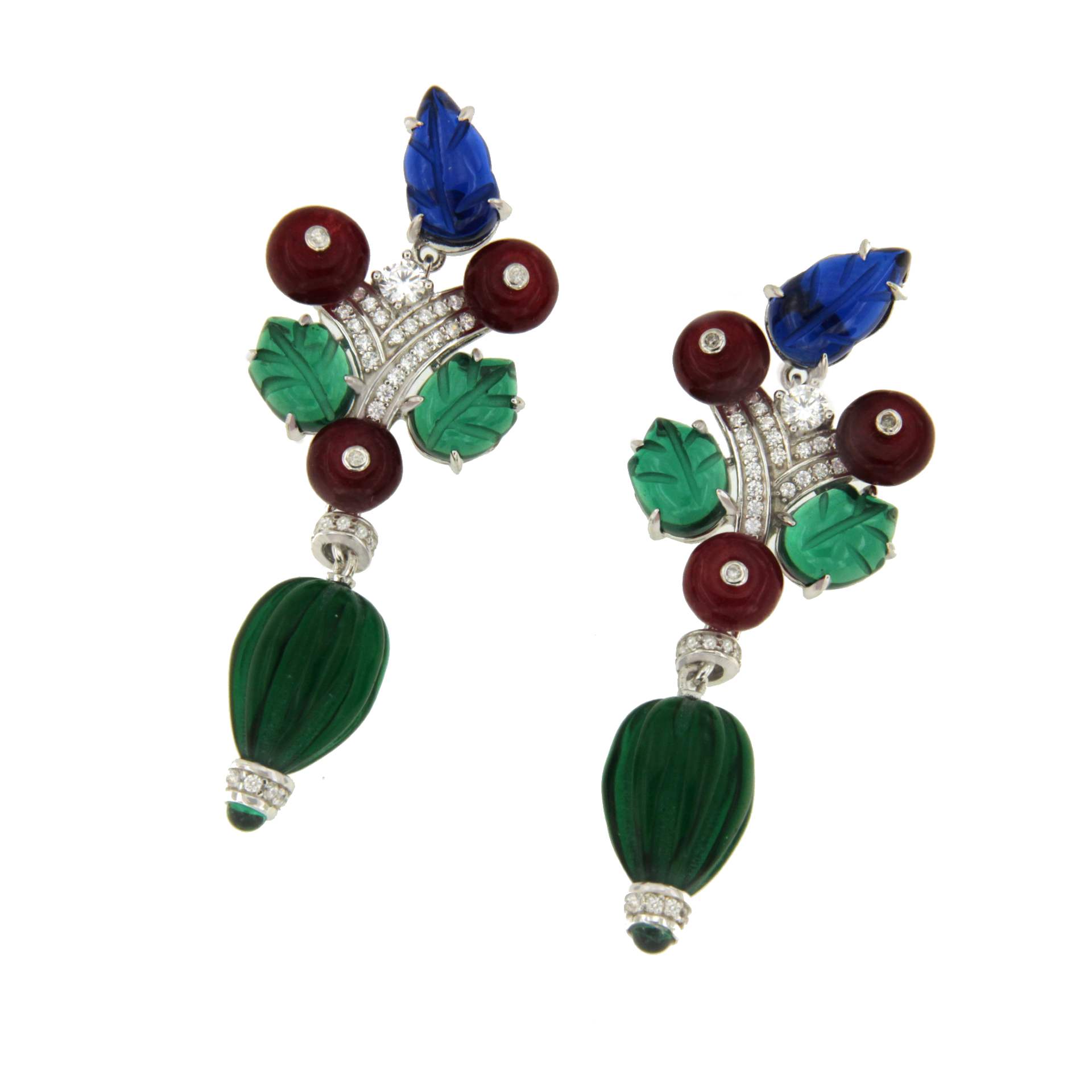 Crafted with cubic zirconia stones carved into leaf shapes and spheres in ruby, emerald, and sapphire hues, these earrings are a true work of art. Their stylized form, culminating in a green teardrop, adds a touch of luxury and distinction that enhances any look.