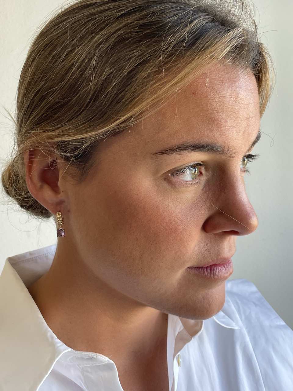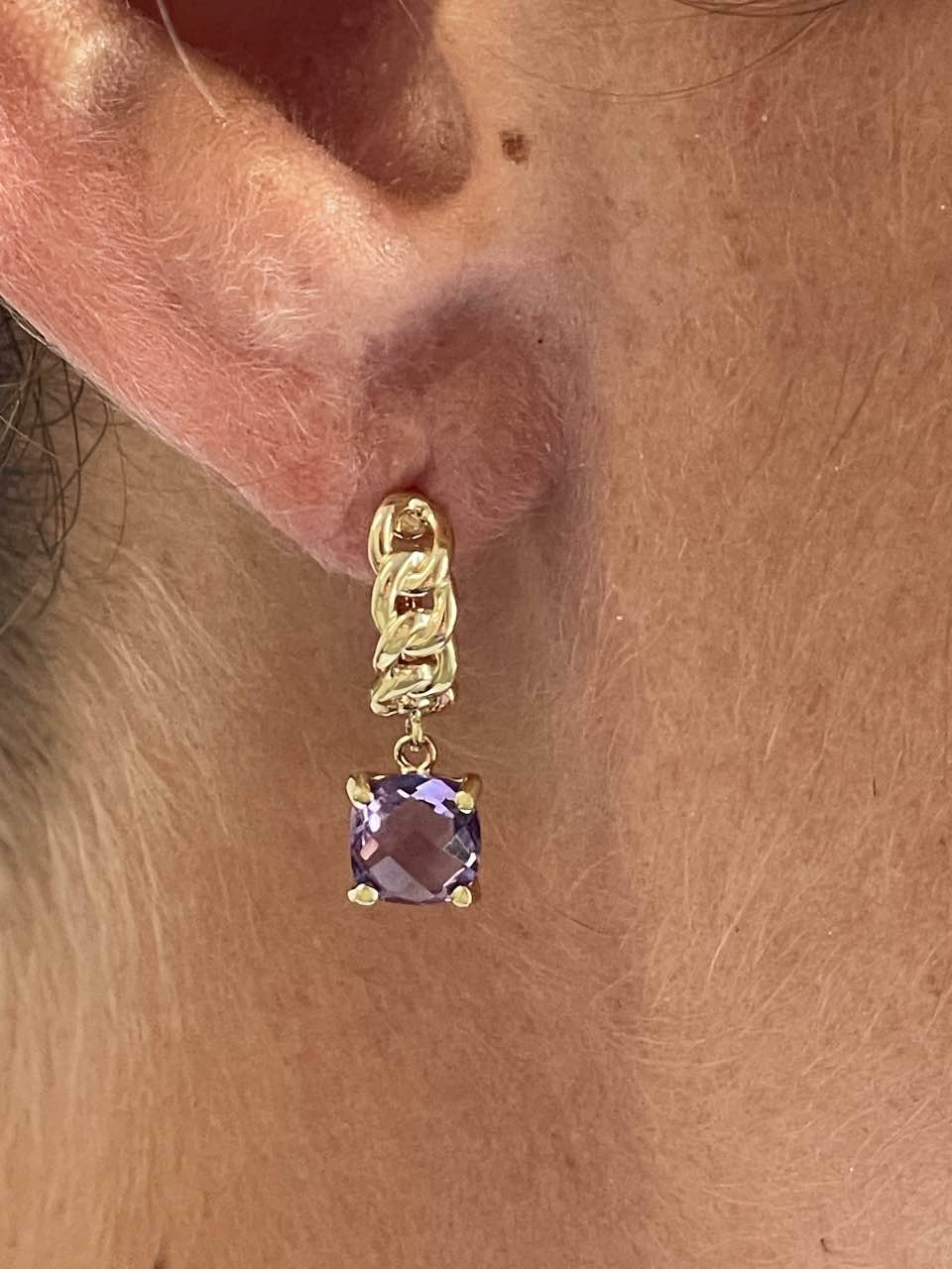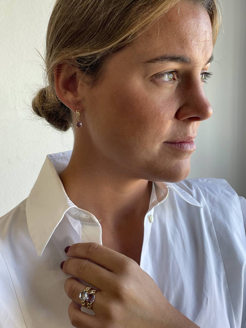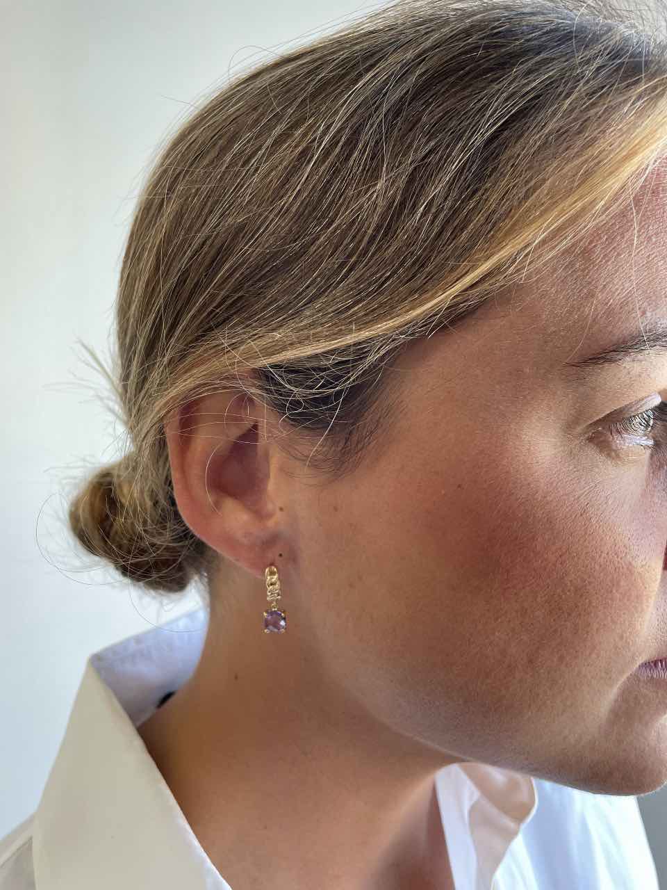 GARDENIA are gemstone earrings , featuring an amethyst suspended from a ring formed by a curb chain. Made of 18-karat yellow gold.