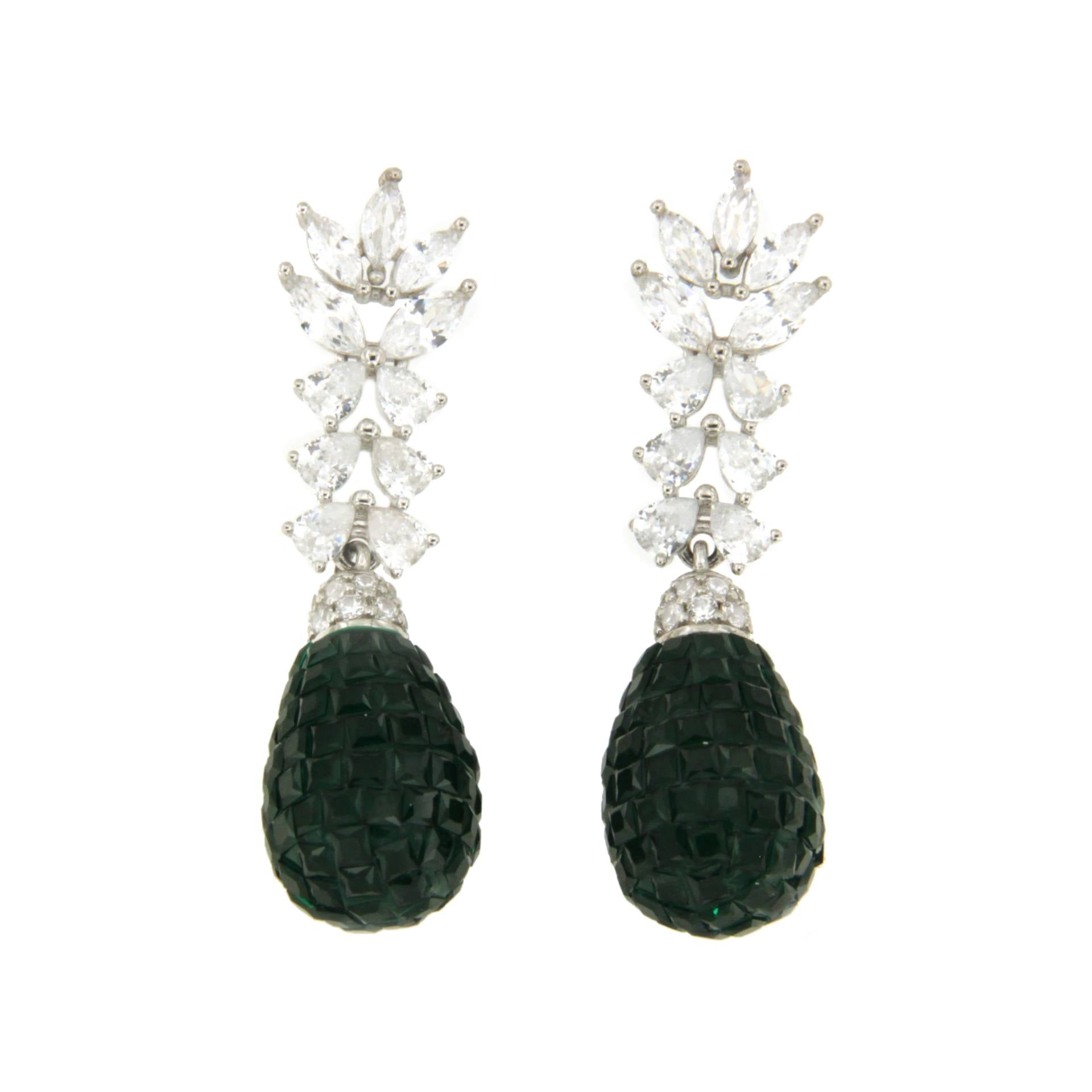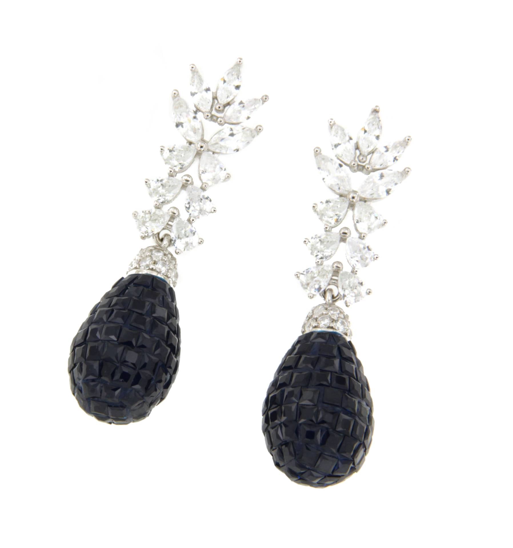 Precious gem: White cubic zirconia and cubic zirconia in ruby, emerald, and sapphire colors.