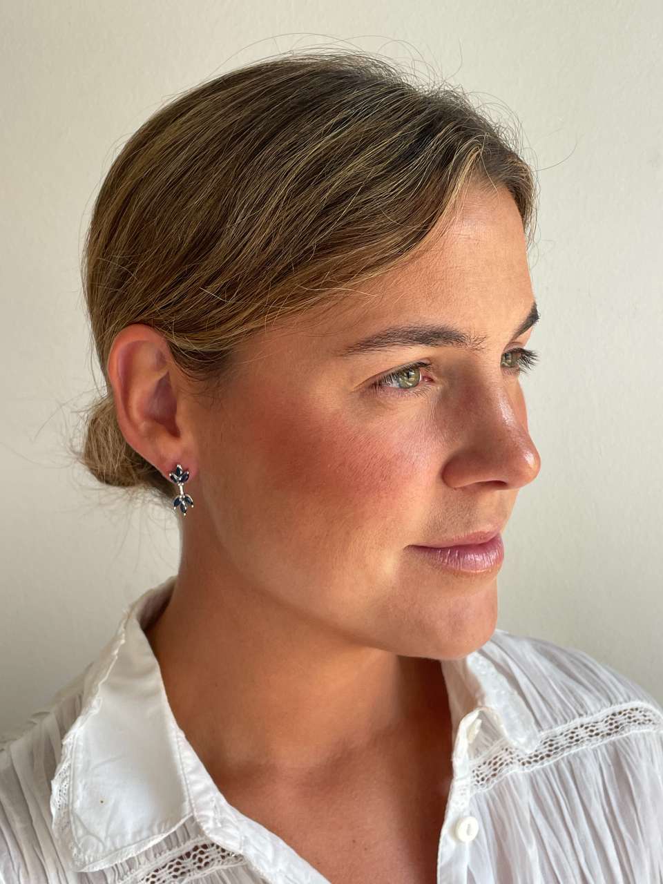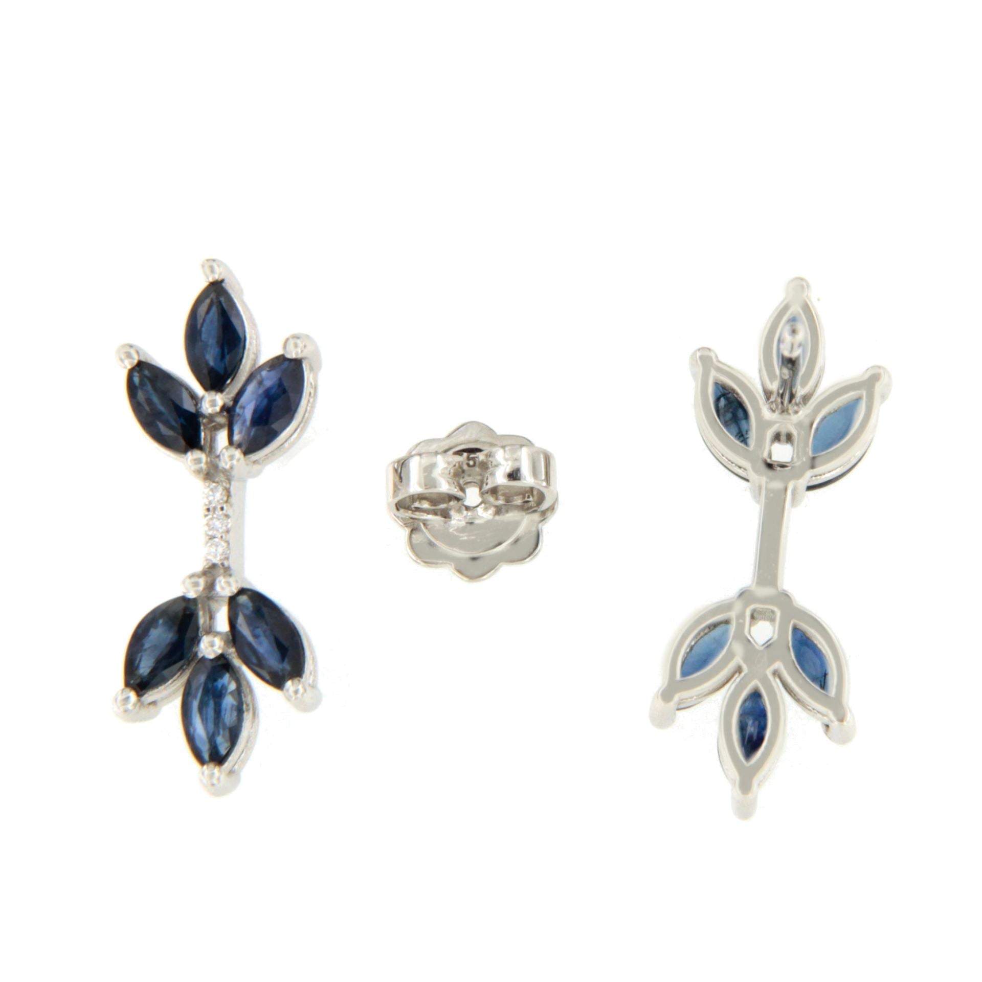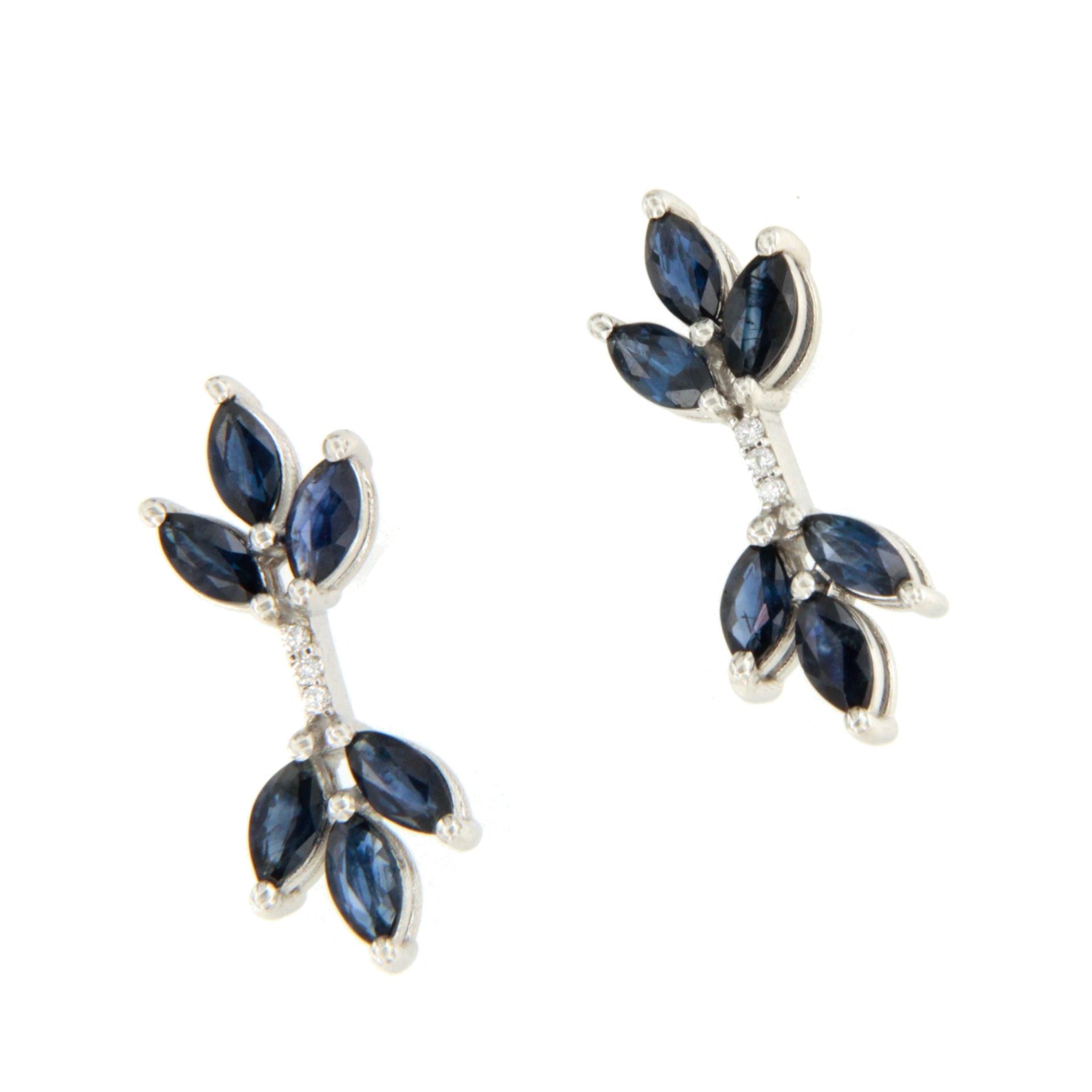 INARI are short dangling earrings . Their original design features three marquise sapphires in white gold, from which hangs a bar with three diamonds and three more marquise sapphires. Made in 18k white gold.