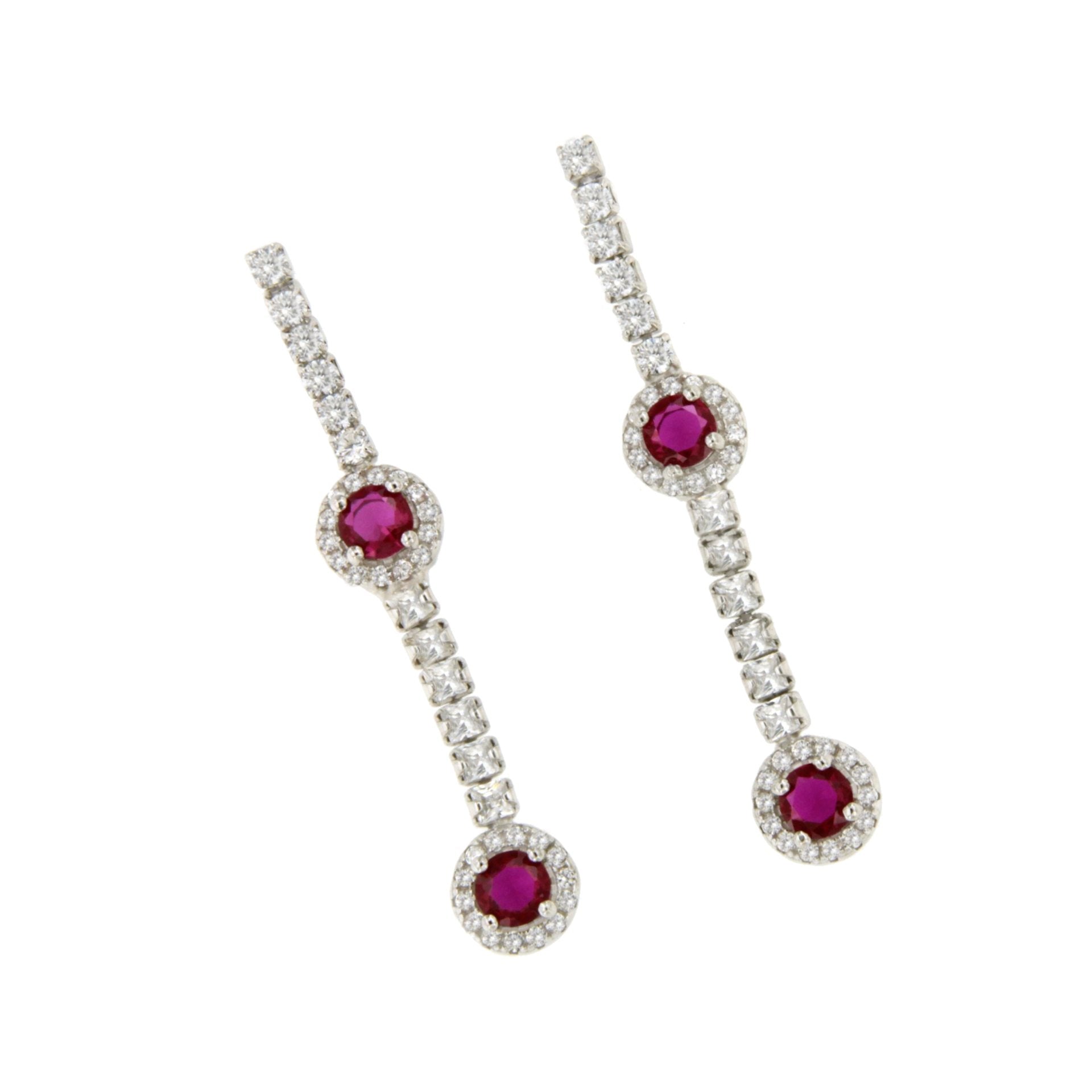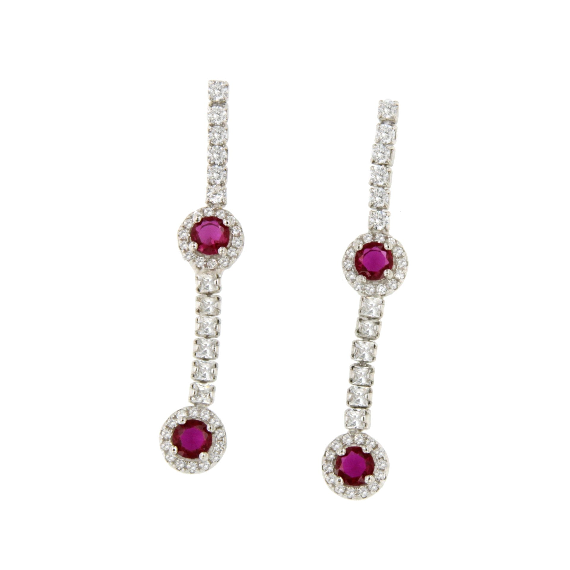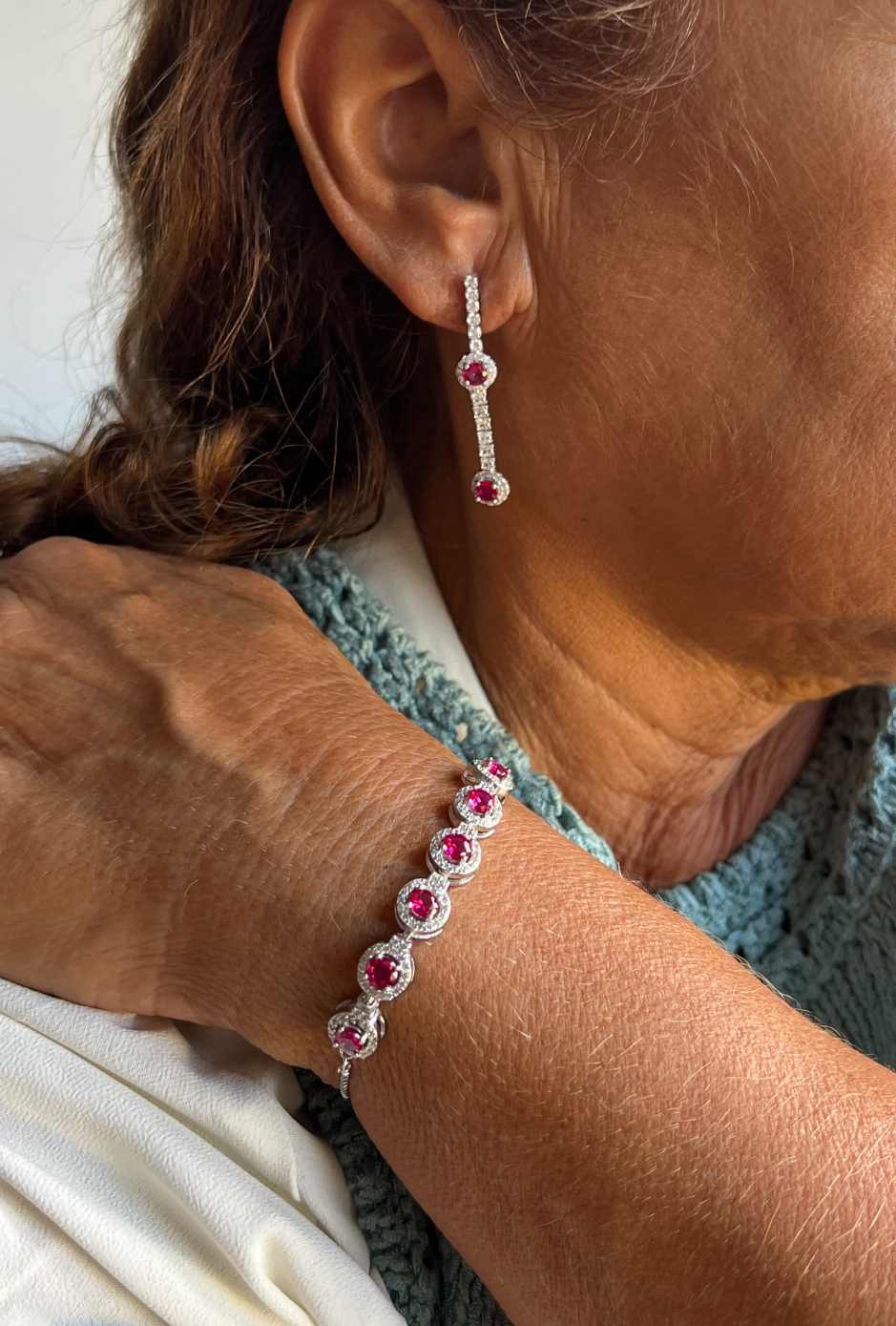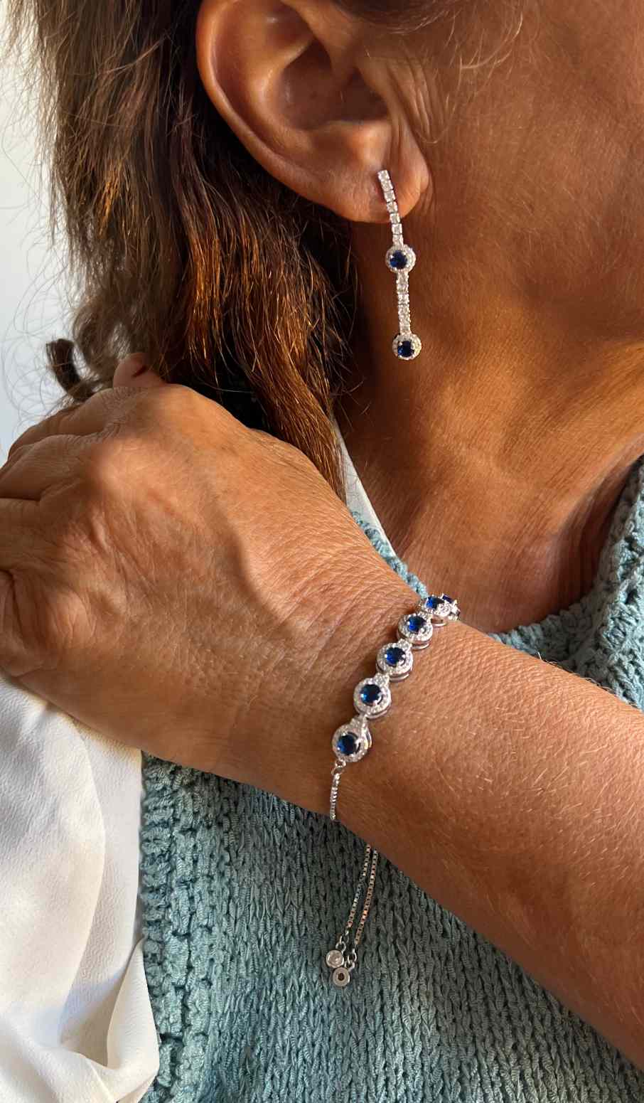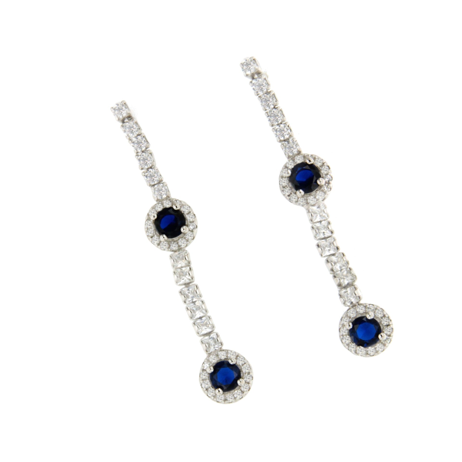 The INDIRA earrings perfectly complement the Harriet bracelet, with a sophisticated and elegant design. Crafted in sterling silver with dazzling cubic zirconia , they are available in two options: blue spinel or red corundum . Their delicate structure features a row of cubic zirconia from which two round rosettes hang, each standing out for its brilliance and color, depending on the chosen gemstone.