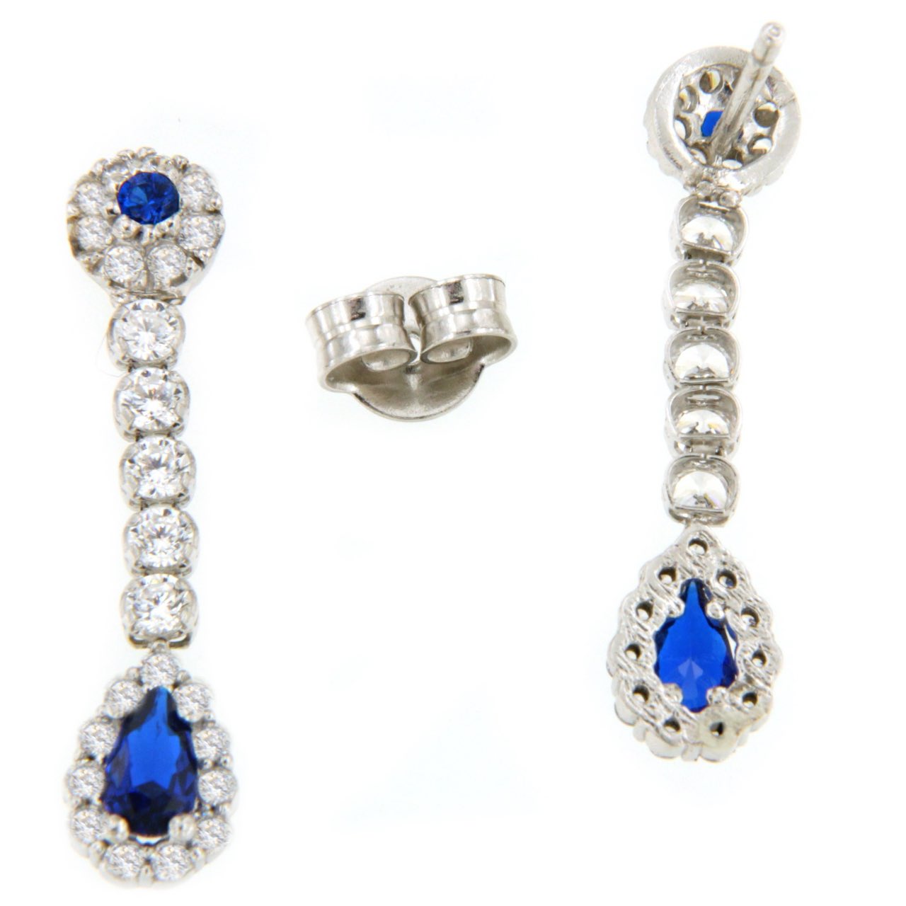 ISTAM is a very cute earring , in 18-karat white gold with cubic zirconia and a long, but small, synthetic sapphire .