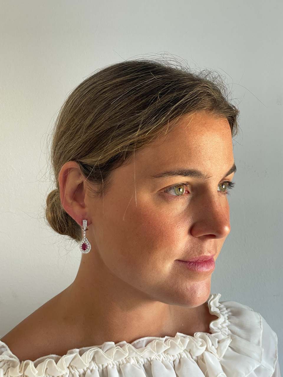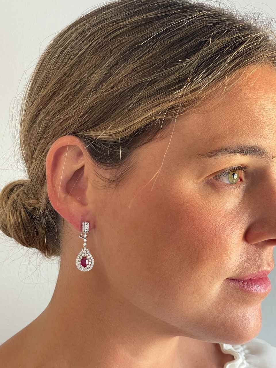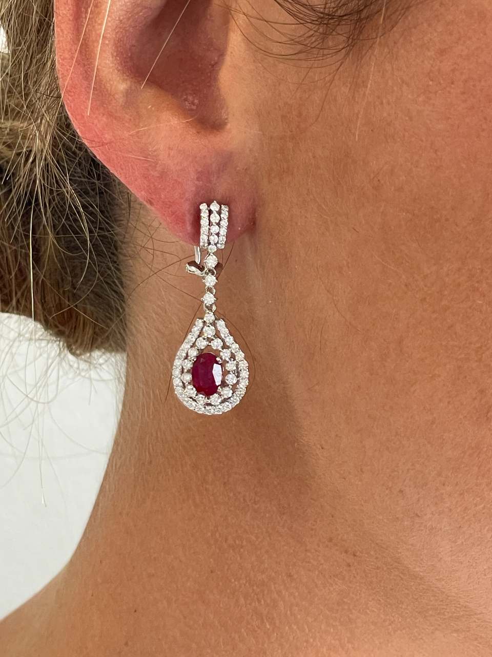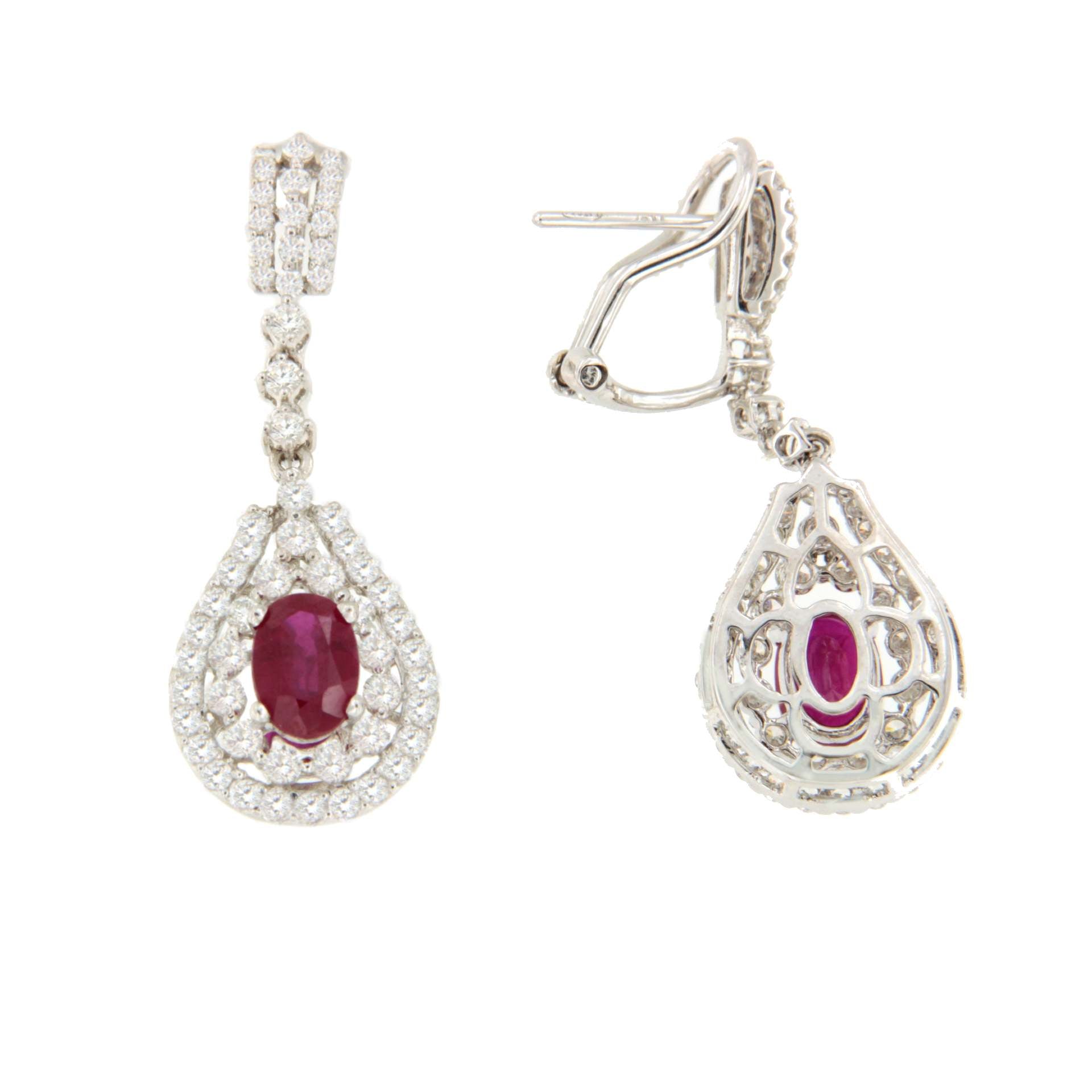 MANDARINA , a beautiful long earring featuring oval-cut rubies set with diamonds, crafted in 18-karat white gold, with a beautiful movement . Absolutely stunning!