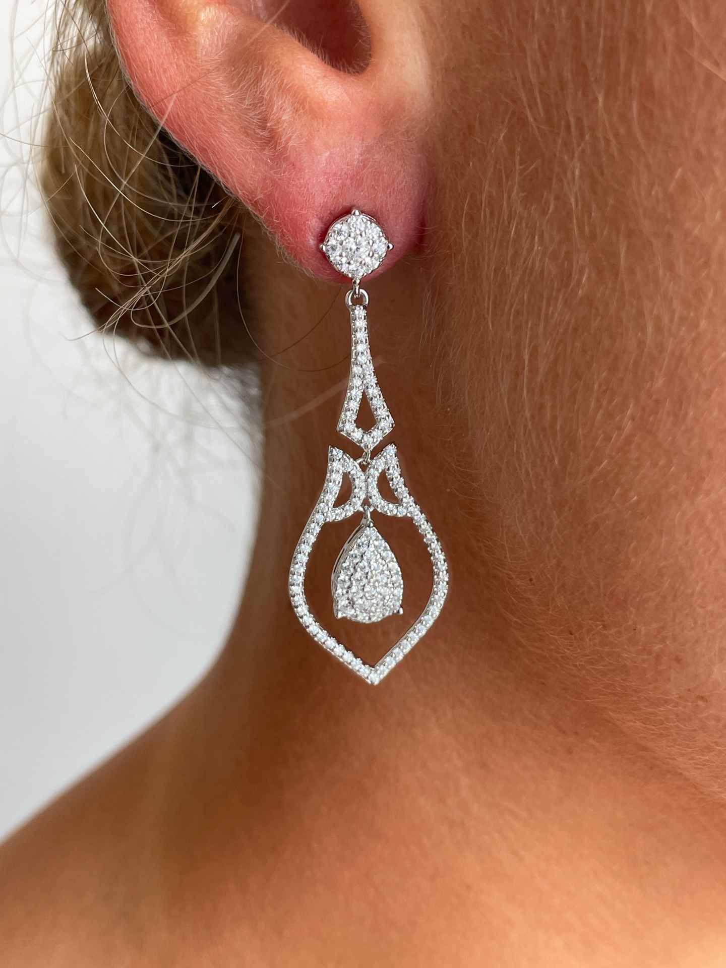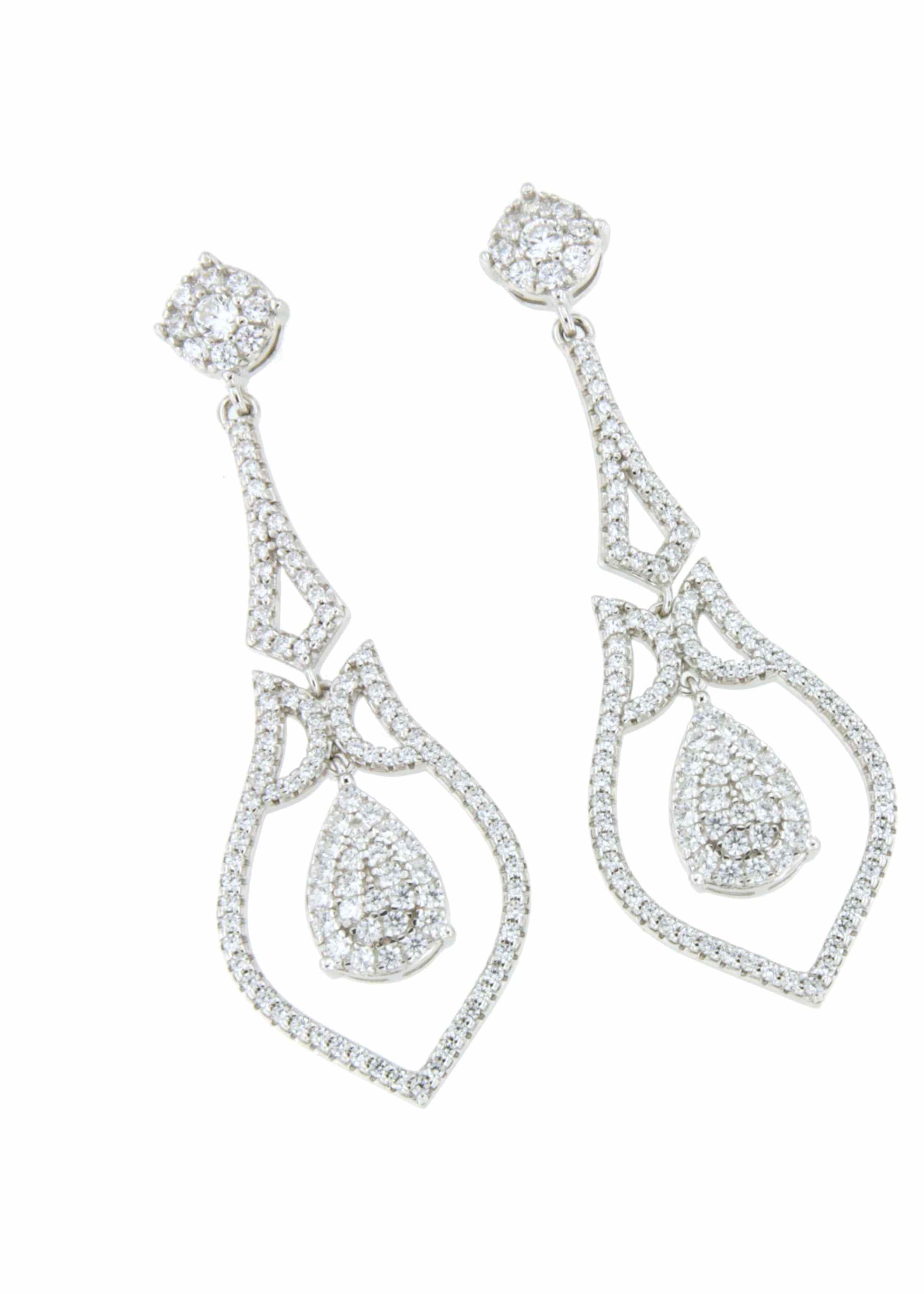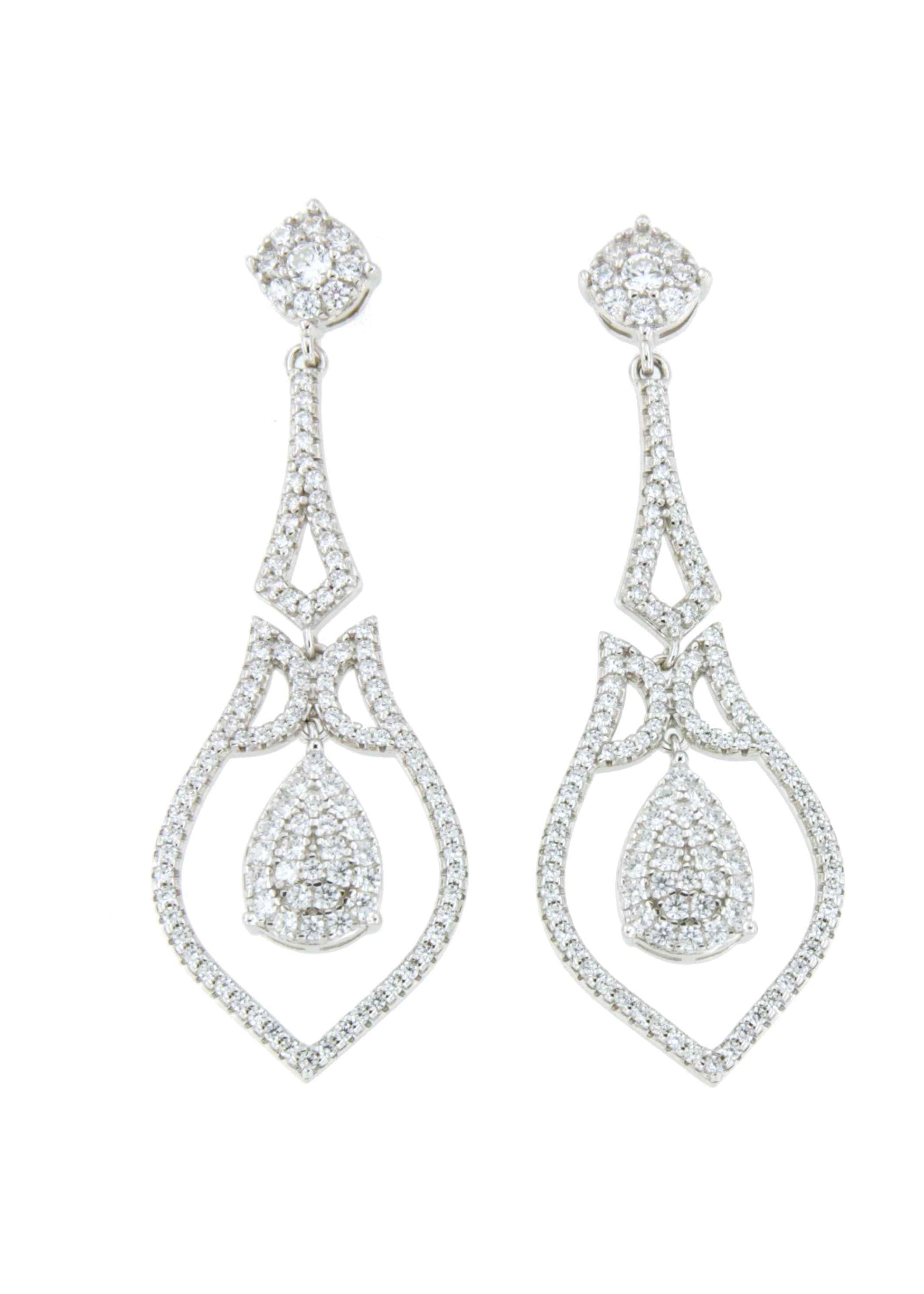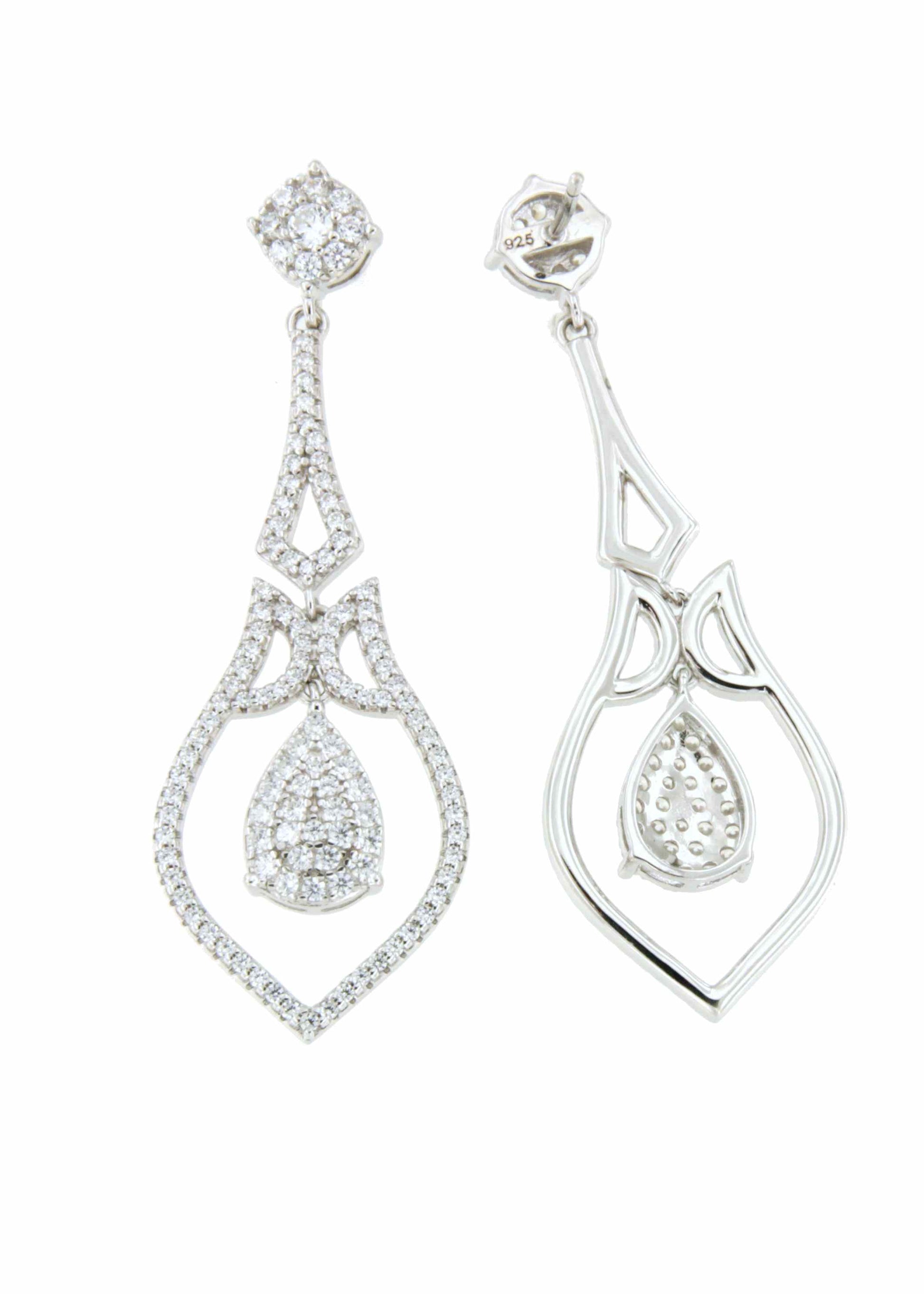 Its shape features an elongated structure with a teardrop-shaped outline, enhanced with multiple cubic zirconia stones that provide an elegant and distinguished sparkle. A drop-shaped pendant stands out in the center, giving it a dynamic and dynamic look.