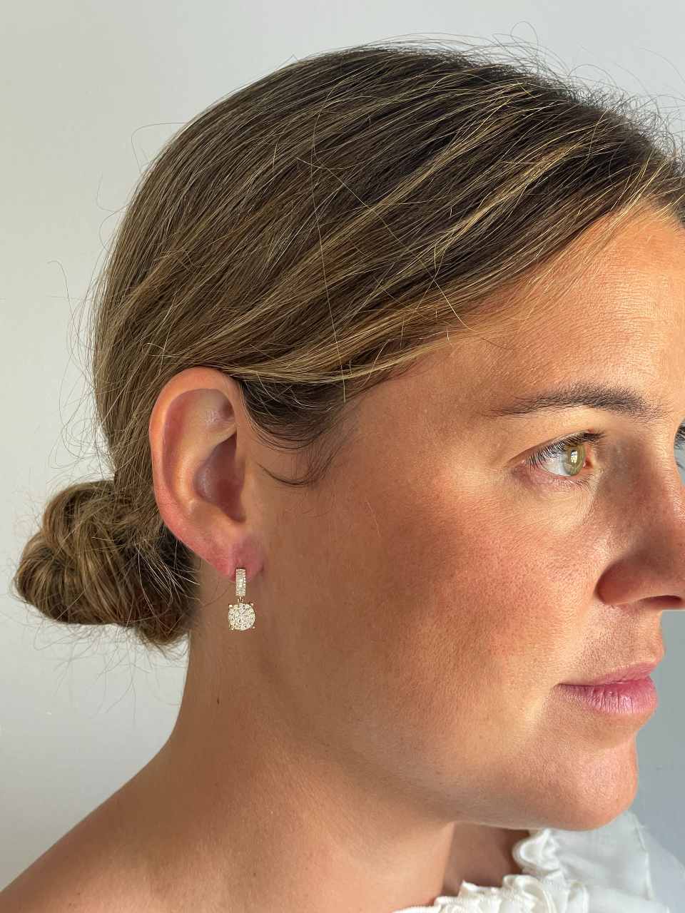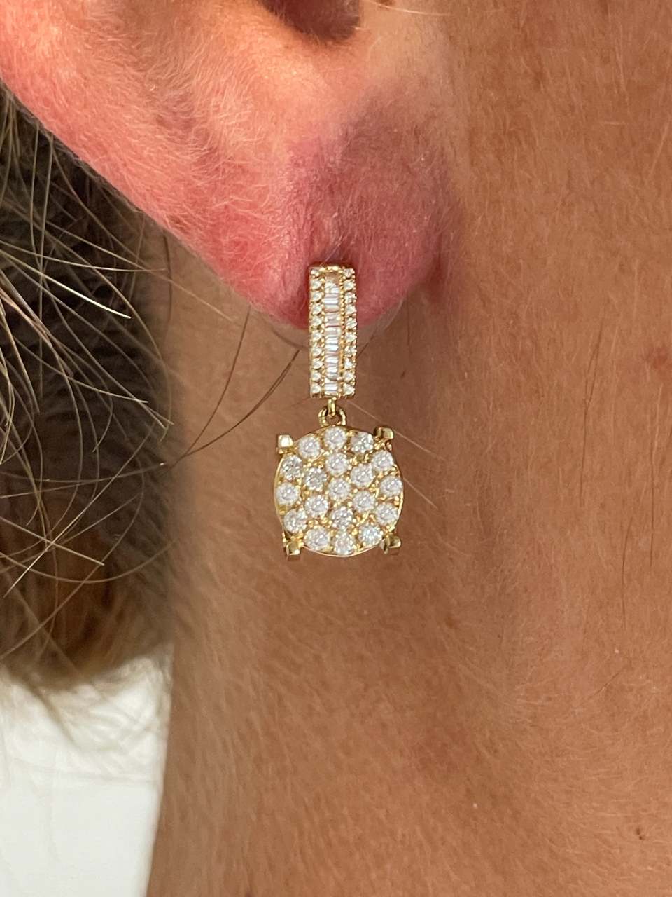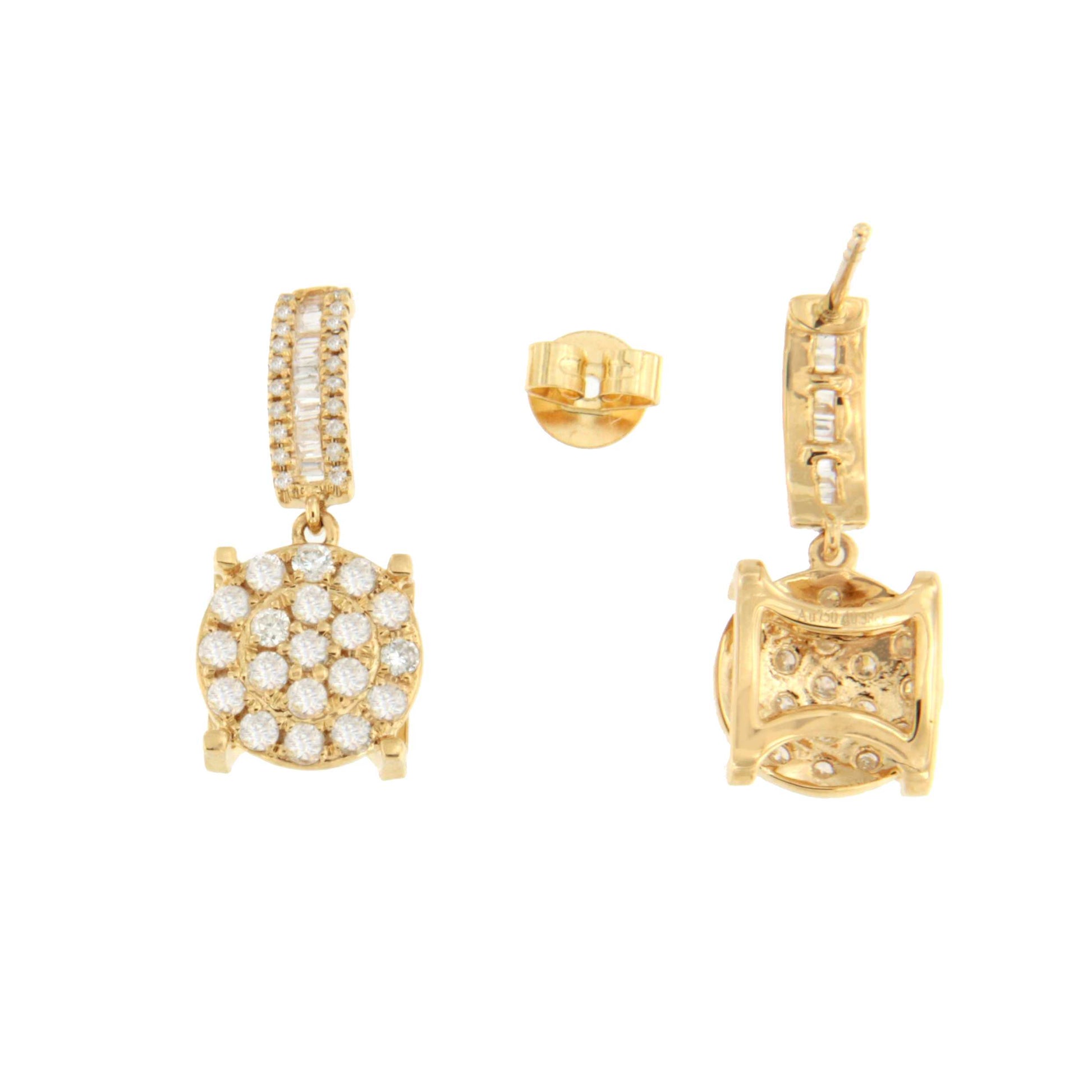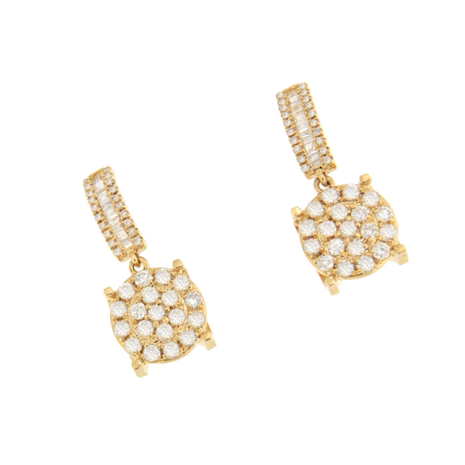 MORERA are long earrings with a half-hoop head set with diamonds and baguettes, from which a rosette of diamonds hangs on four prongs. Made in 18k gold.