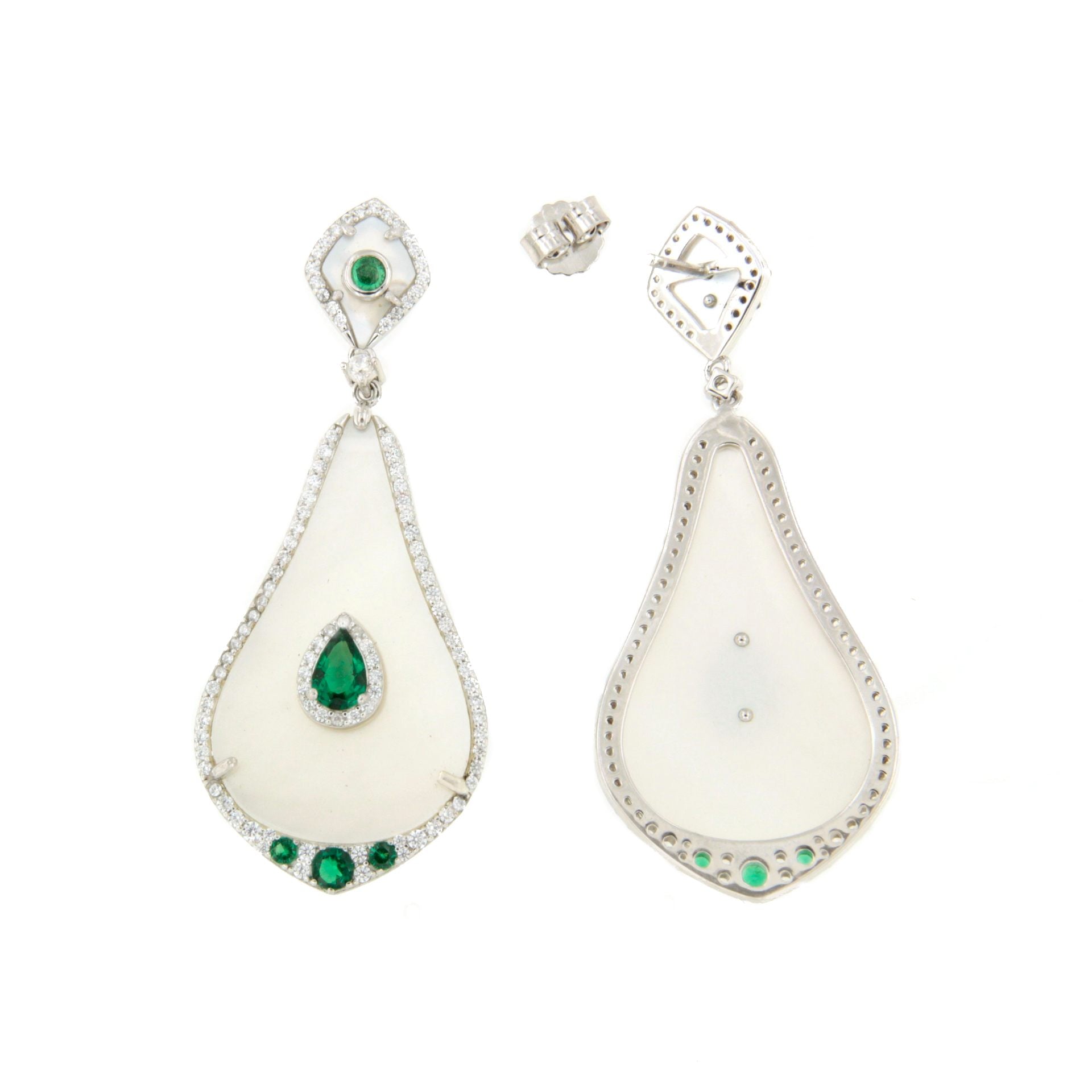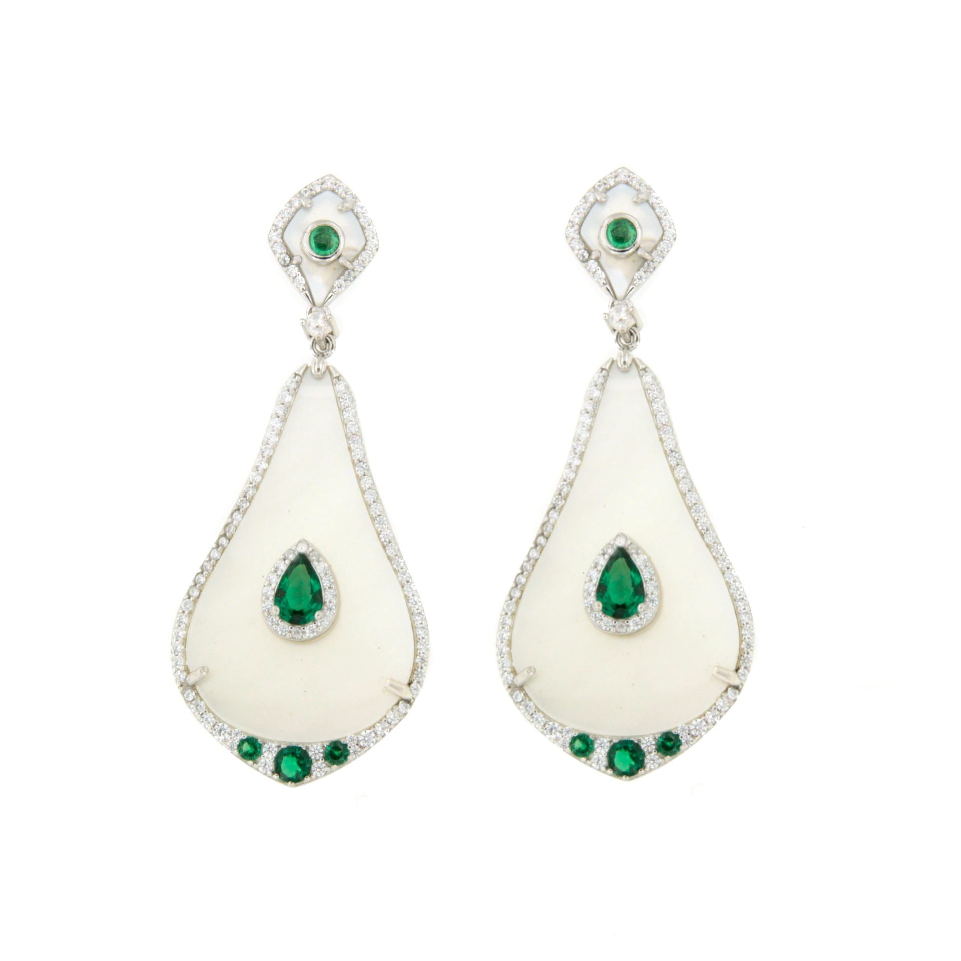 NAELLE are large earrings, very flattering for special events. They are made of sterling silver with a rhodium plating. Their inverted teardrop design combines a mother-of-pearl base with a border of white and green cubic zirconia stones that highlights their elegant silhouette.