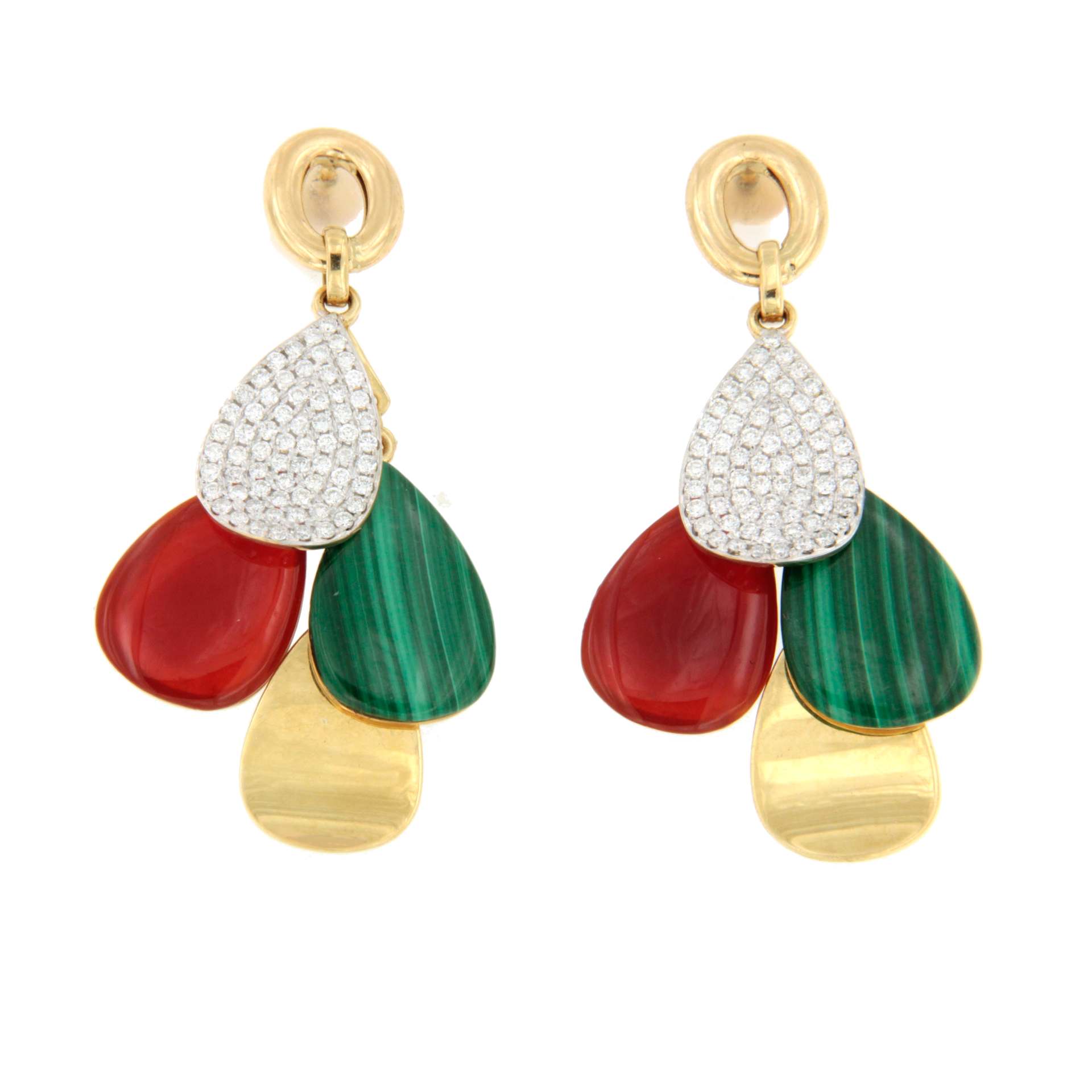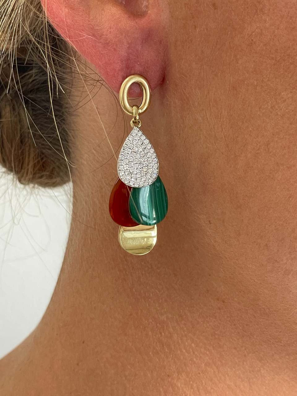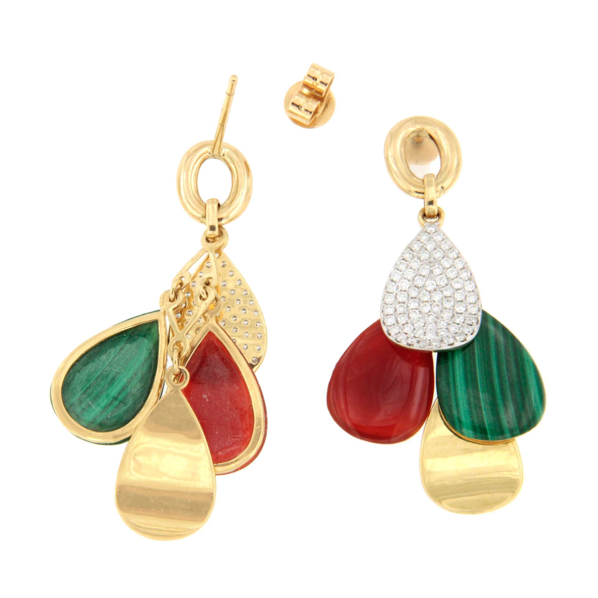 NISPERO is a wonderful earring with a very original design, made of 18k yellow gold . It is a hoop from which hang teardrop-shaped pendants in plain gold, malachite, agate, and white gold with diamonds.