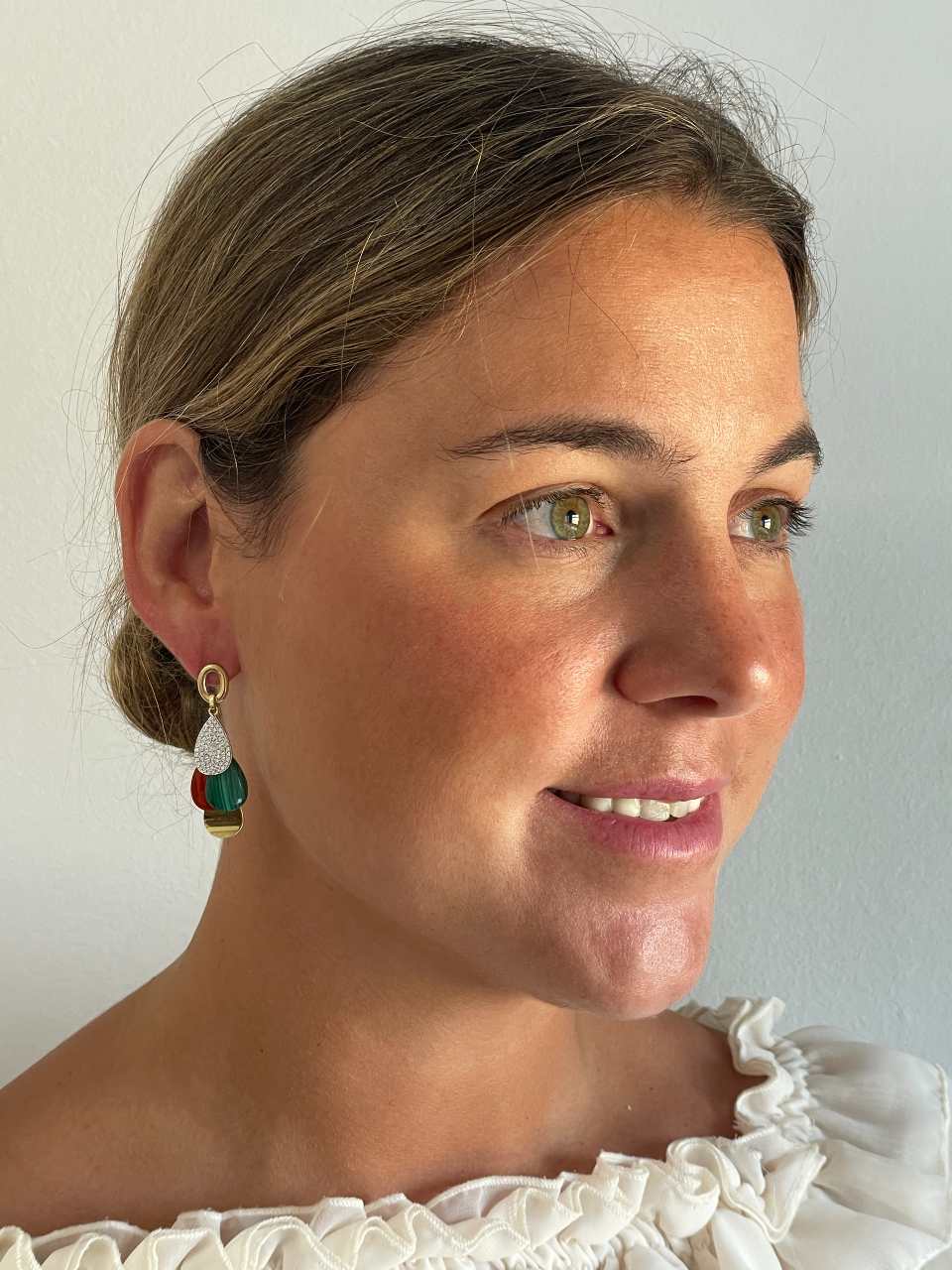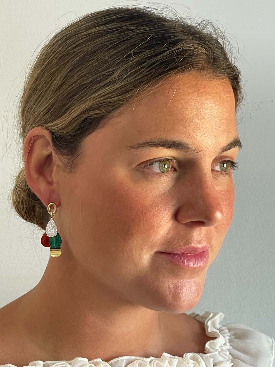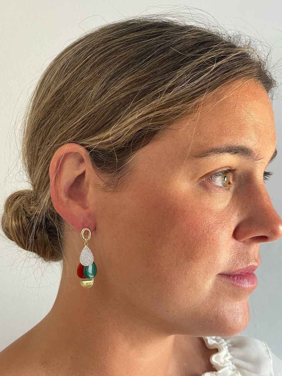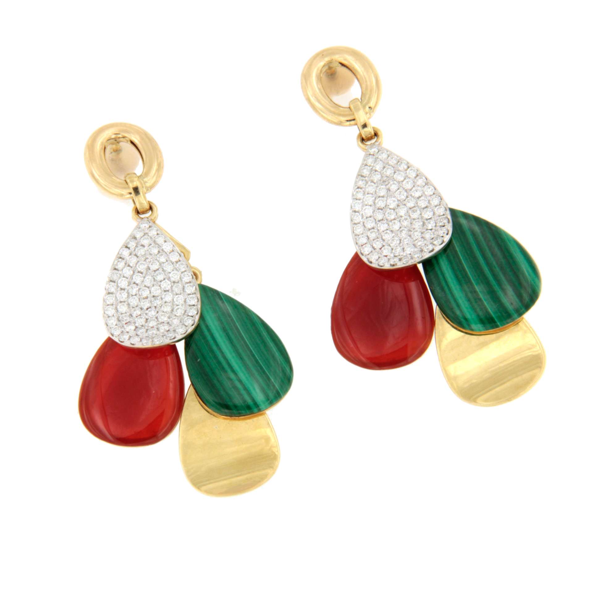 NISPERO is a wonderful earring with a very original design, made of 18k yellow gold . It is a hoop from which hang teardrop-shaped pendants in plain gold, malachite, agate, and white gold with diamonds.