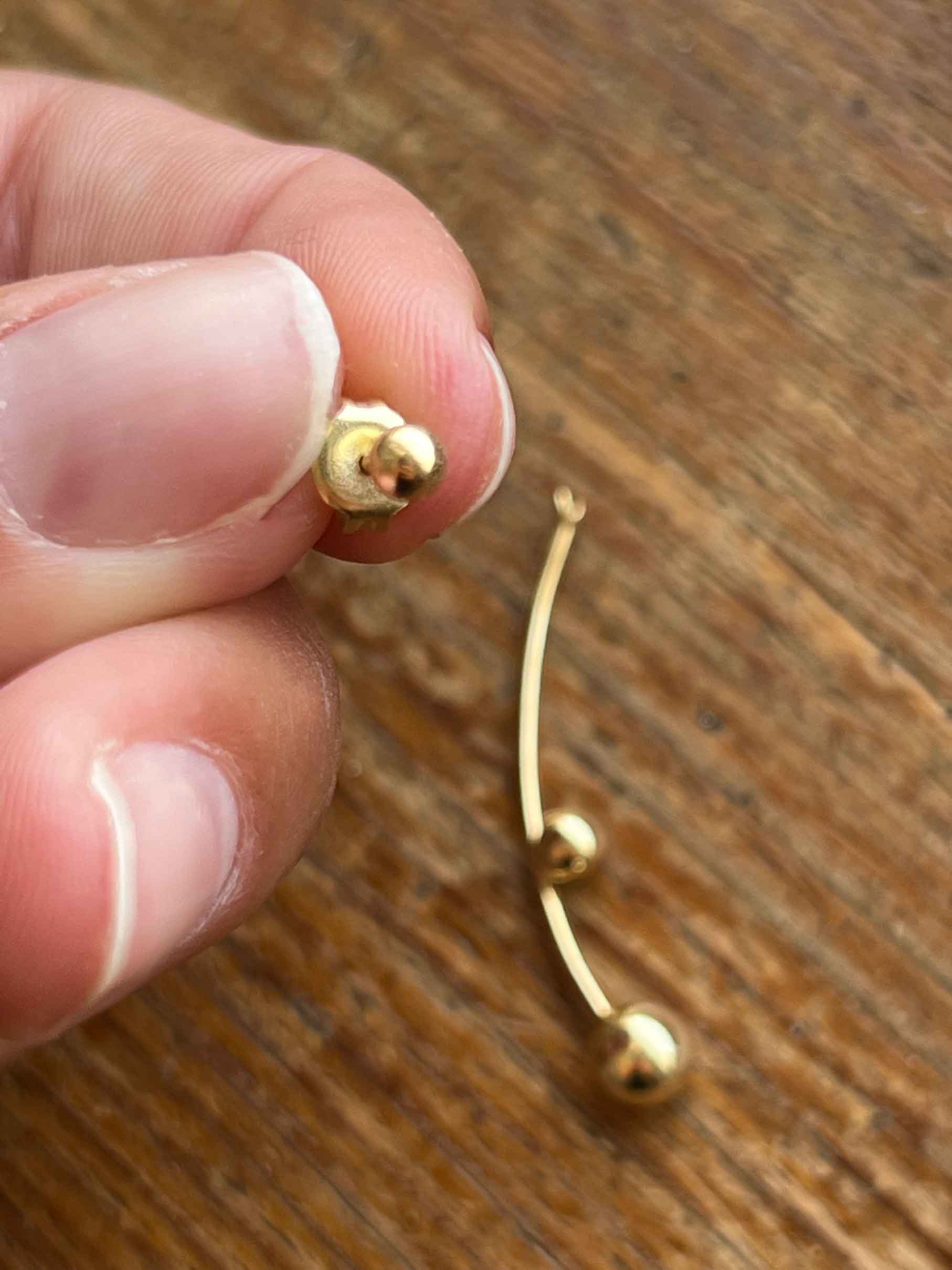 An oval-shaped bar features three beads that decrease in size from the bottom to the top. This earring is made of sterling silver with a yellow gold plating . It is 4 cm long and has a push-back closure.