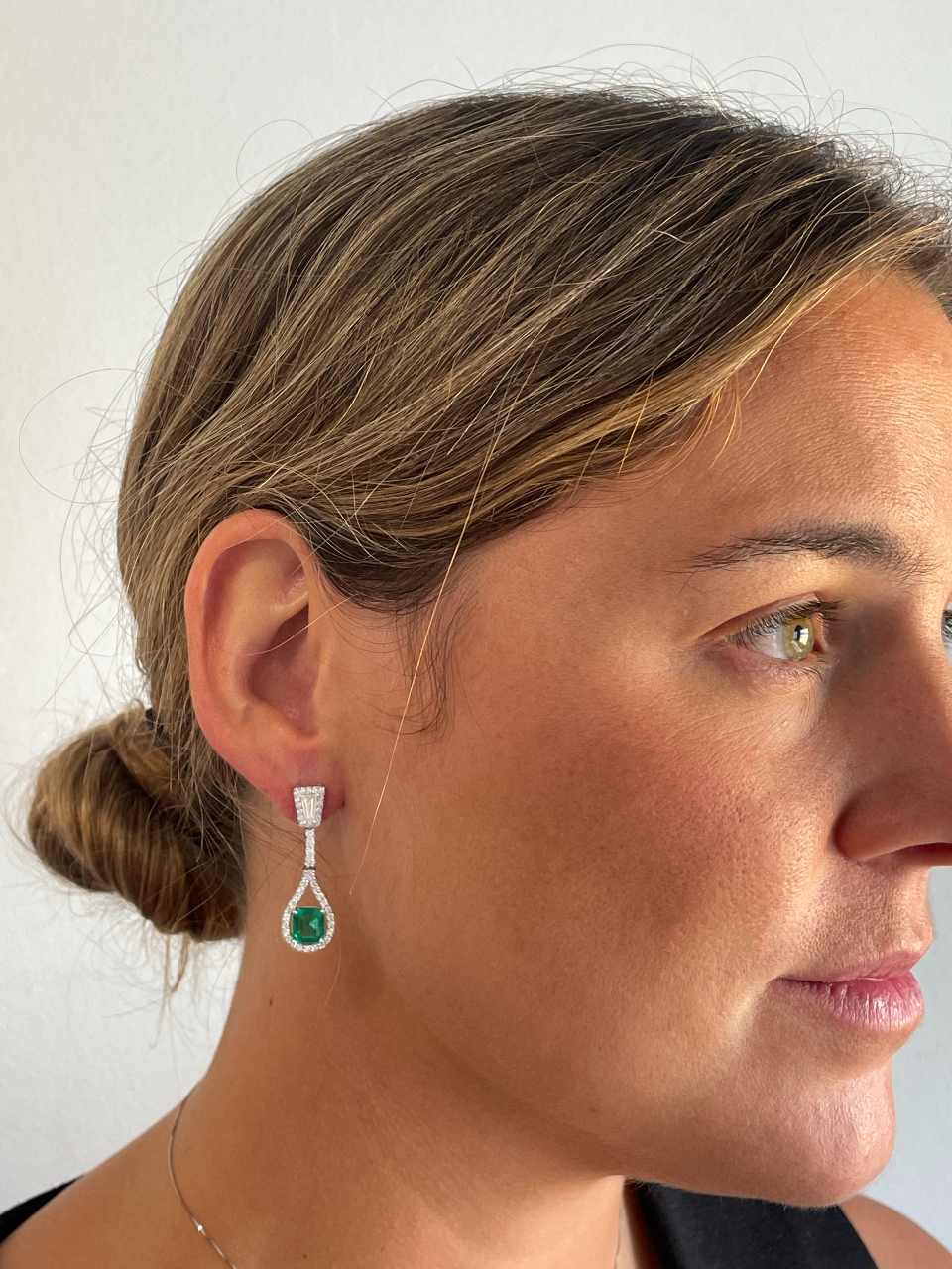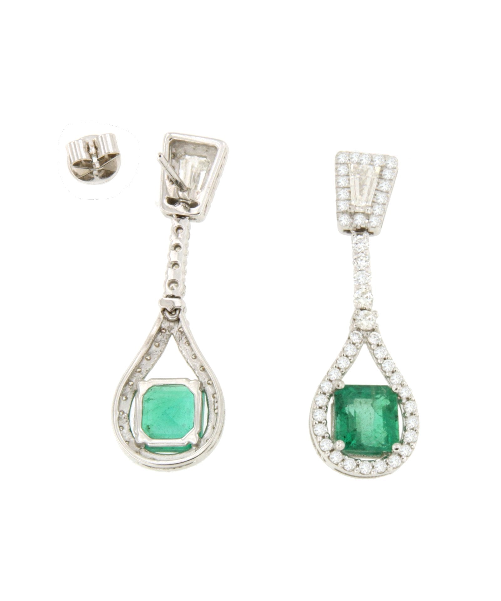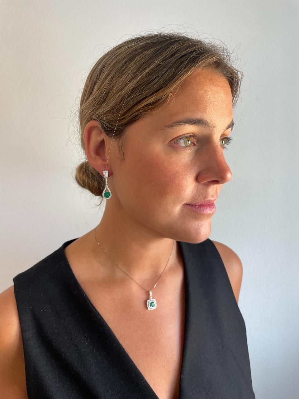 Precious gem: 2 trapezoid cut diamonds 0.63 carats and 100 brilliant cut diamonds 1.21 carats and 2 Colombian emeralds emerald cut 3.29 carats.