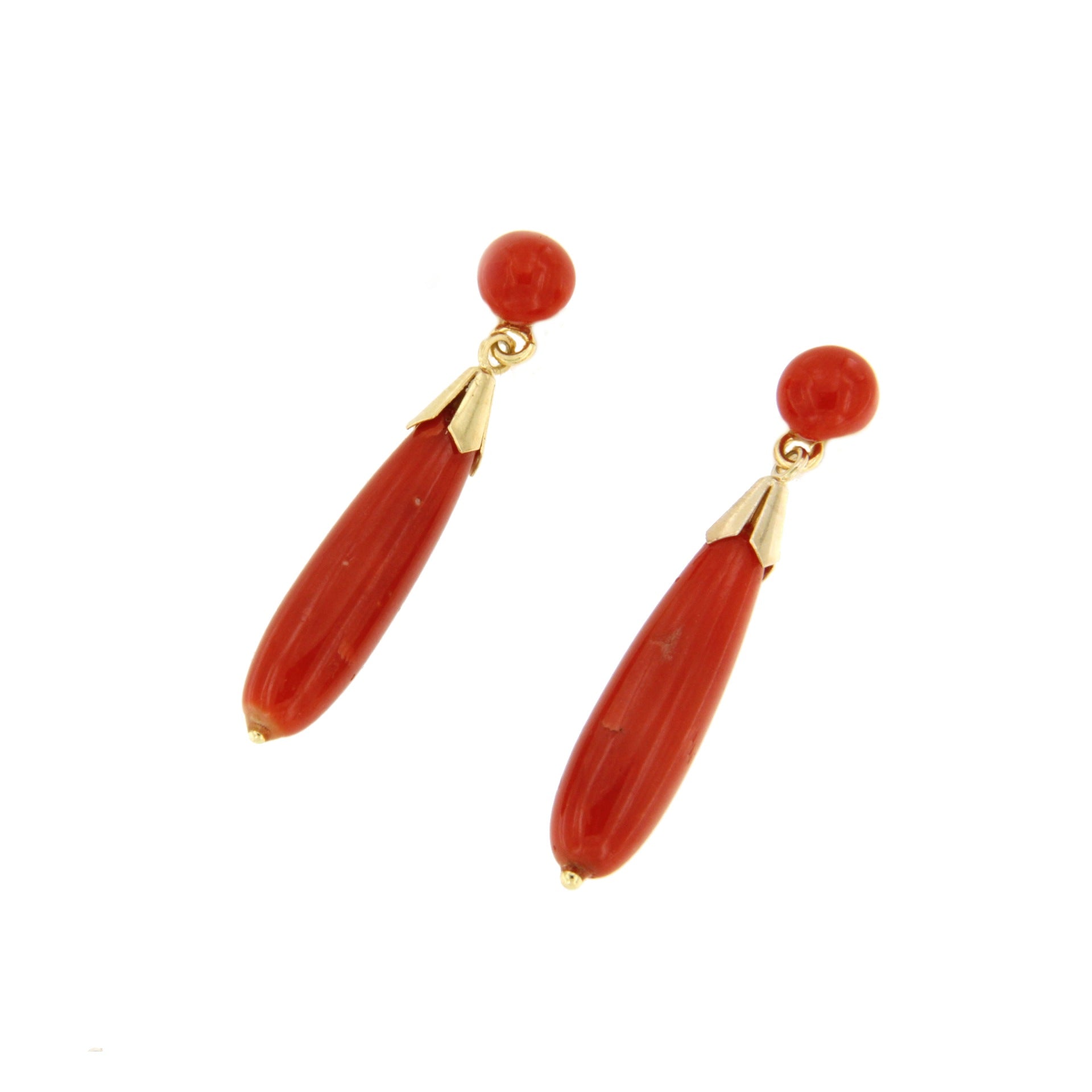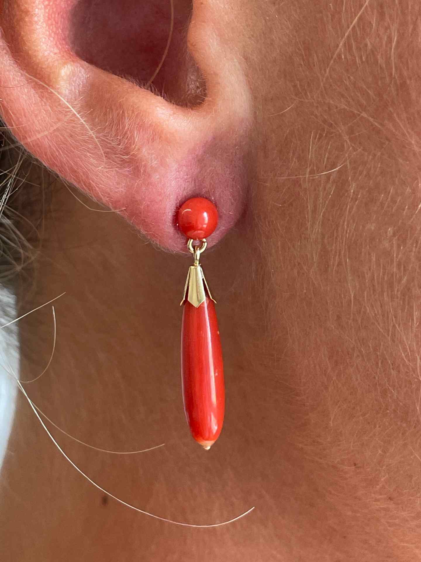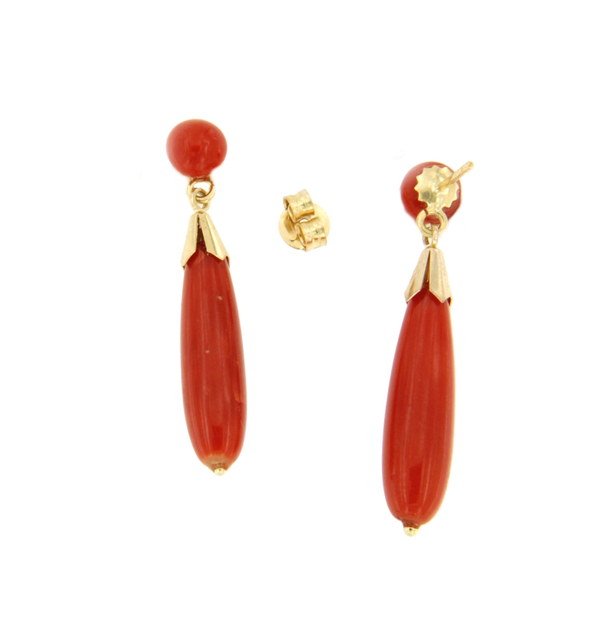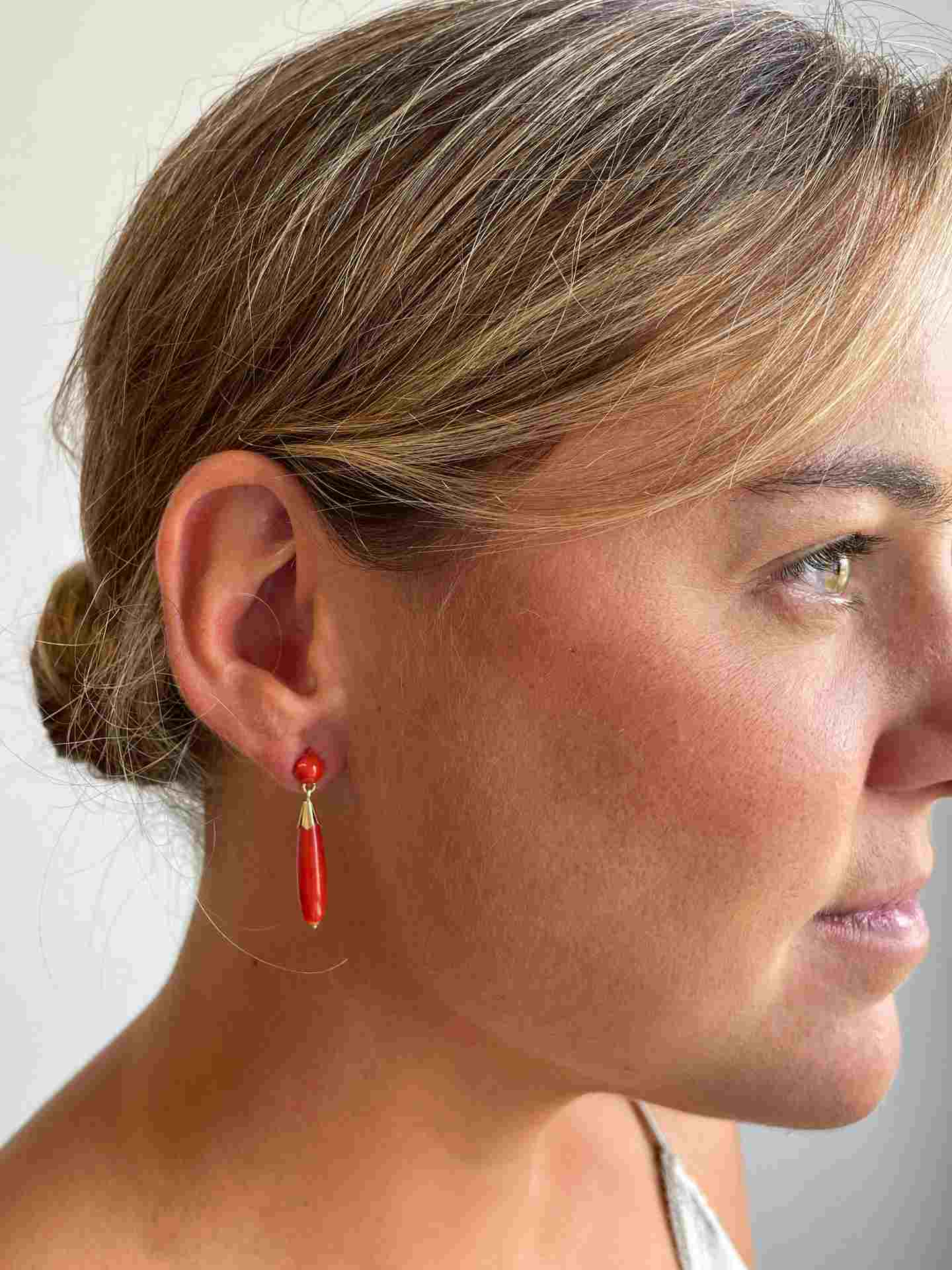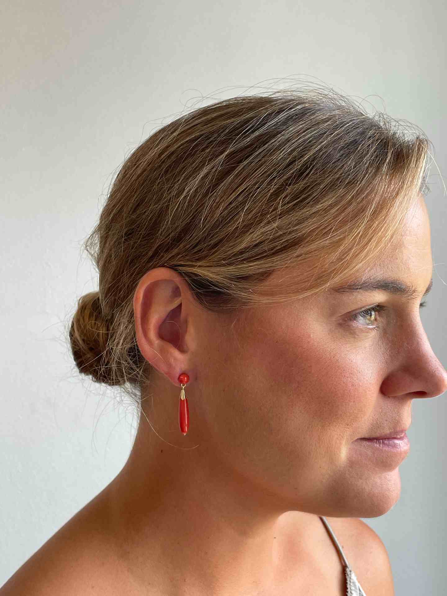The Polynesian earrings are an elegant and refined design , crafted in 18-karat gold and adorned with natural coral in a vibrant red hue. Their harmonious and distinguished design is ideal for special occasions, adding a touch of sophistication to any outfit.