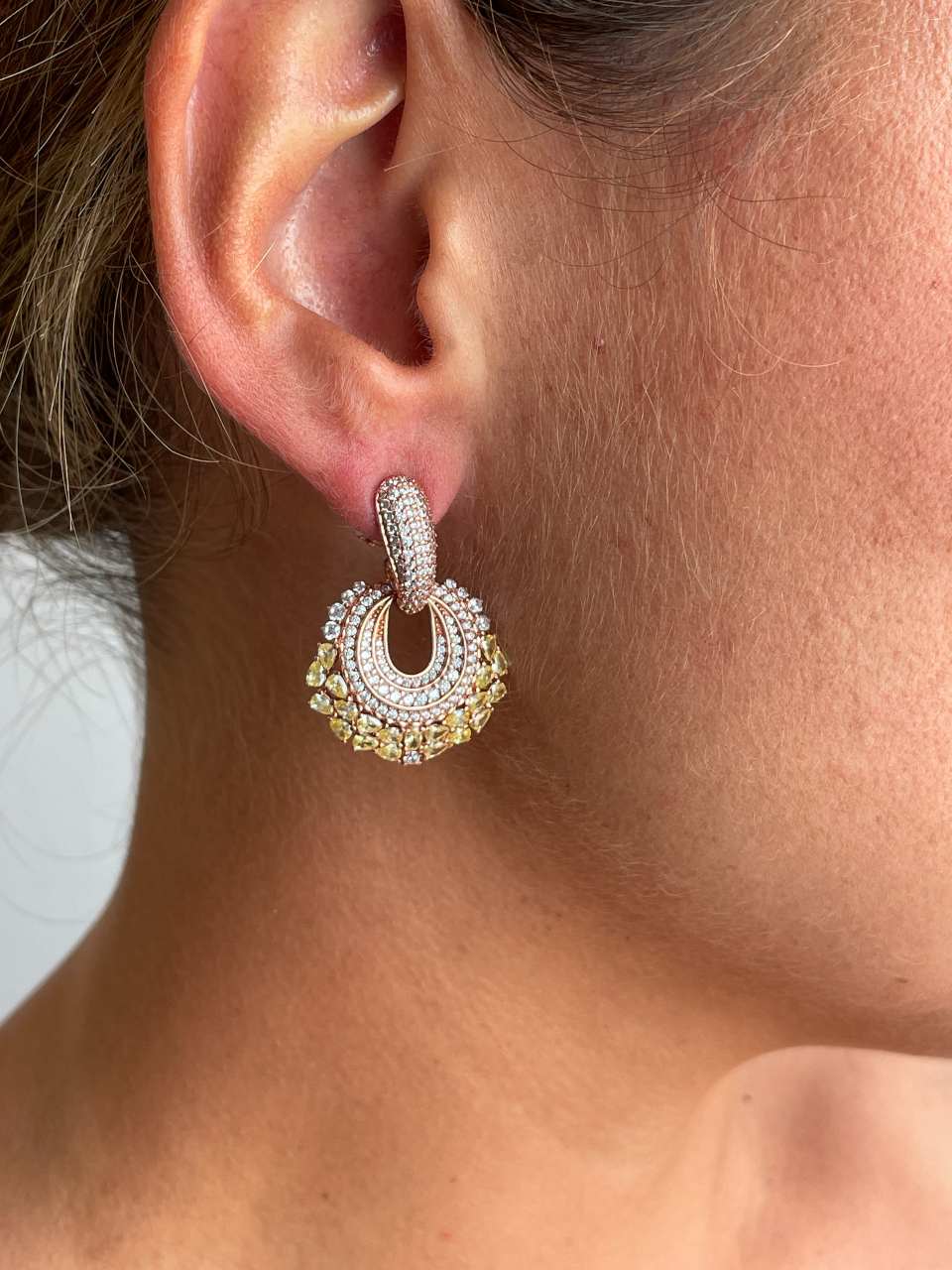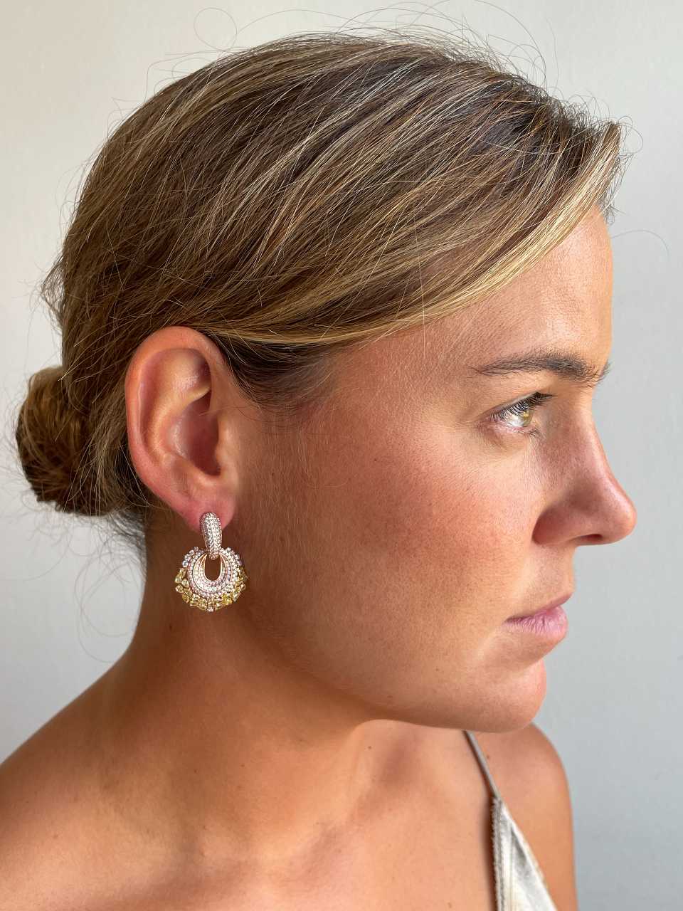 SALONIA is an earring with cubic zirconia and quartz , crafted in sterling silver with a rose gold finish . It has an Italian flair, very fashionable right now.