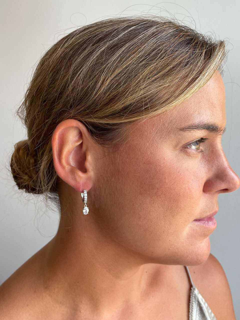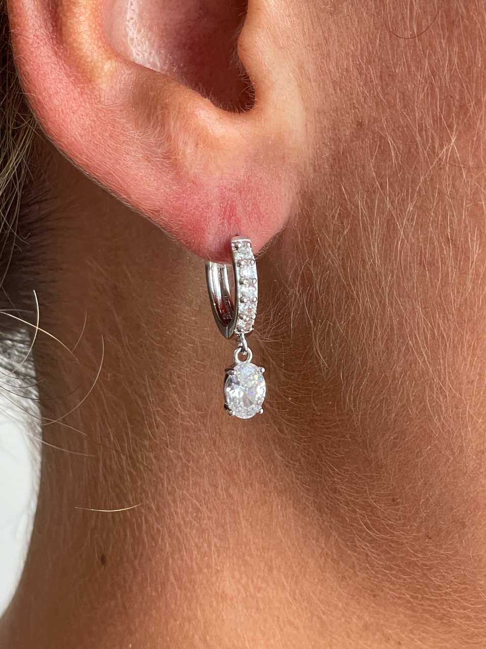 SAMOA is an oval dangle hoop earring with cubic zirconia , crafted in sterling silver . Very versatile for everyday wear!