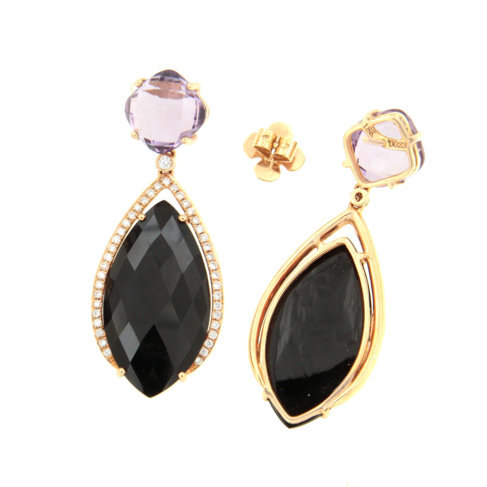 Exquisite long earrings in 18-karat rose gold with irregular stones in two sizes. They consist of a diamond-set hoop from which hangs a small ruby held by four prongs, and from which hangs a central rosette of irregularly faceted amethyst surrounded by rubies.