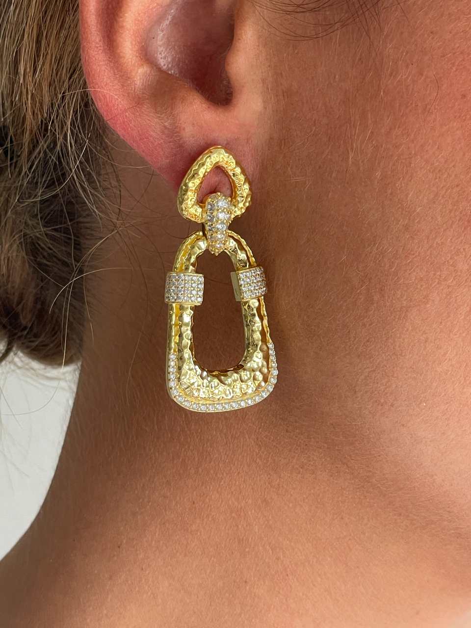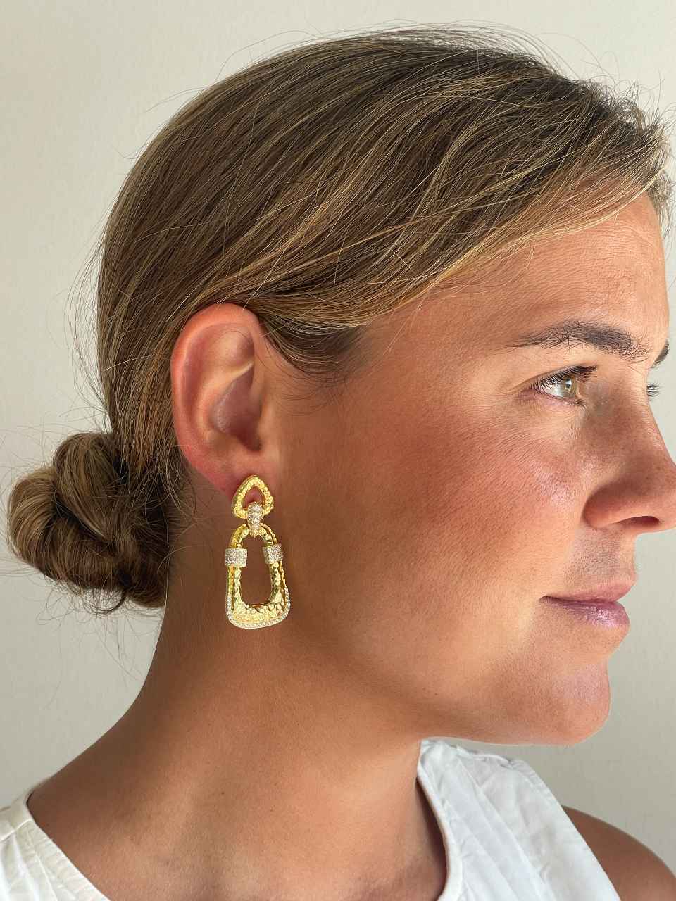 TAHIRA earrings, in sterling silver plated in 18-karat gold with a textured finish and cubic zirconia stones.