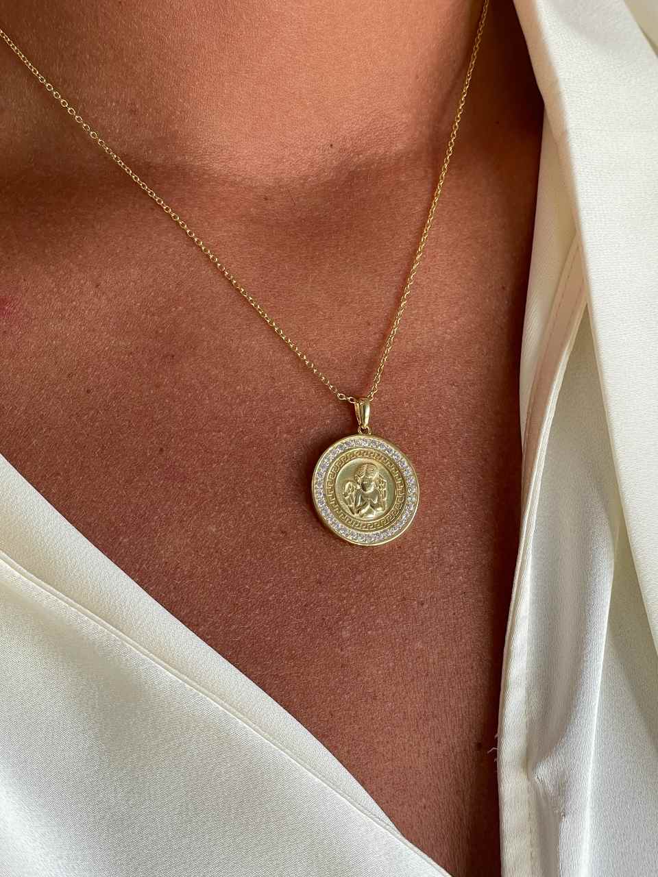 PROVIDENCIA is a necklace with a medal featuring the image of a guardian angel in sterling silver with an 18k gold plating and cubic zirconia.