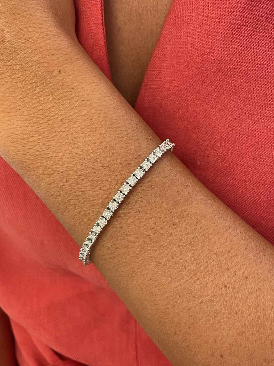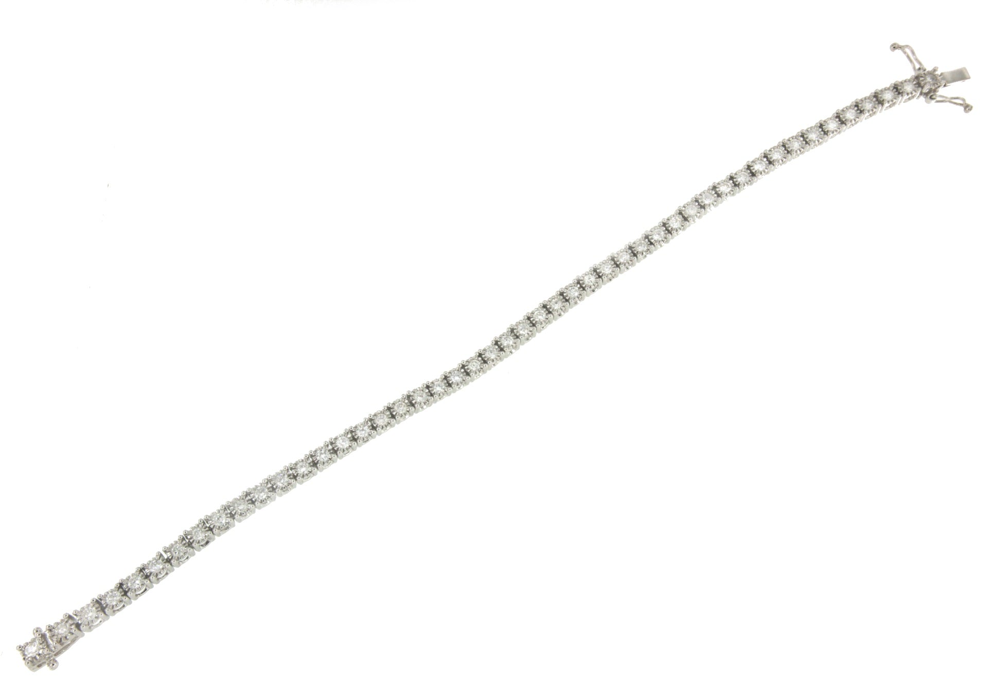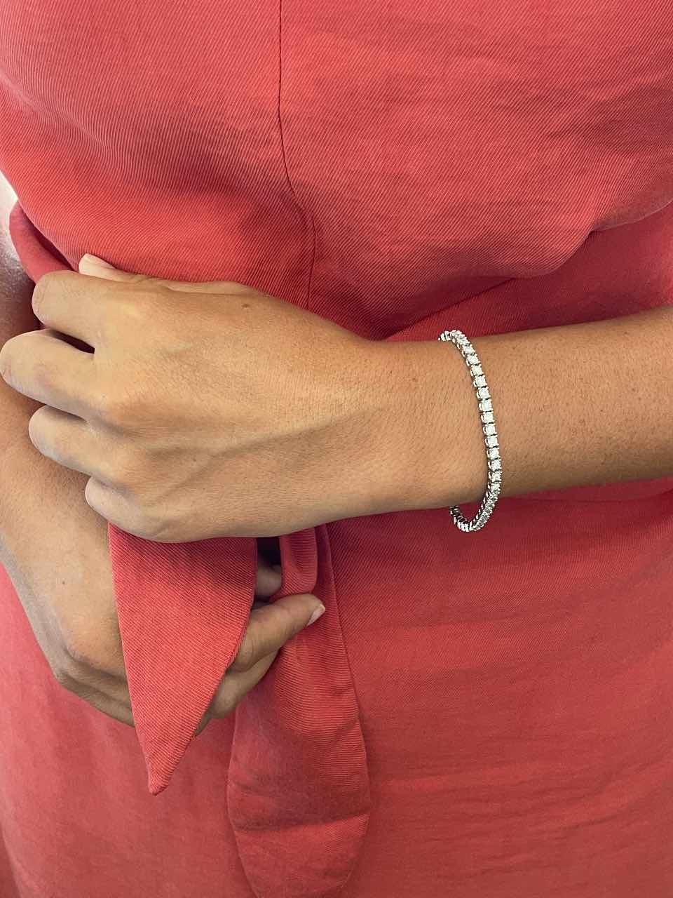 EVORA , a classic diamond rivière bracelet design, set in 18-karat white gold. The diamonds are prong-set with centers interspersed between the four prongs to enhance their size.