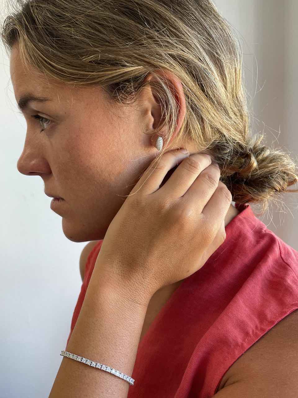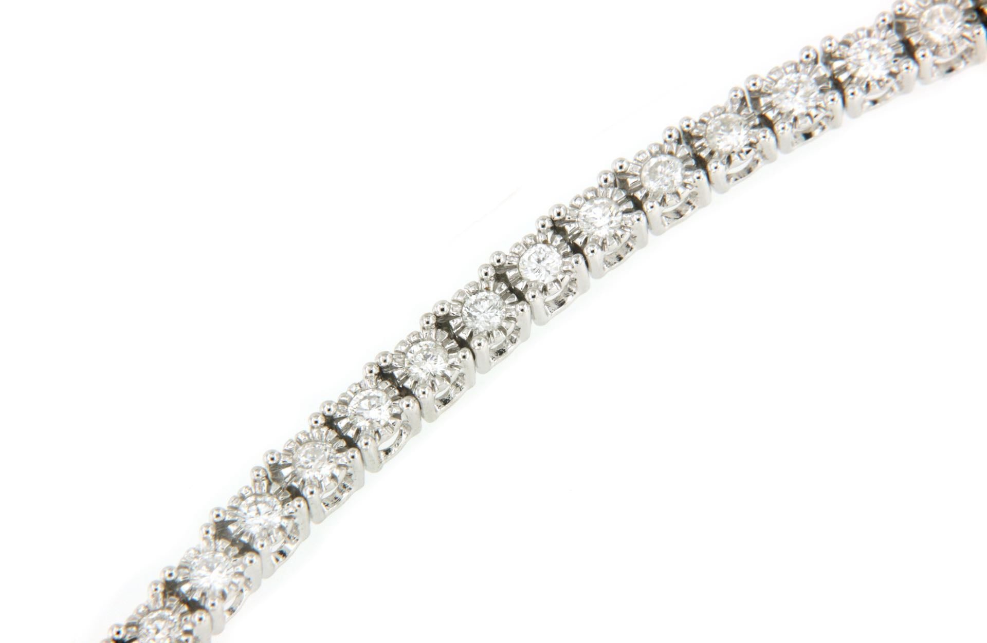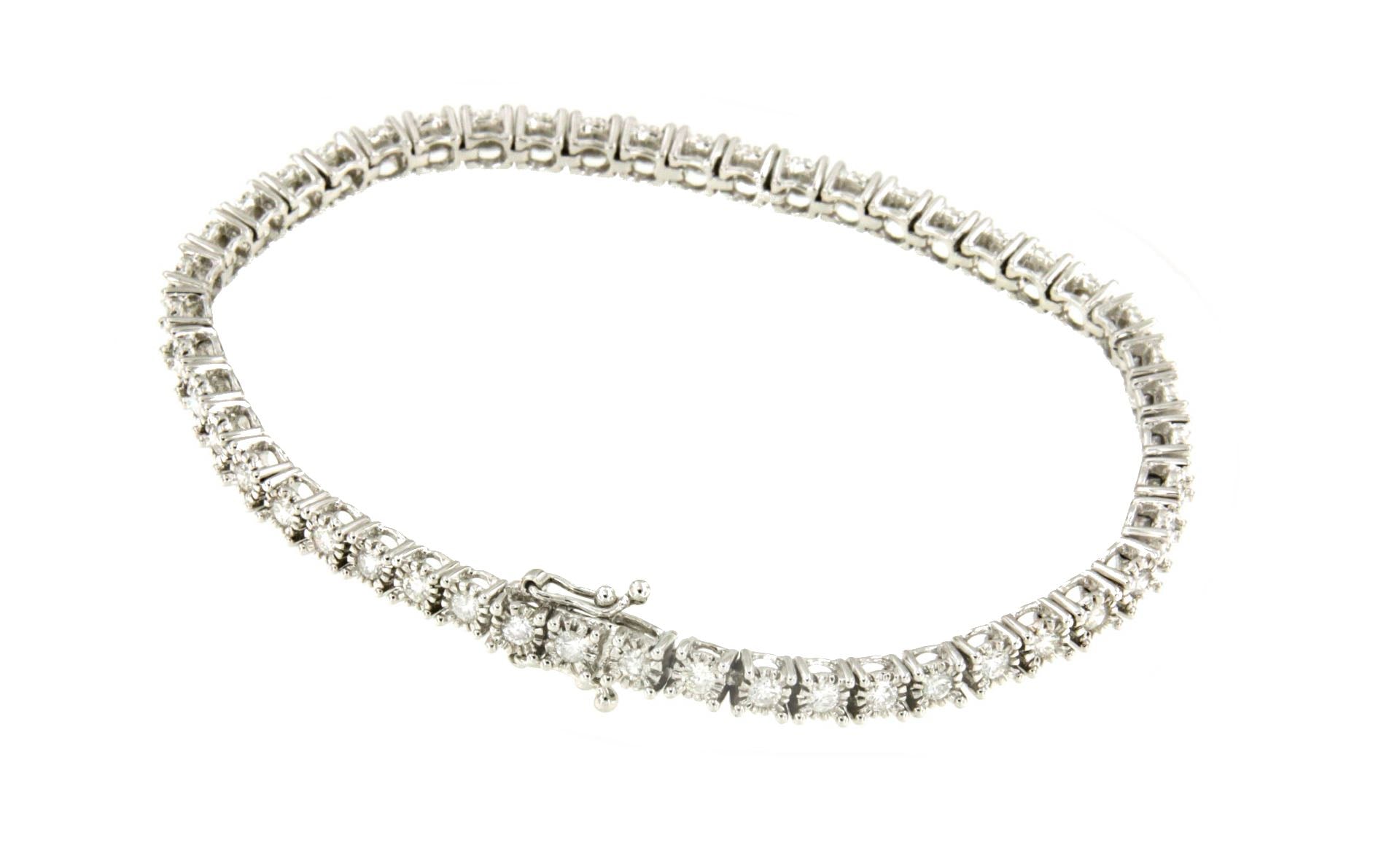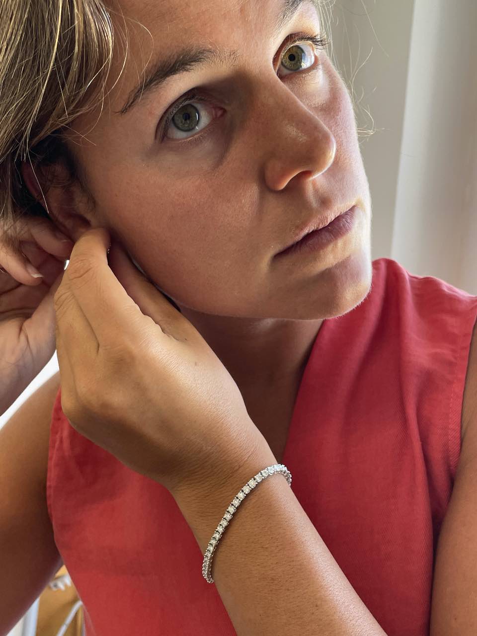EVORA , a classic diamond rivière bracelet design, set in 18-karat white gold. The diamonds are prong-set with centers interspersed between the four prongs to enhance their size.