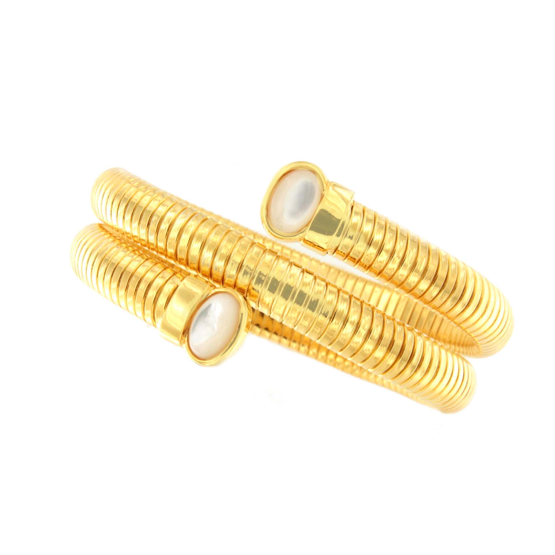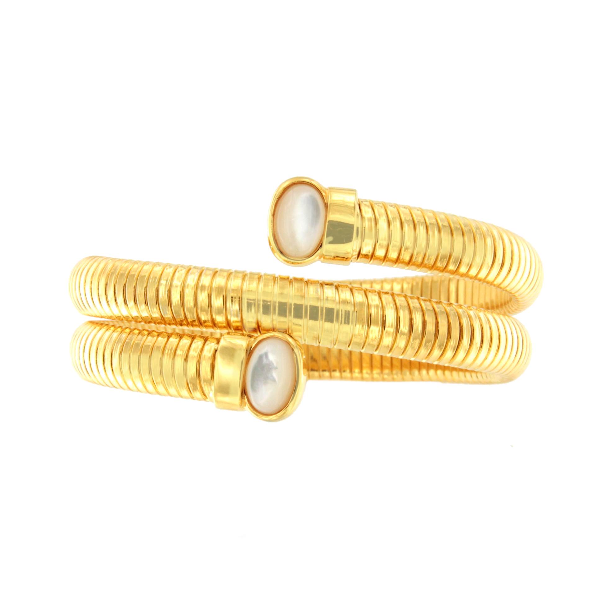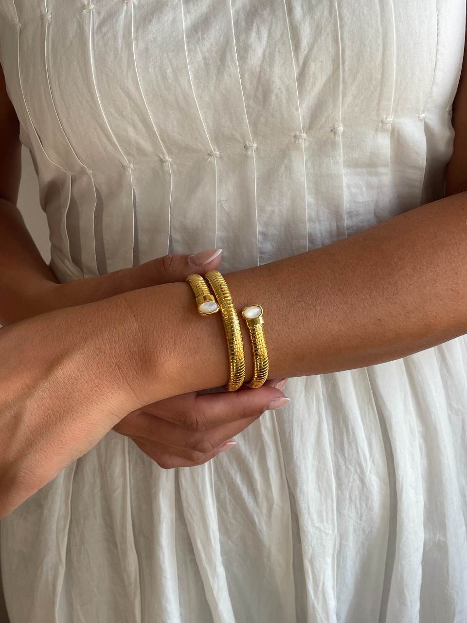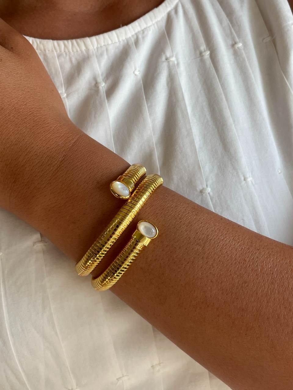 With its wide design, enhanced by delicate mother-of-pearl stones , this piece becomes a true statement piece, ideal for wearing with white or black dresses, both at summer events and more formal occasions. You can wear it alone as a bracelet or combine it with other accessories for a more sophisticated look.