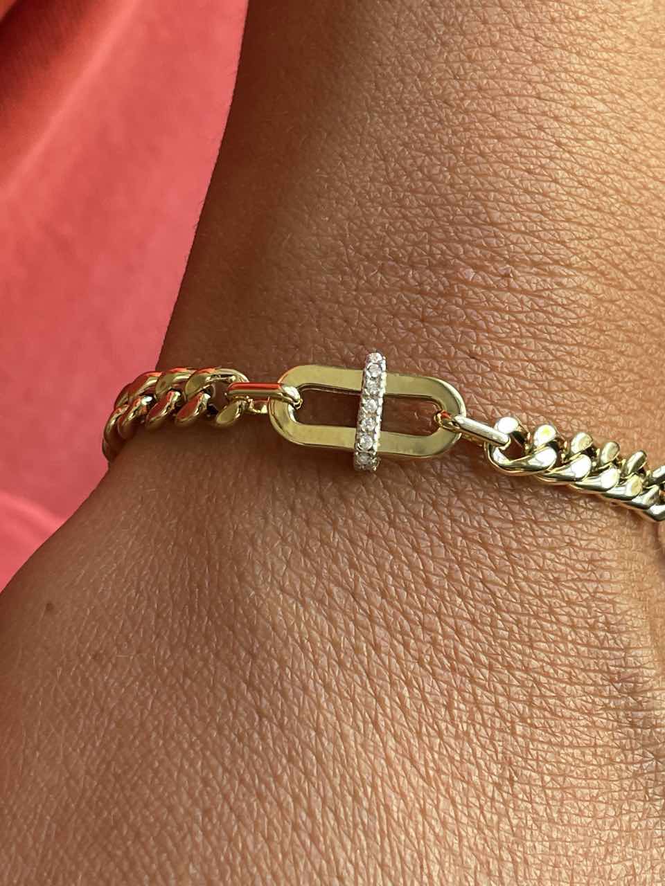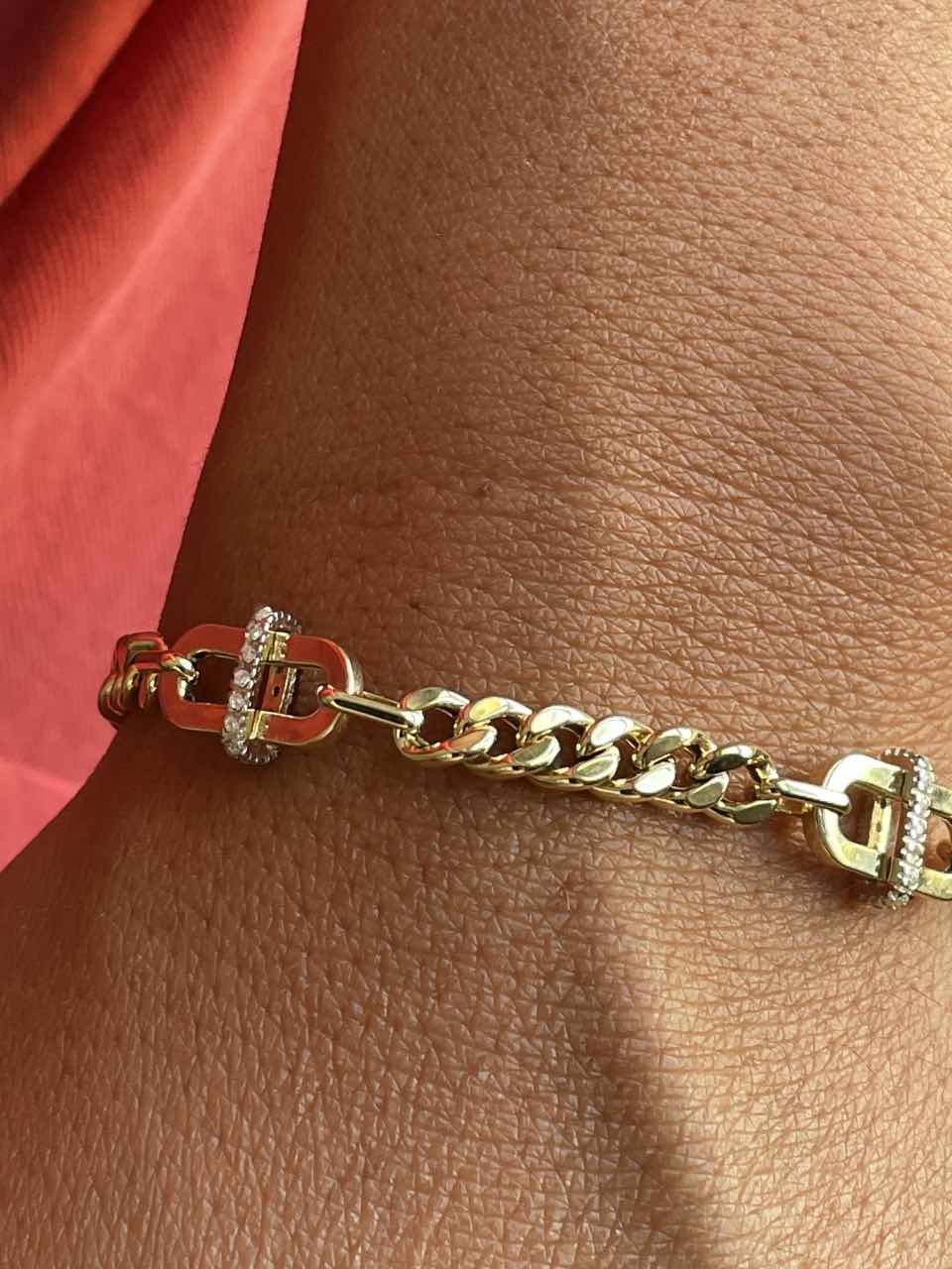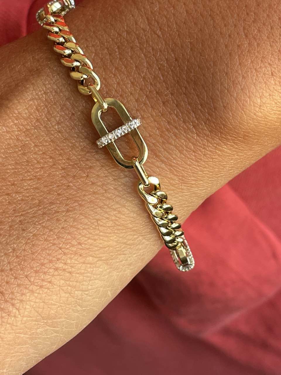 SINTRA is a classic curb bracelet , with rhodium-plated white spacers and cubic zirconia , all mounted in 18-karat yellow gold.