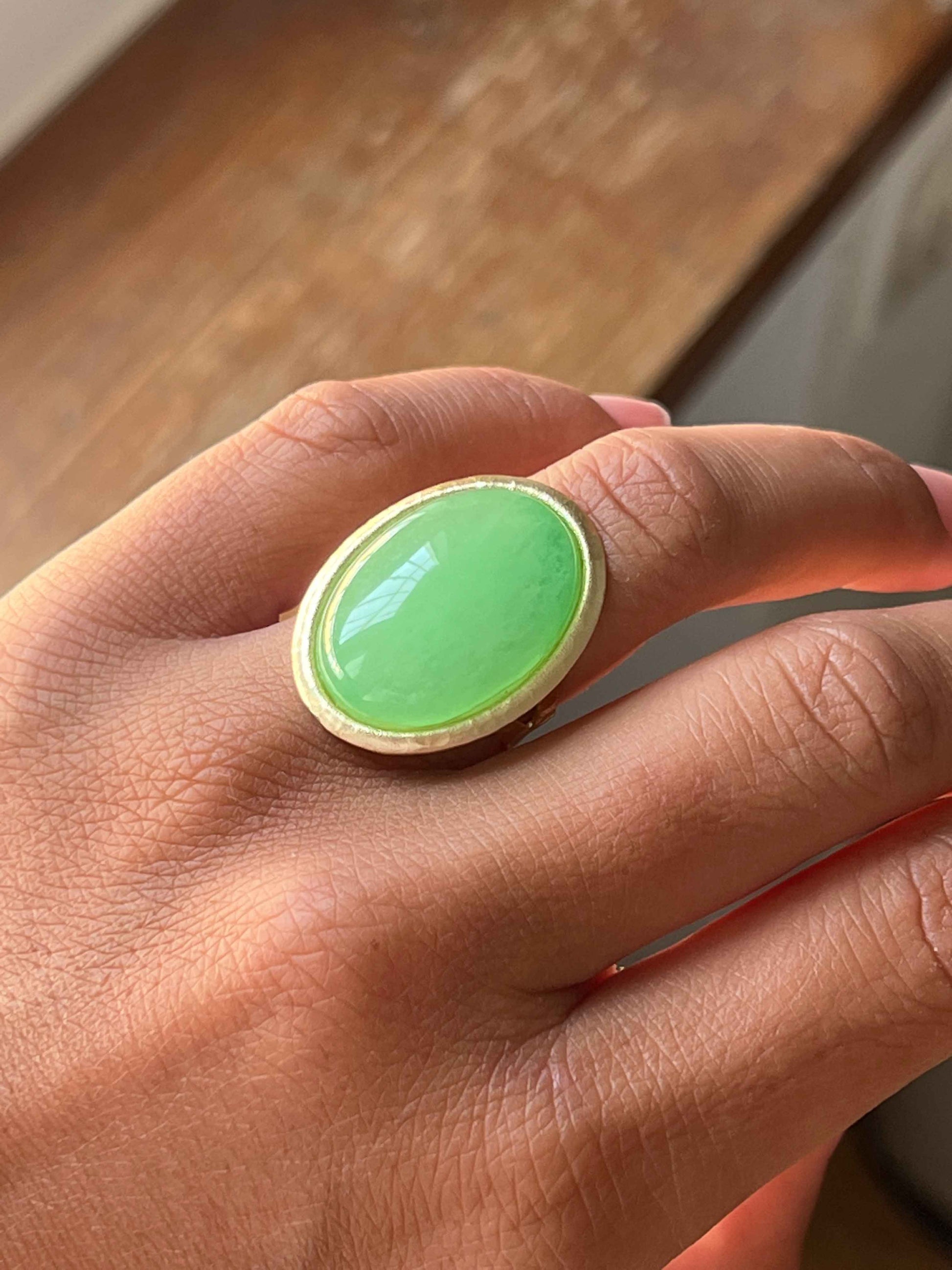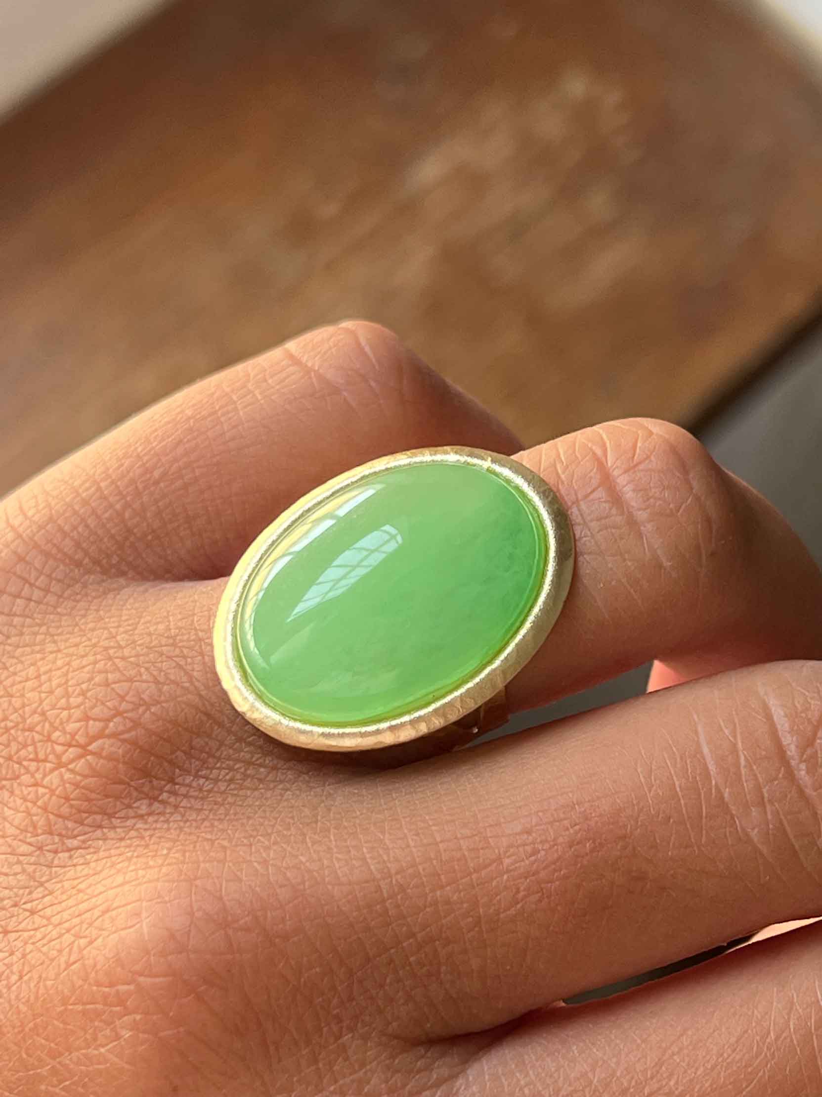 Sterling silver ring with 18kt yellow gold plating in a matte finish, featuring a central oval green quartz. The stone is bezel-set and cabochon-cut. This piece measures 3 cm in width.