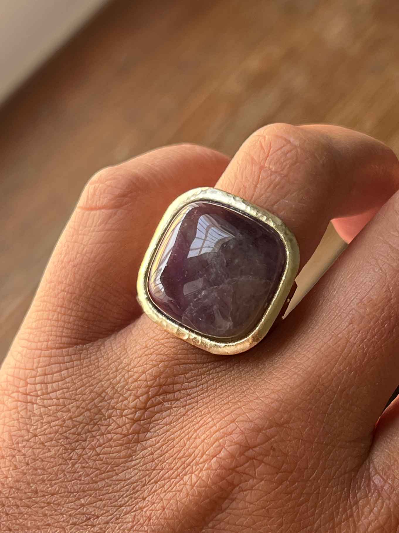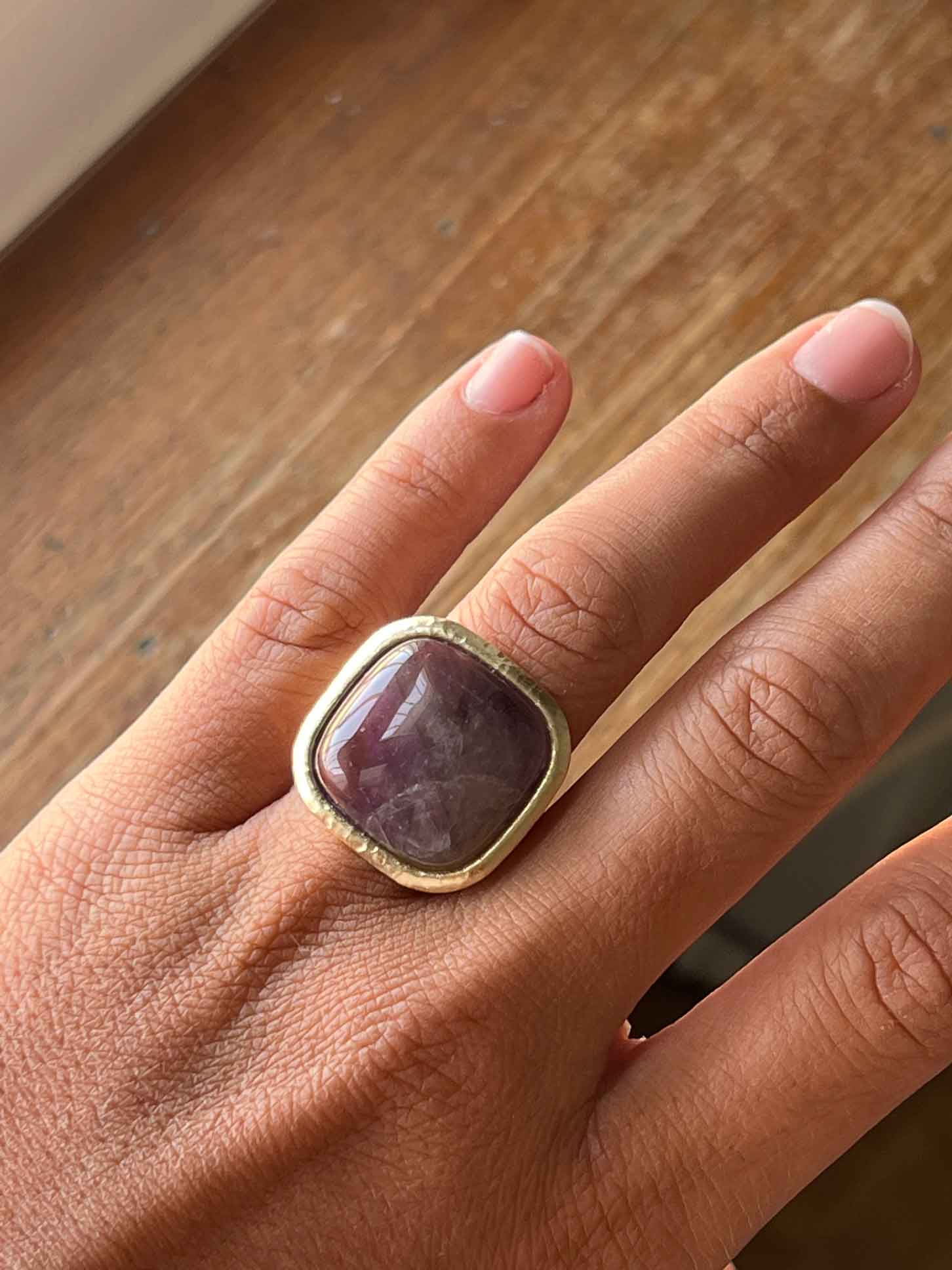Sterling silver ring with 18kt yellow gold plating in a matte finish, featuring a square amethyst center stone. The stone is bezel-set and cabochon-cut. This piece measures 2.50 cm in width.