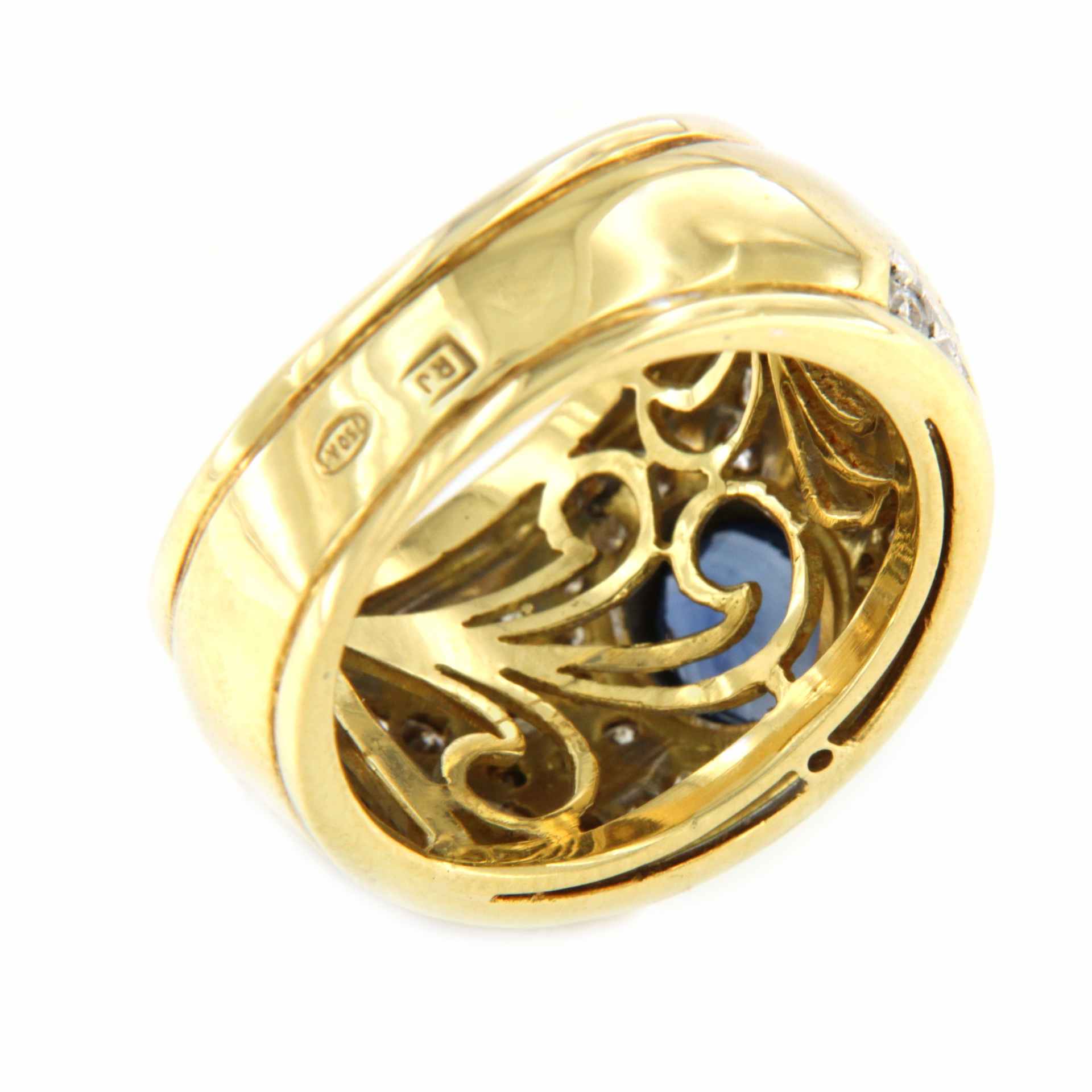 Our PRIOR engagement ring is crafted from 18-karat gold and features a central sapphire surrounded by brilliant-cut diamonds . Its vintage design and striking appearance make it perfect for an anniversary or engagement.