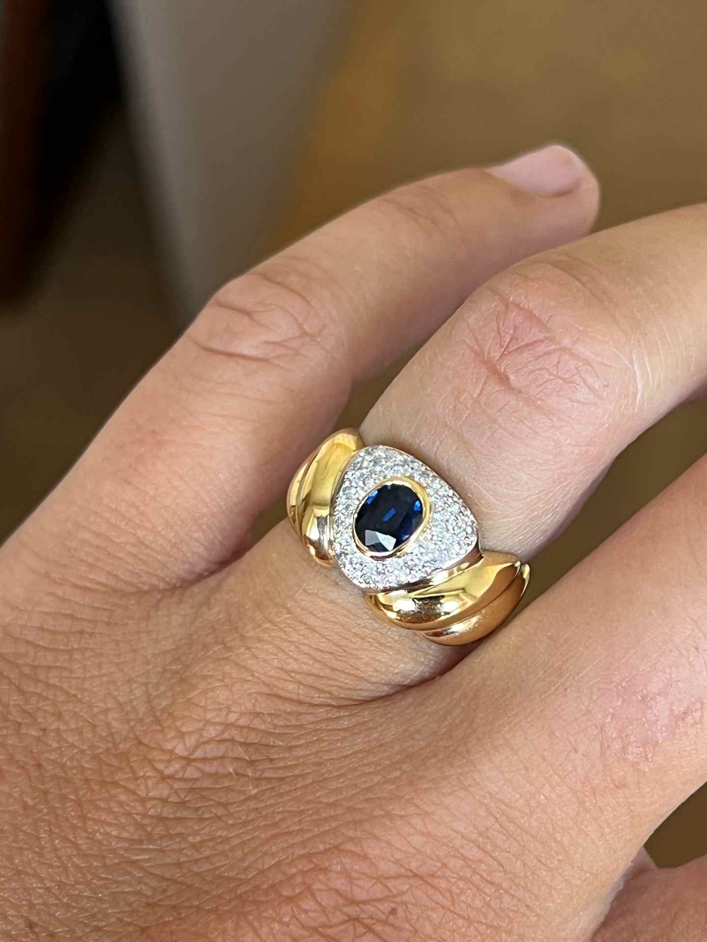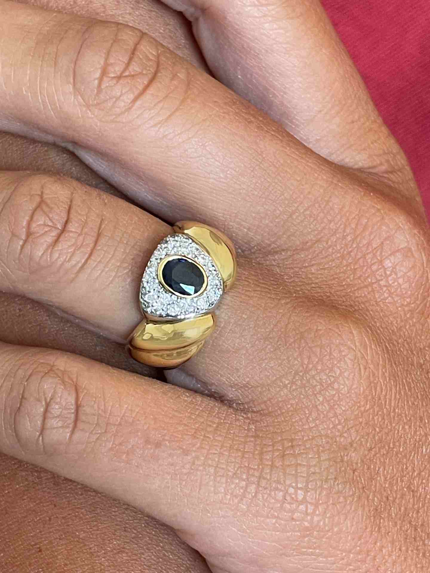 Our TWILIGHT ring is a unique and extraordinary piece thanks to its vintage design. It is crafted from 18-karat yellow gold and rhodium-plated white gold . This beautiful jewel features a central sapphire surrounded by 25 brilliant-cut diamonds .