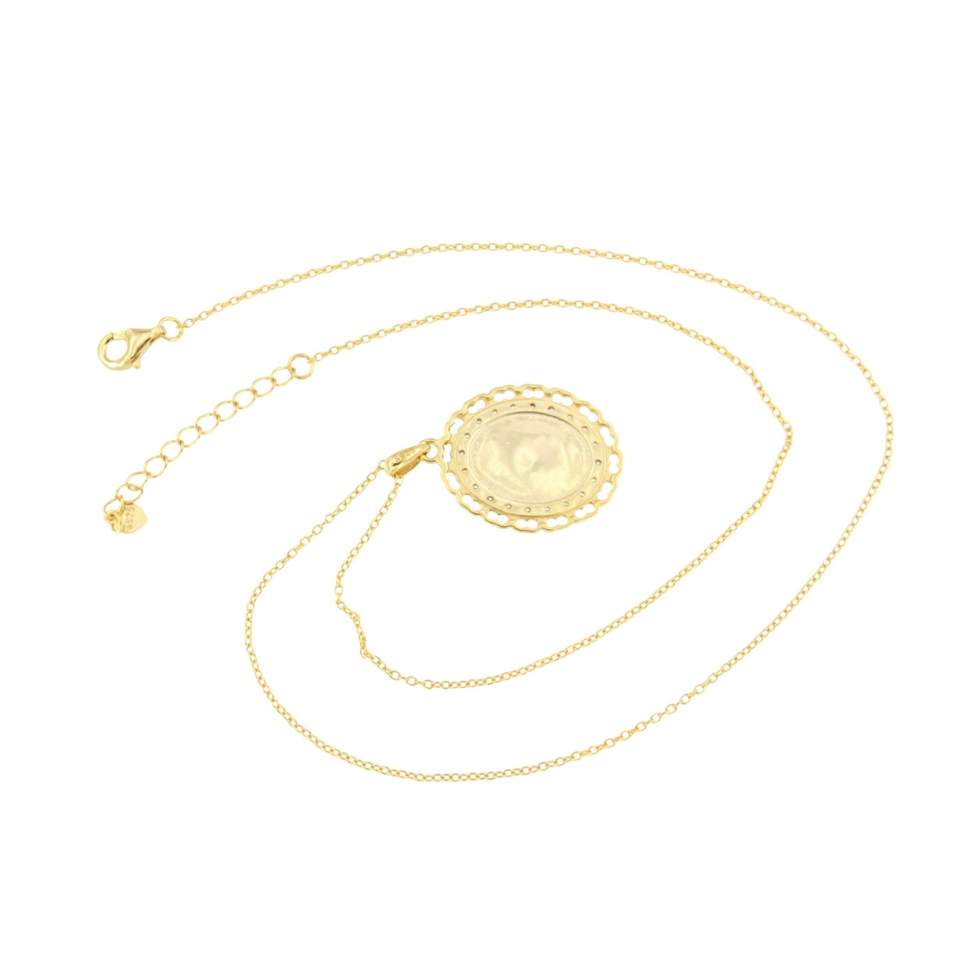 PROVIDENCIA is a necklace with a medal featuring the image of a virgin in sterling silver with an 18k gold plating and cubic zirconia.