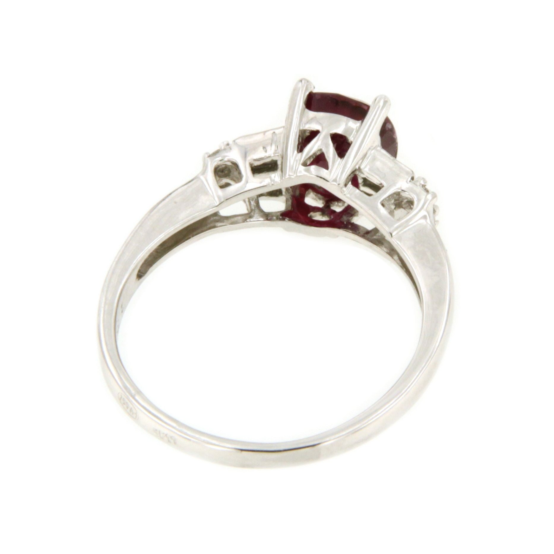 FERROL, es un anillo estilo clásico , realizado en oro blanco de 18 kilates con un centro de rubi natural con diamantes talla baguettes y brillantes a ambos lados. Precioso anillo para pedidas, aniversarios y ocasiones especiales.