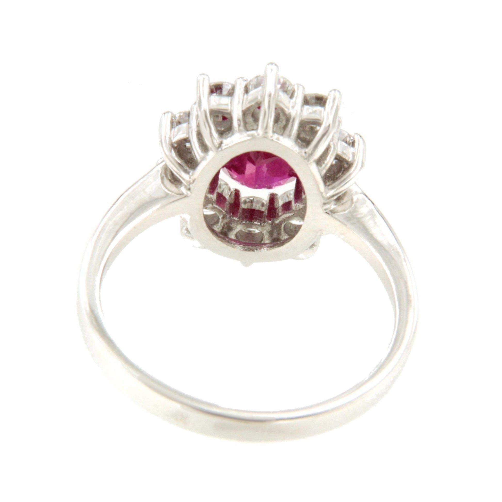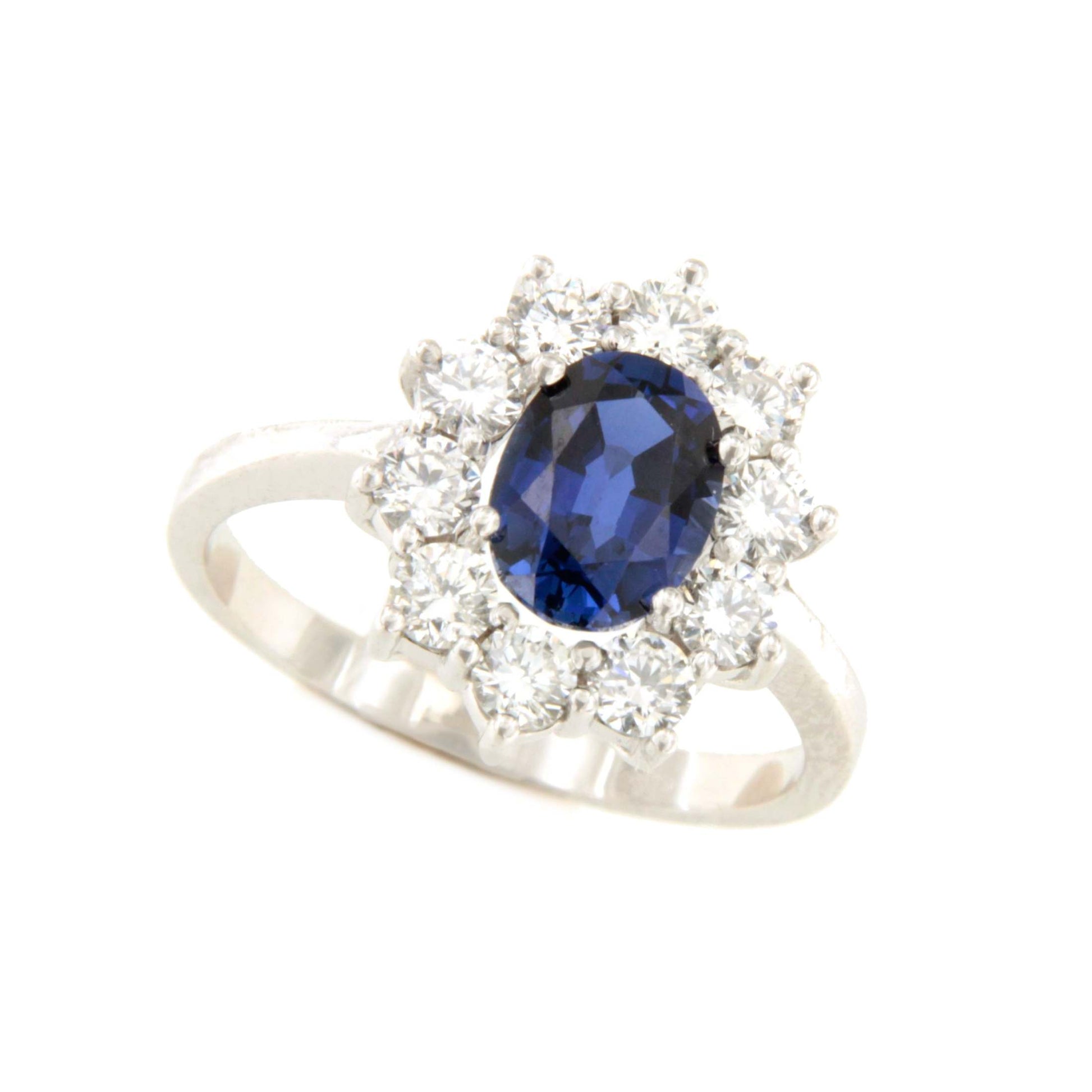 GALES, es un anillo ideal, con un centro en rubí/zafiro y brillantes en tipo roseta, un clásico de la realeza inglesa e ideal para pedidas de mano. Está realizada en oro blanco de 18 kilates.